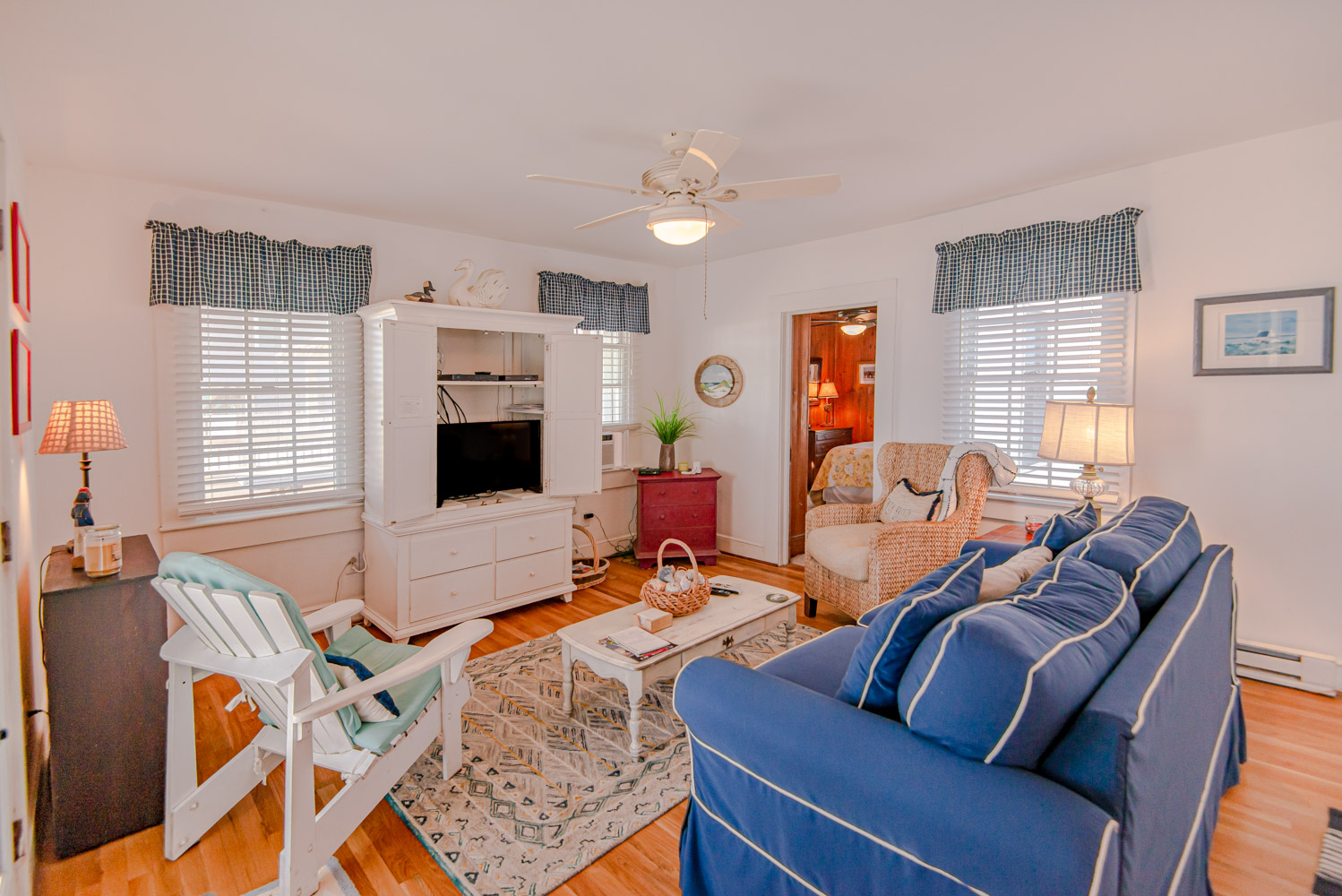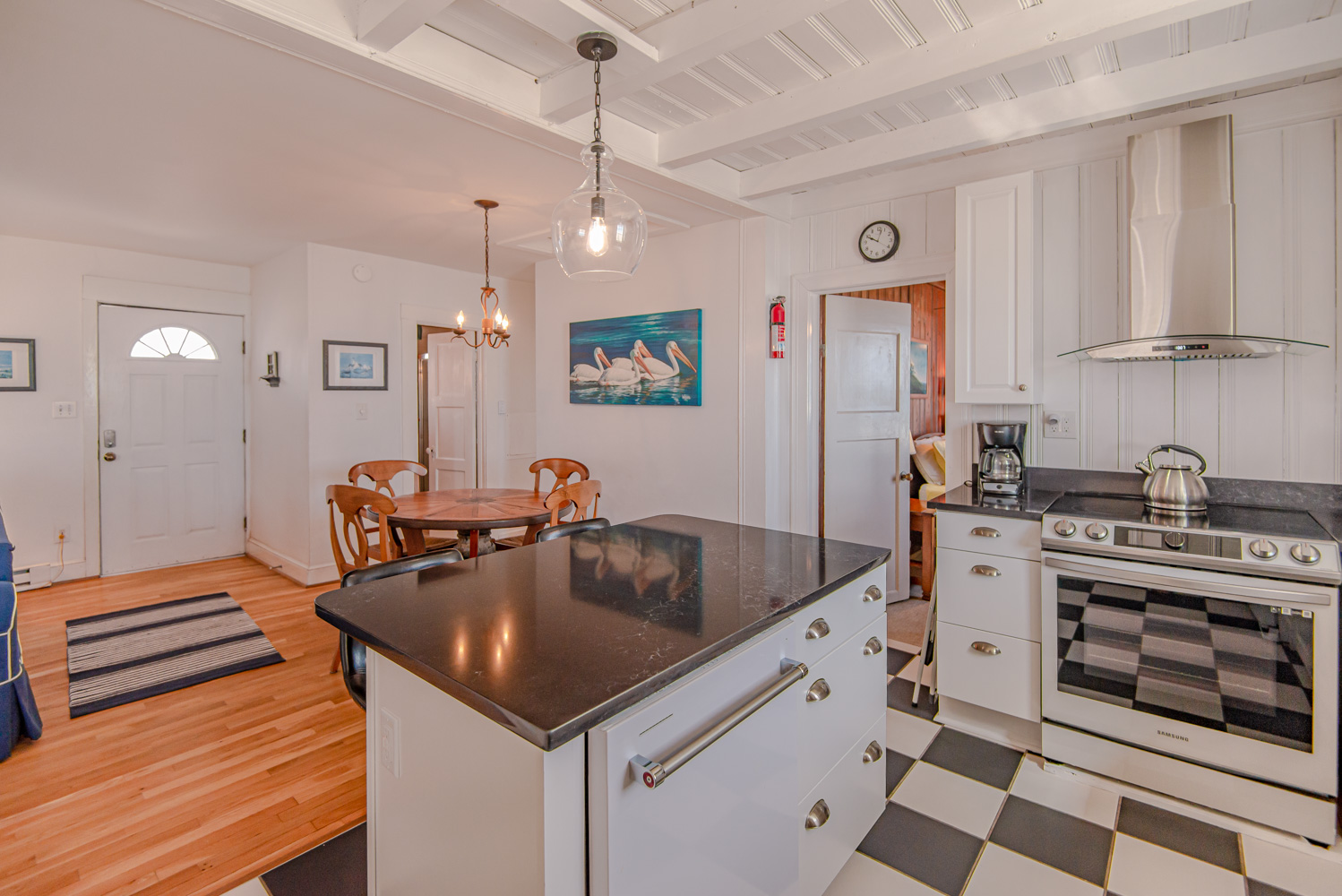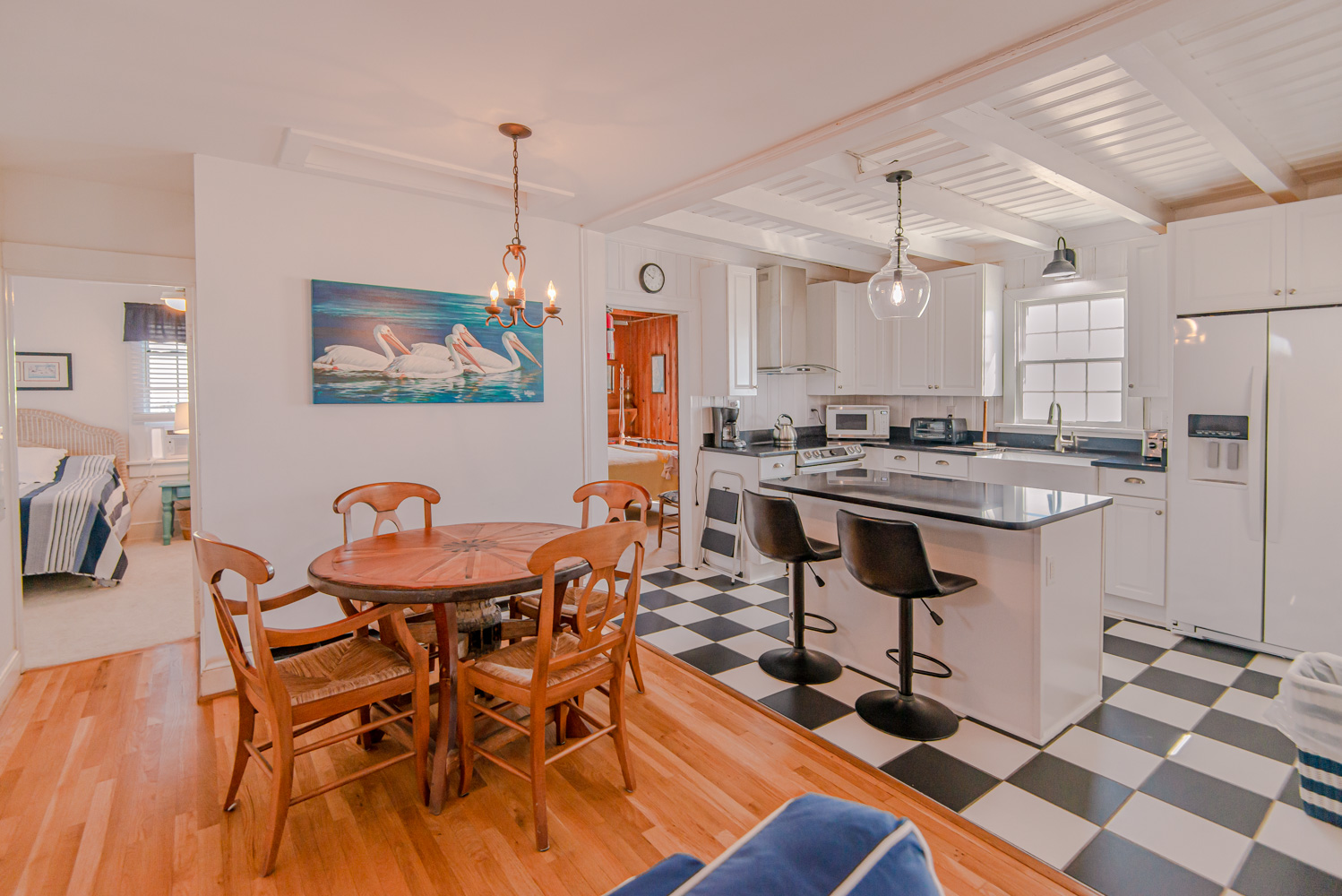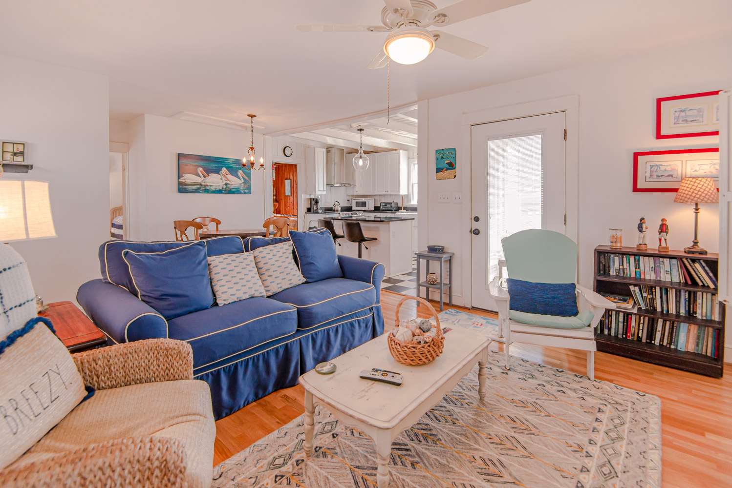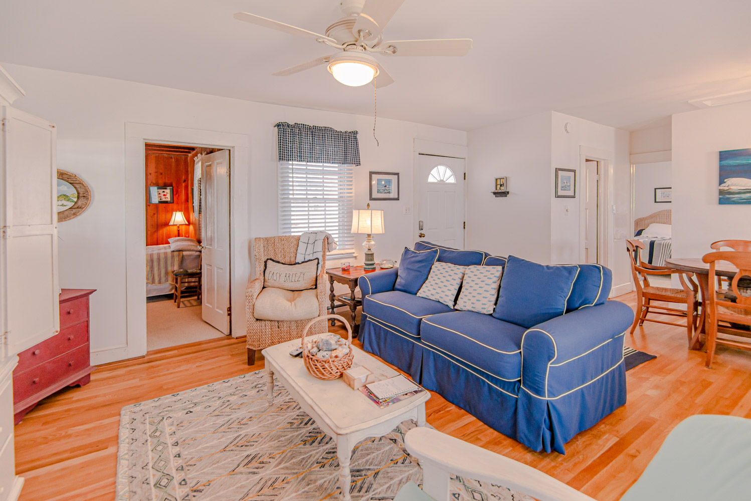 Main Level: Living Area, Roku Smart TV, DVD; Dining Area, Kitchen Area w/Island Bar Seating; 3 Bedrooms (1 w/Queen, 1 w/2 Doubles, 1 w/Double); Full Hall Bath w/Shower; Screen Porch, Deck Furniture, Porch Swing, Picnic Table, Enclosed Outside Shower, Oceanfront Sun Deck w/Chairs, Gate, and Steps to Beach.