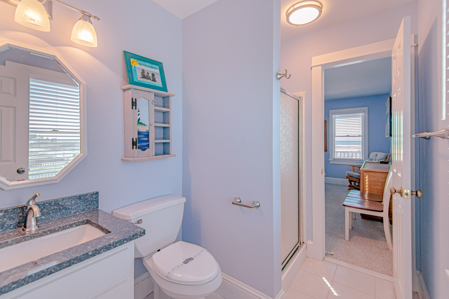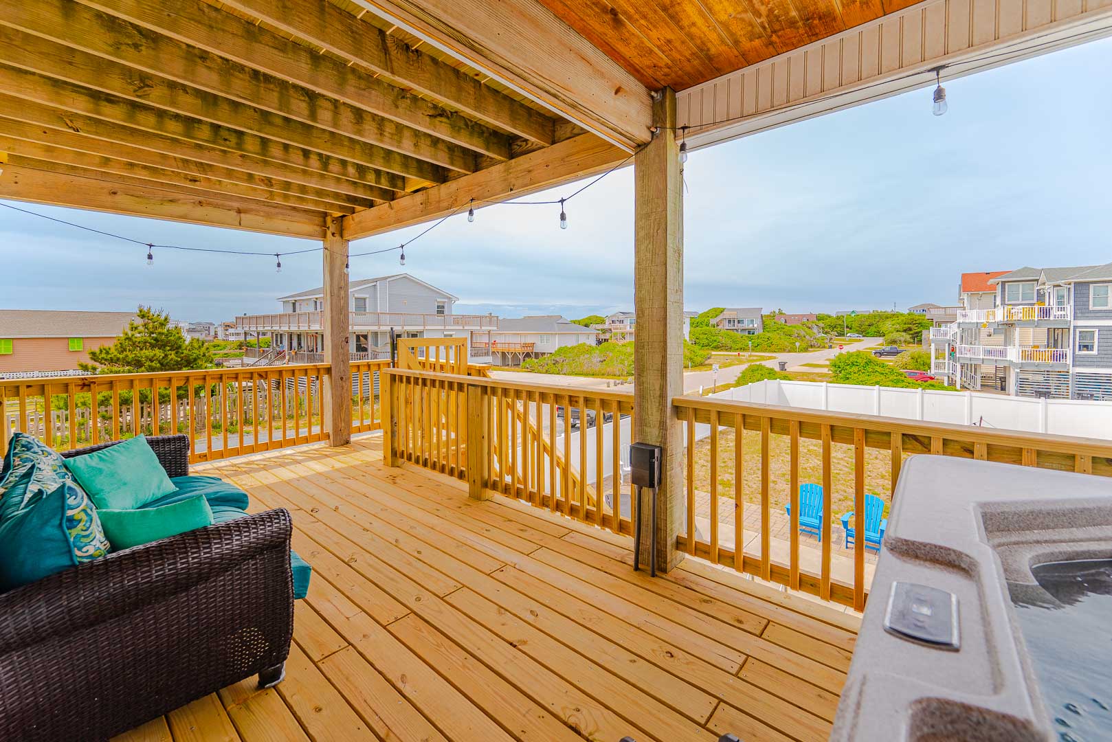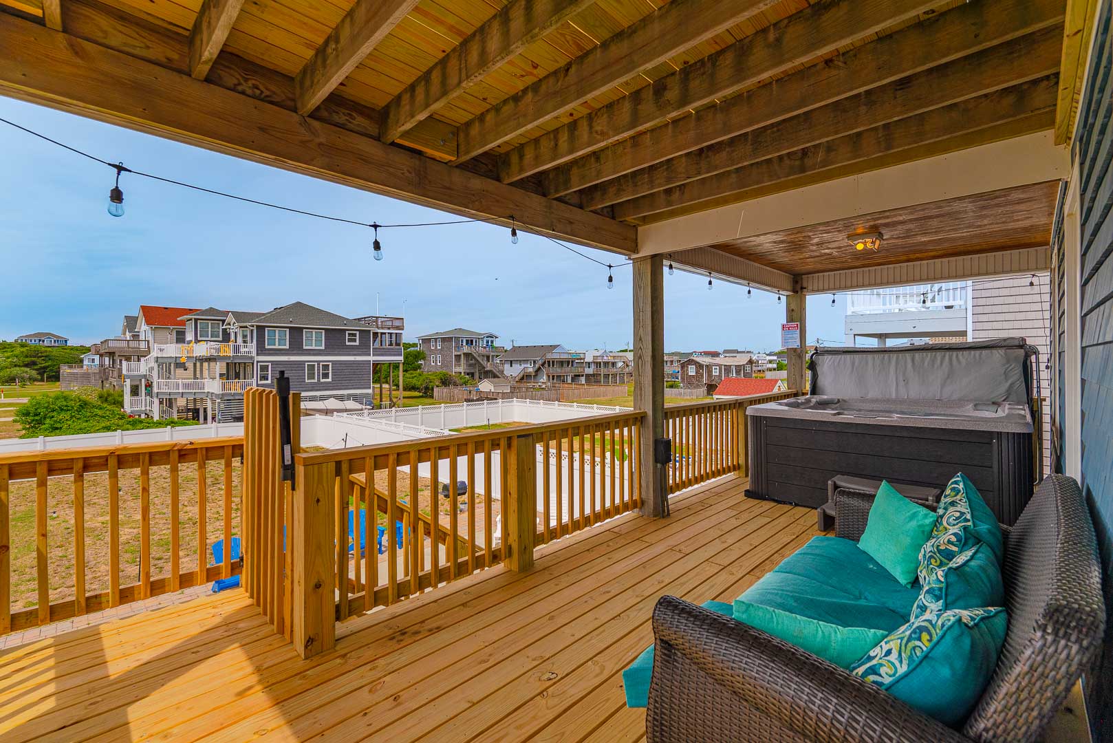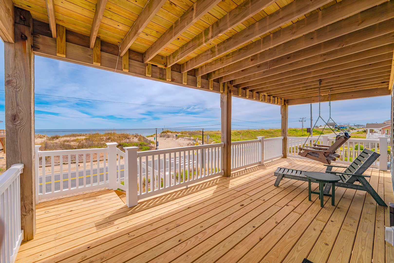 Mid Level: 3 Bedrooms (1 w/King, Smart TV, 1 w/Duo Bunk, Bunk Set, Smart TV, Jack-n-Jill Full Bath w/Walk-in Shower; 1 w/Queen, Smart TV), Full Hall Bath w/Tub/Shower, West Side Covered Deck w/Hot Tub, and Ocean Facing Covered Deck w/Deck Furniture, Double Seat Hammock Swing, and Great Ocean Views.