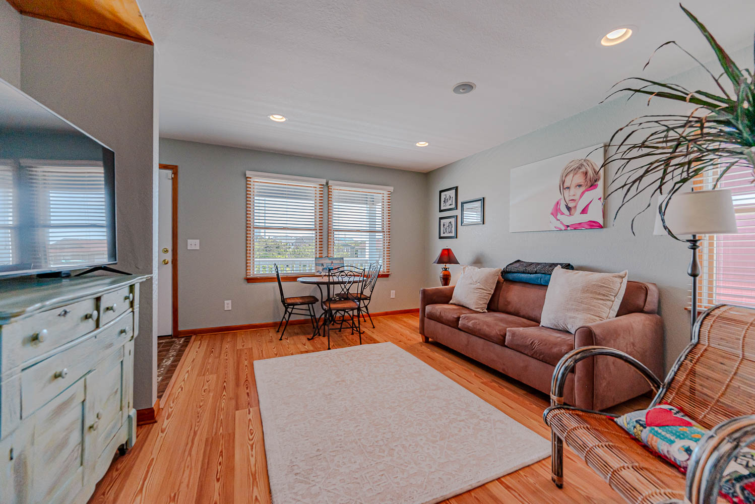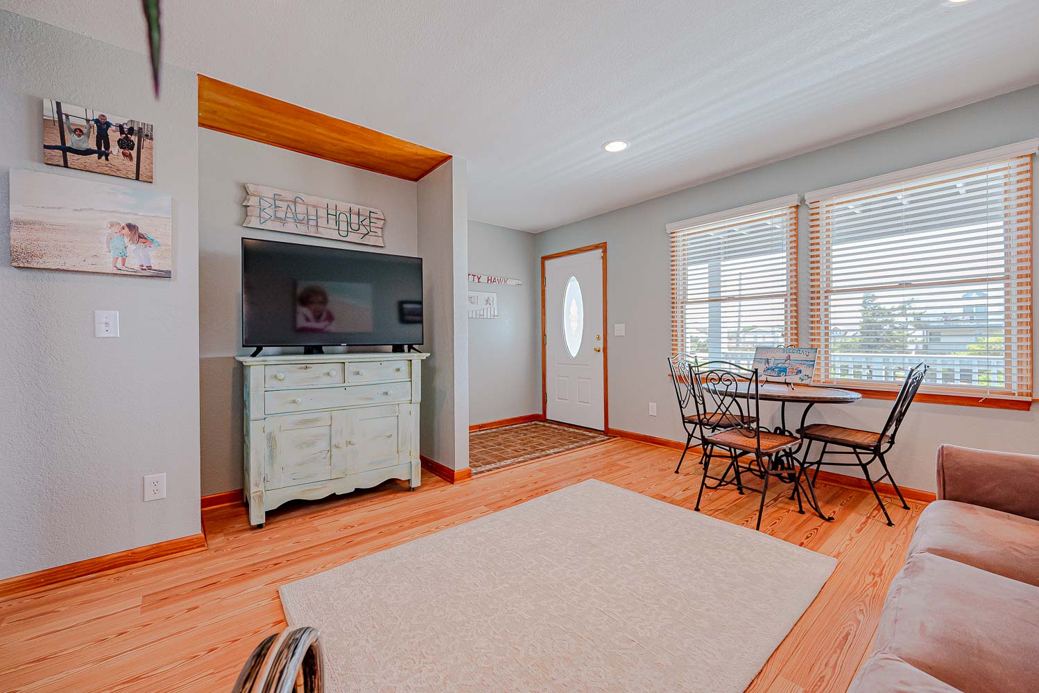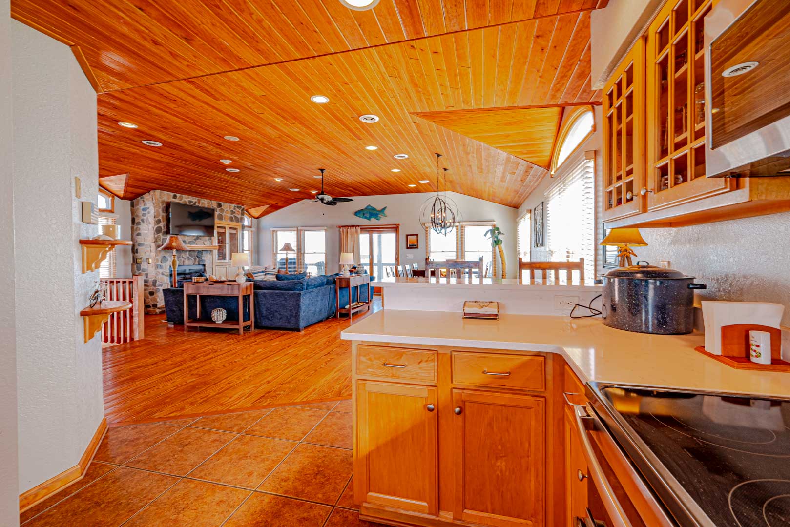 Top Level: Spacious Living/Dining/Kitchen Area Accented by Lovely Hardwood Flooring, Cypress Tongue & Groove Cathedral Ceiling, & a Unique Stone Fireplace, 42 Inch Plasma TV, Entertainment System, Endless Ocean Views, Private Suite w/King & Full Bath, Powder Room, 2 Covered Decks.