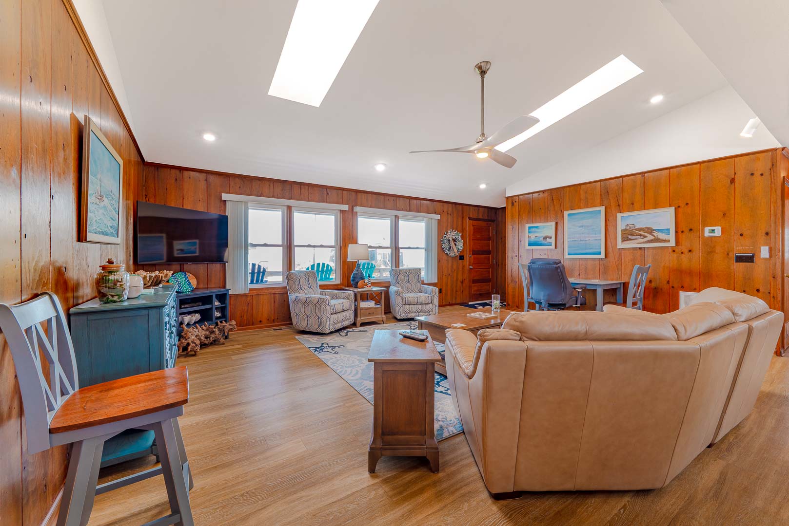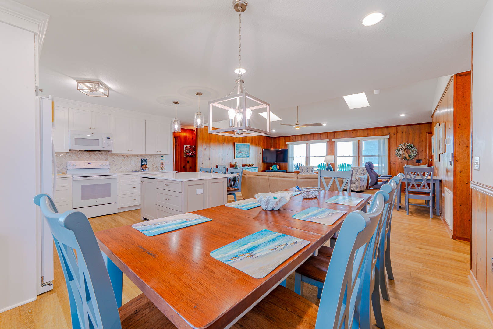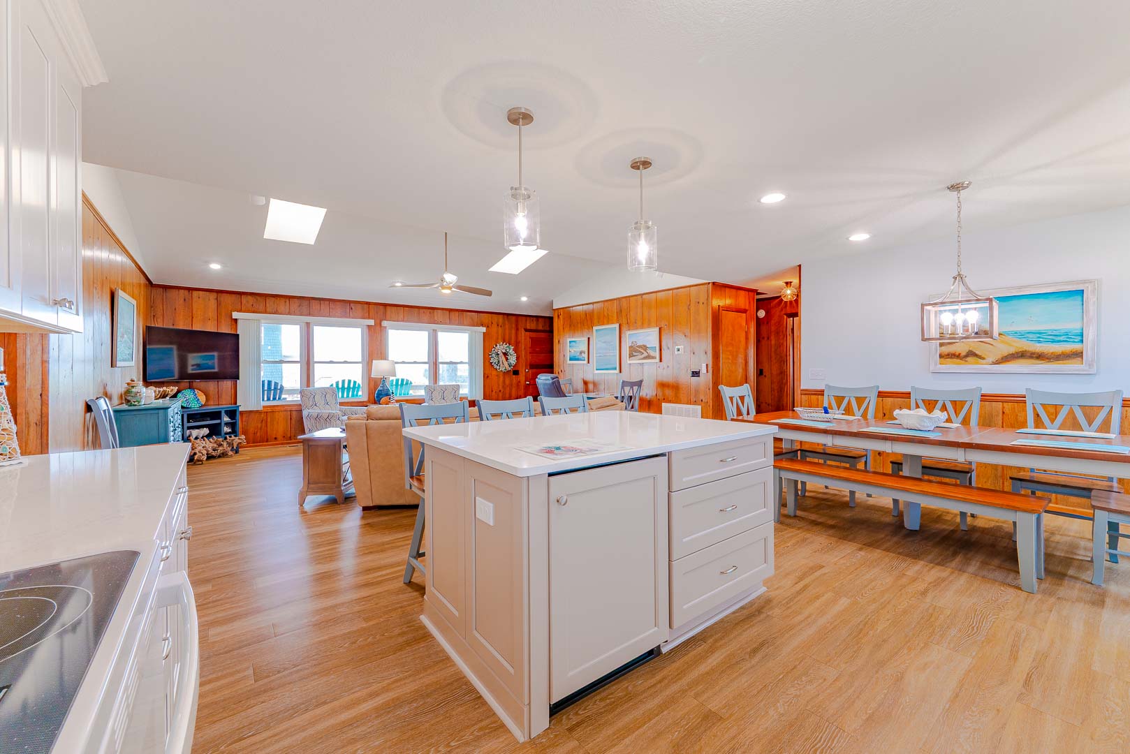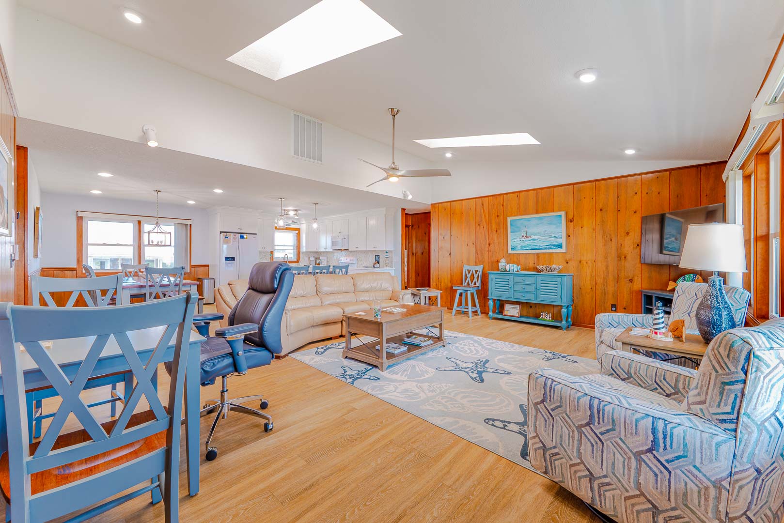 Main Level: Spacious Living Area, TV, Ocean Views, Beautiful Flooring Throughout; Kitchen Area, Island Bar w/Seating; Dining Area w/Seating for Eight (8); 4 Bedrooms (2 w/Queens, TV, Shared Full Hall Bath w/Tub/Shower; 1 w/Queen, 1 w/2 Singles, Shared Full Hall Bath w/Tub/Shower), Covered & Sun Deck w/Ocean Views & Deck Furniture.
