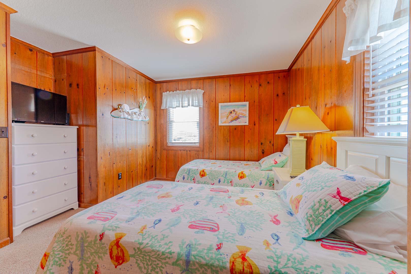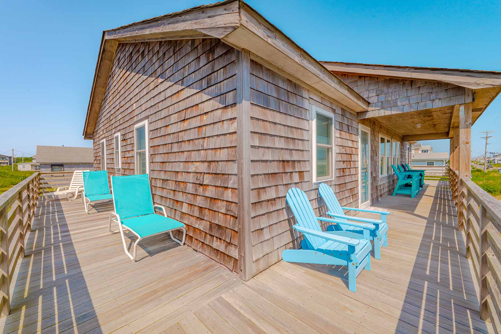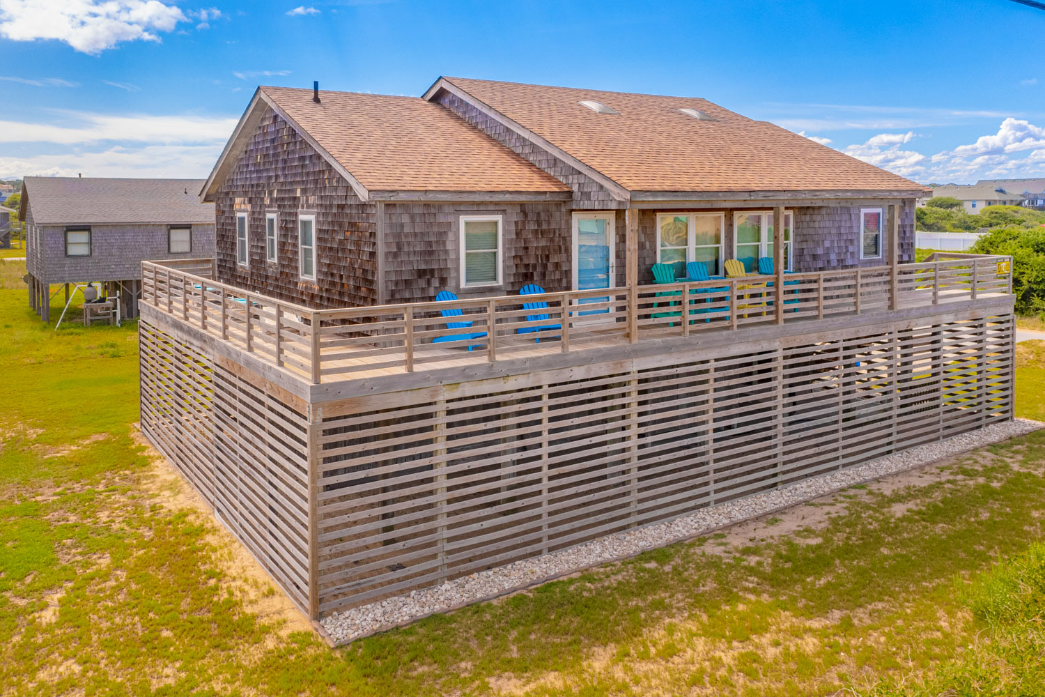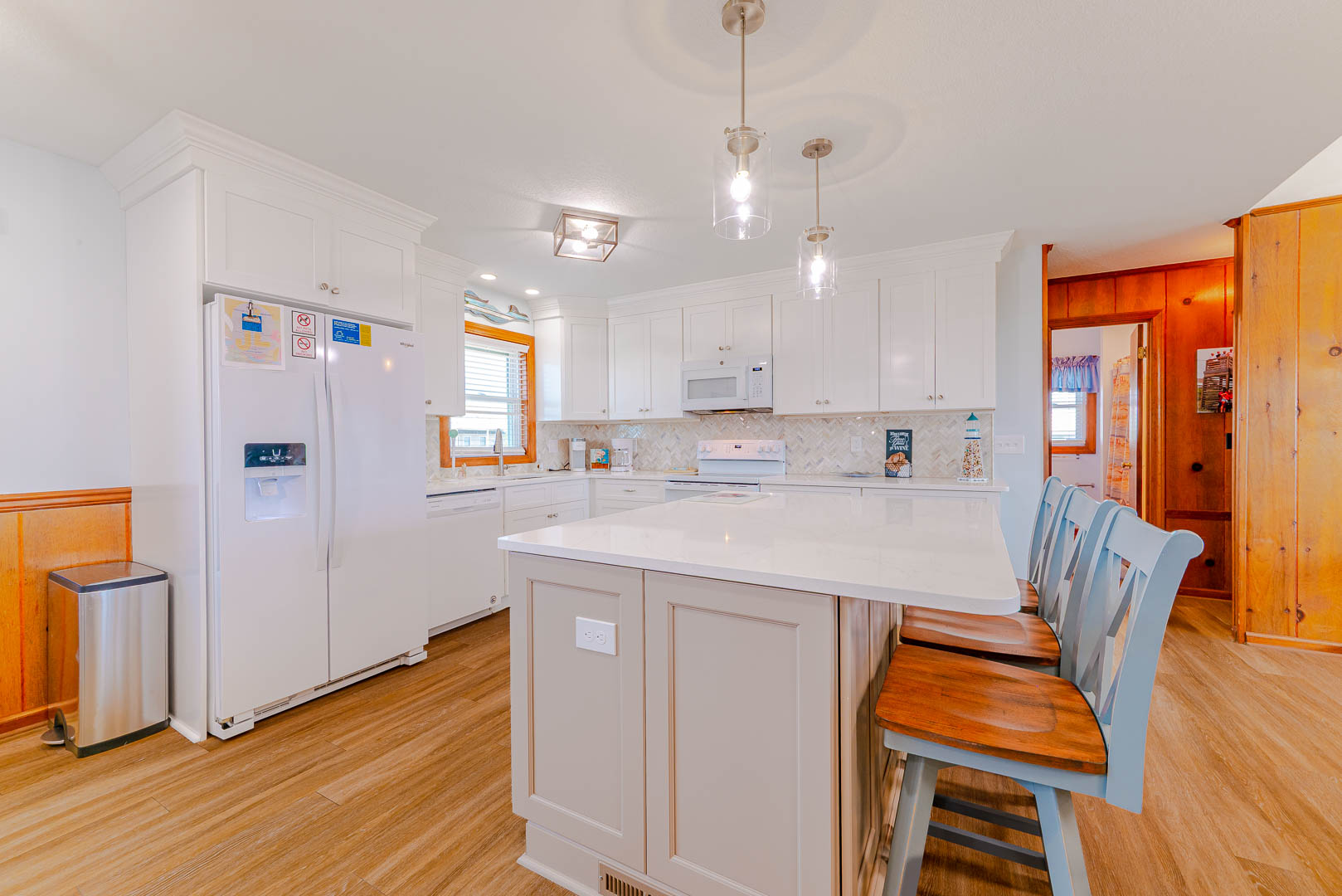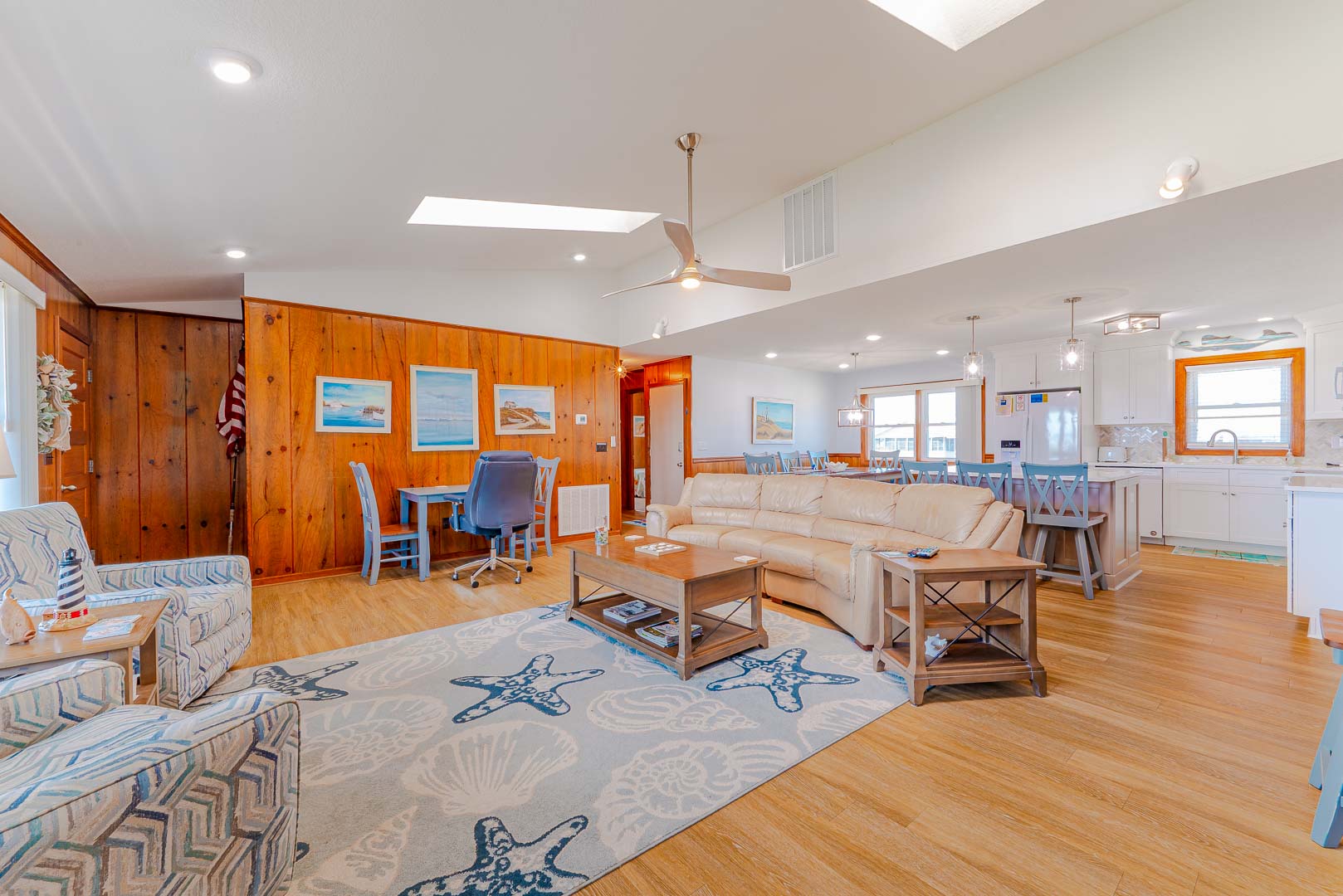 Main Level: Spacious Living Area, TV, Ocean Views, Beautiful Flooring Throughout; Kitchen Area, Island Bar w/Seating; Dining Area w/Seating for Eight (8); 4 Bedrooms (2 w/Queens, TV, Shared Full Hall Bath w/Tub/Shower; 1 w/Queen, 1 w/2 Singles, Shared Full Hall Bath w/Tub/Shower), Covered & Sun Deck w/Ocean Views & Deck Furniture.