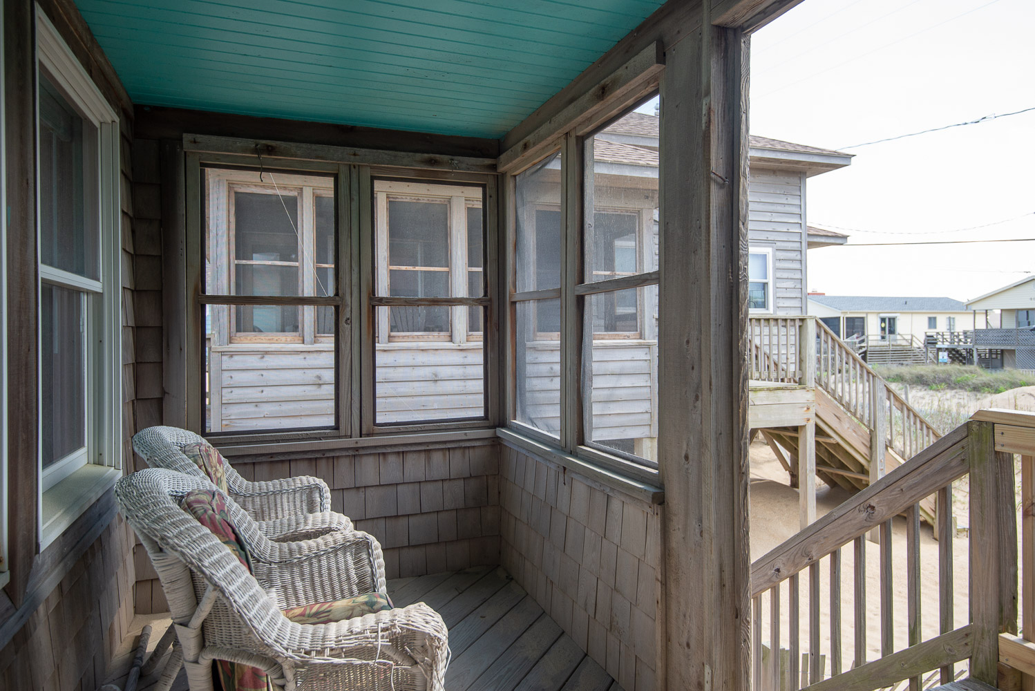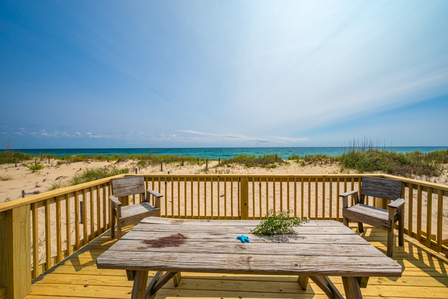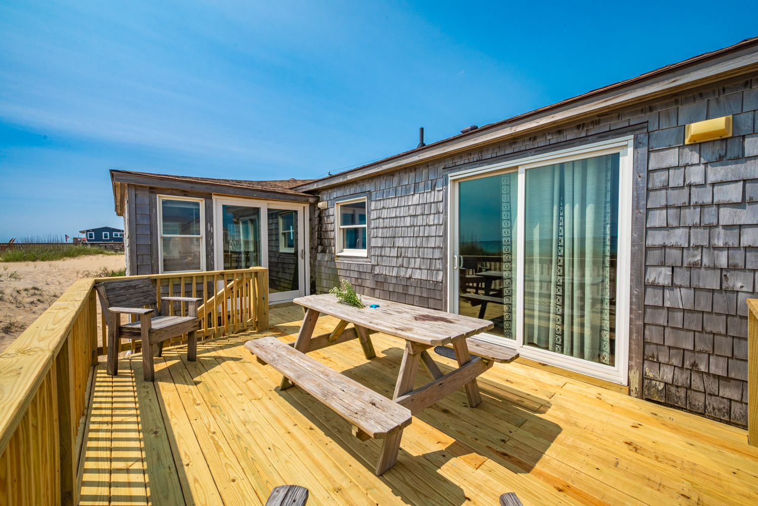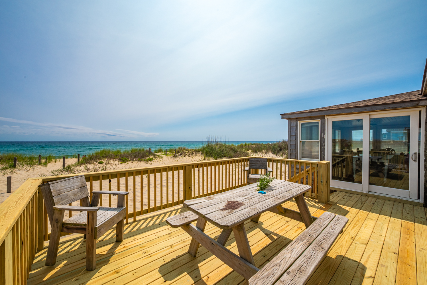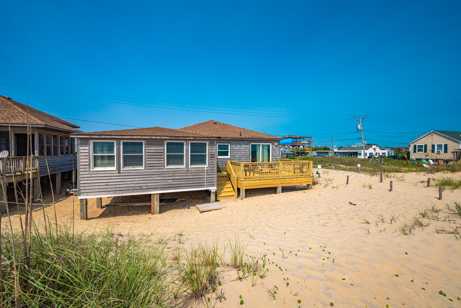 Main Level: Living/Dining/Kitchen Area, 50 Inch TV, Oceanfront Dining Room, 4 Bedrooms (1 w/Queen; 1 w/Double; 1 w/2 Singles, Cot; 1 w/2 Singles), 2 Full Baths, and Sun Deck w/Deck Furniture, Panoramic Ocean Views, Outside Shower, and Steps to Beach.