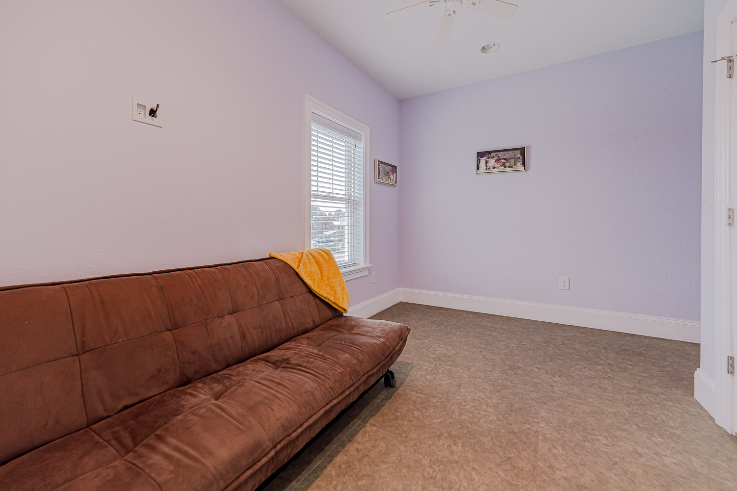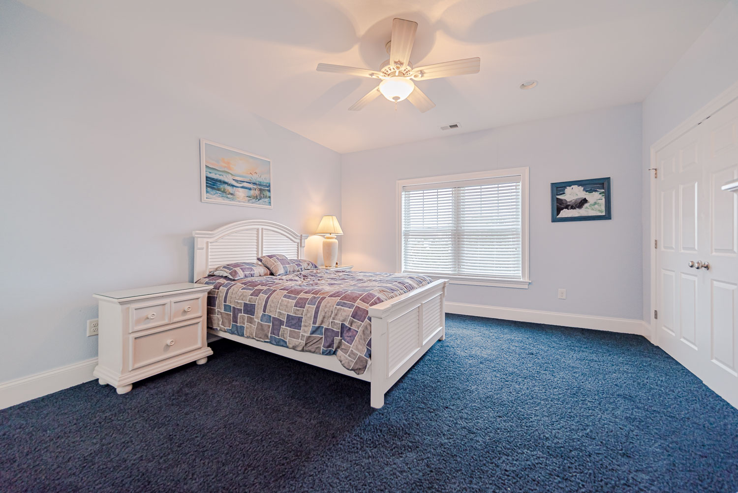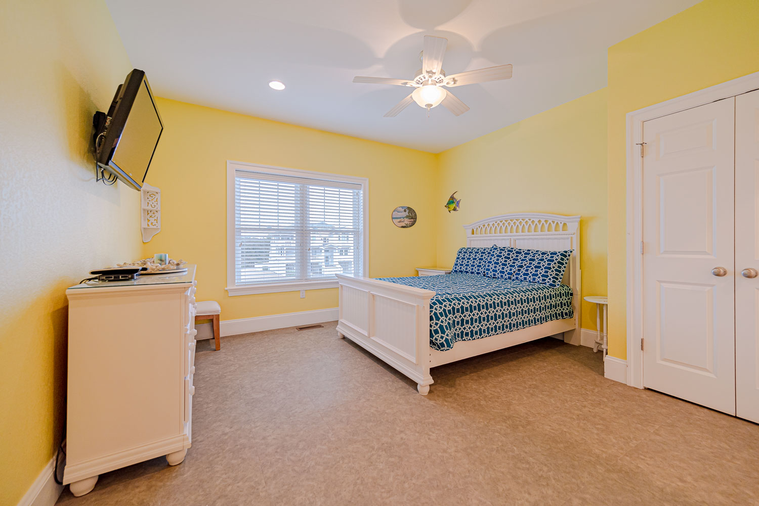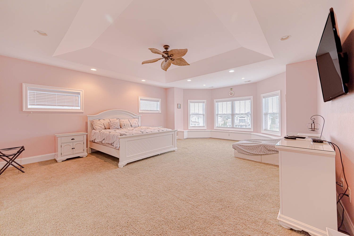 Top Level: 3 Bedrooms (Colossal Private Suite w/King, TV, Full Bath, Built-In Window Seats w/Horizon Ocean Views; 2 w/Queens, TVs) & Shared Full Bath.
