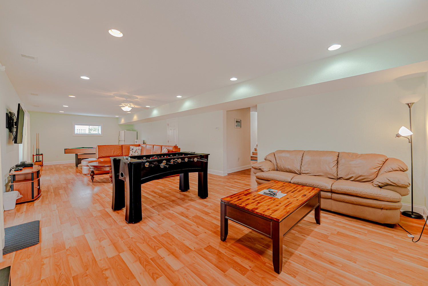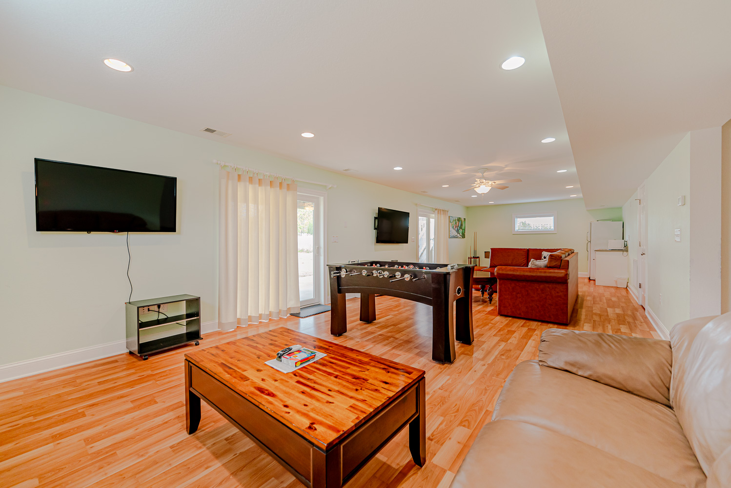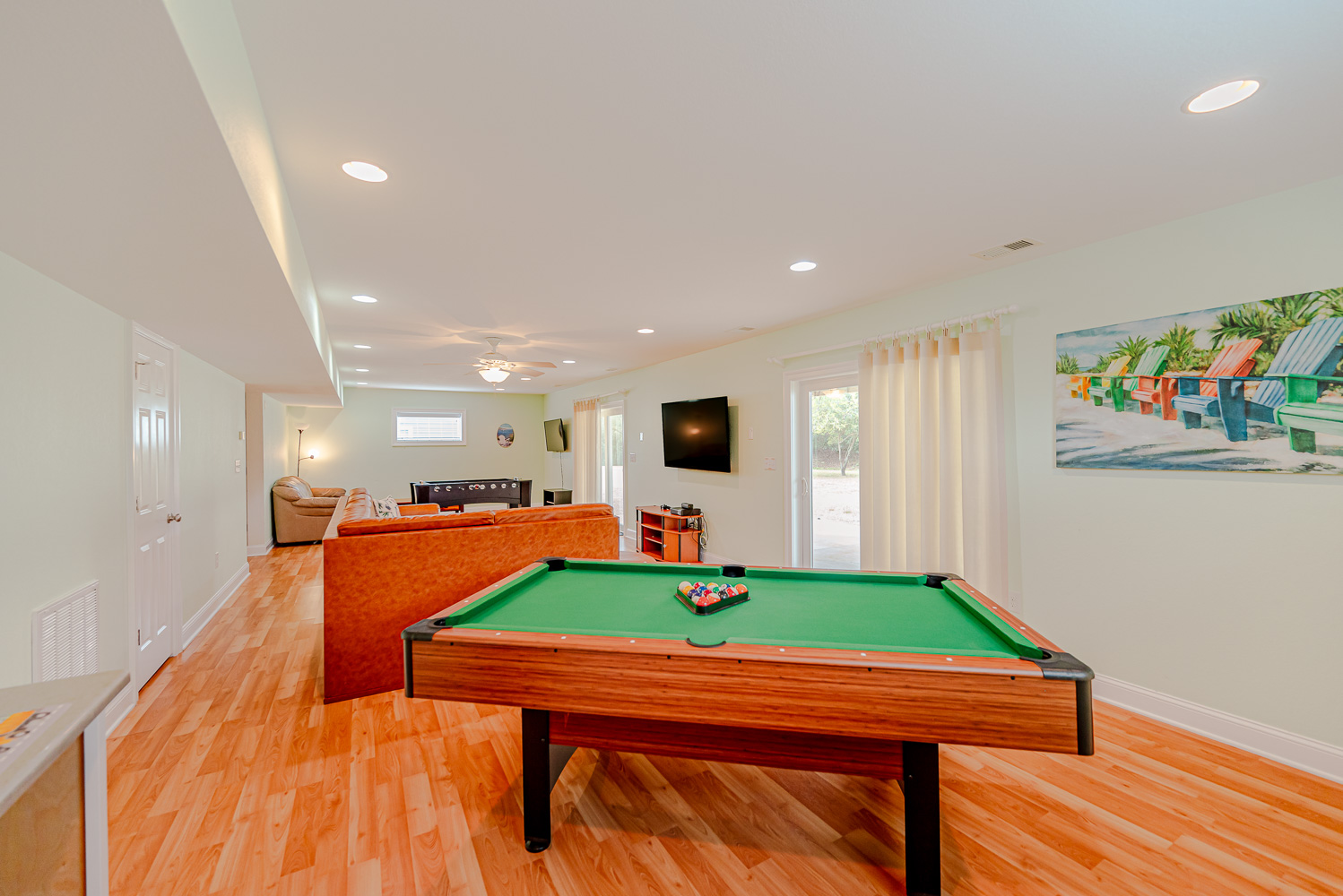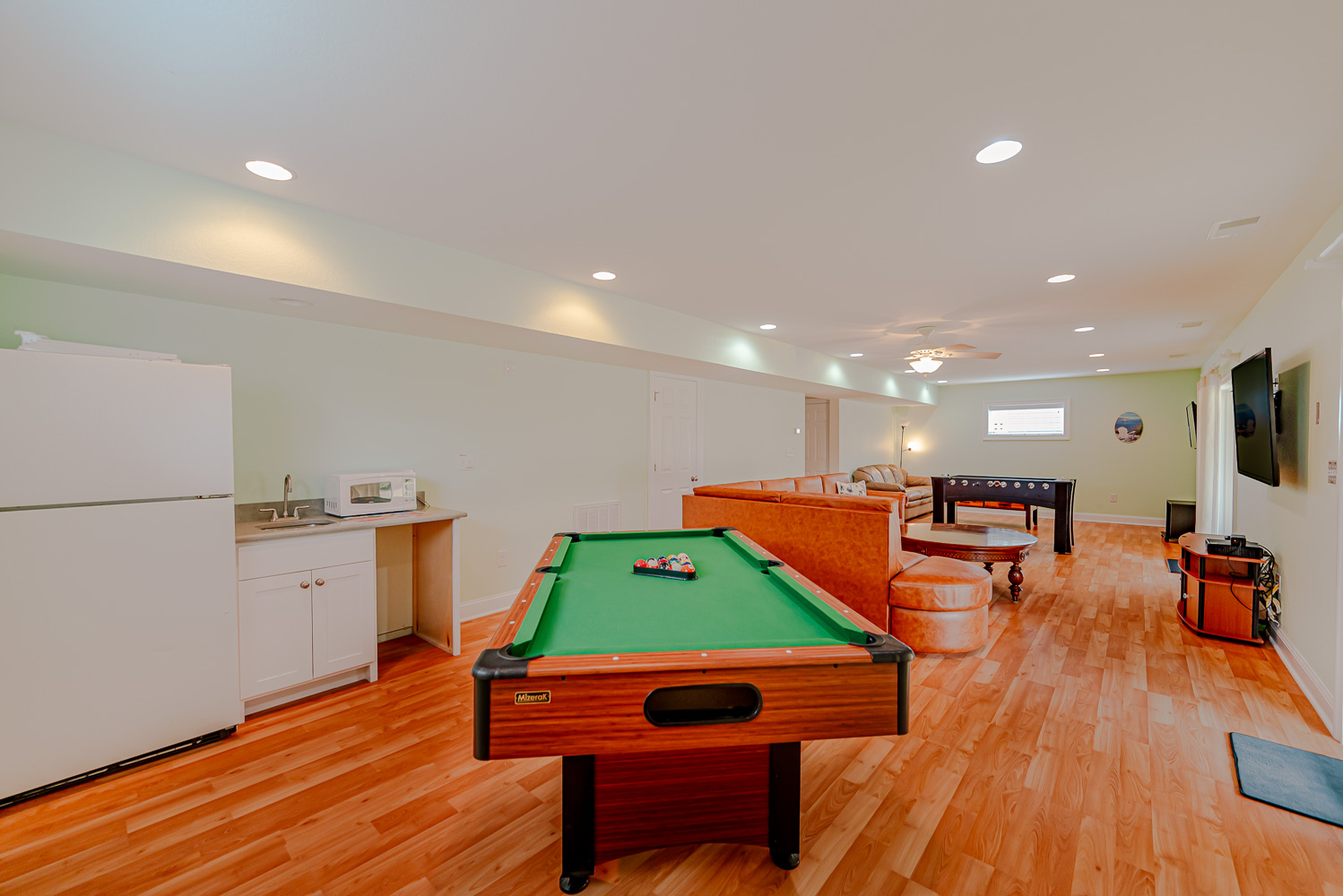 Ground Level: Parking for 5 Cars, Steps to Covered Entry, Garage w/Ramp Entry, Elevator, Rec. Room w/Pool Table, Foosball Table, TV, Wet Bar, Full Size Refrigerator, Bedroom w/Queen, Full Hall Bath, Laundry Area, Access to Covered Deck, Enclosed Outside Shower, & Charcoal Grill.