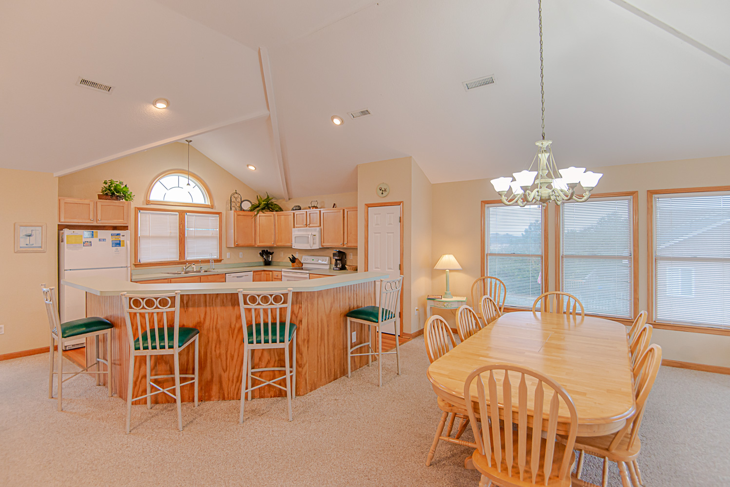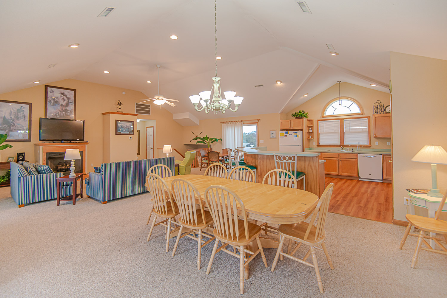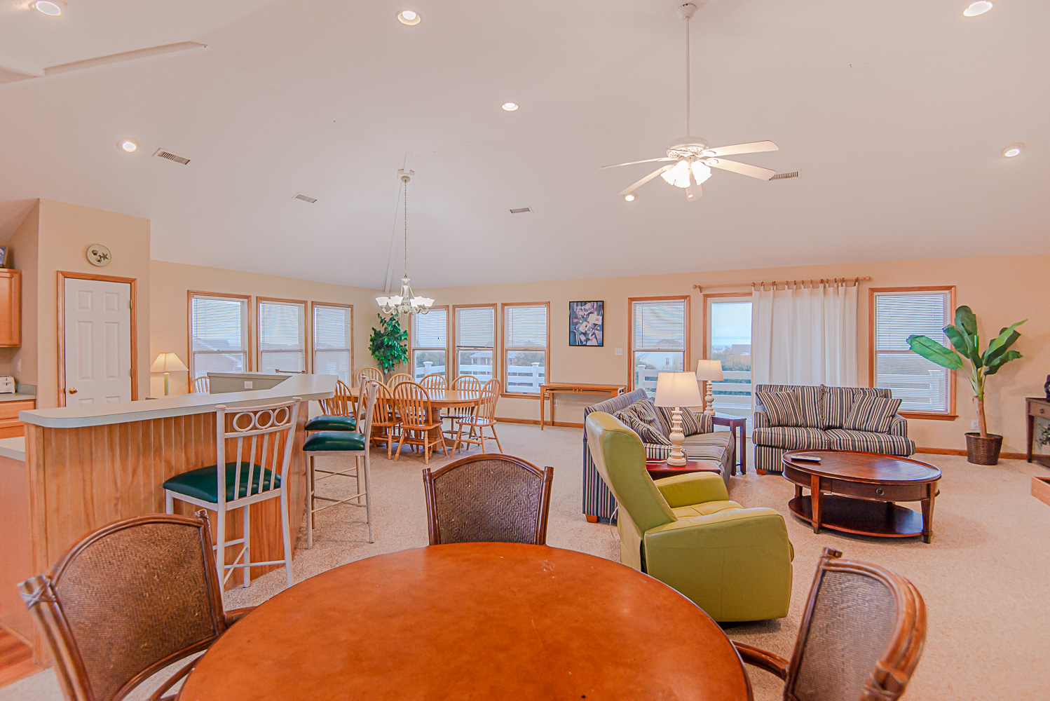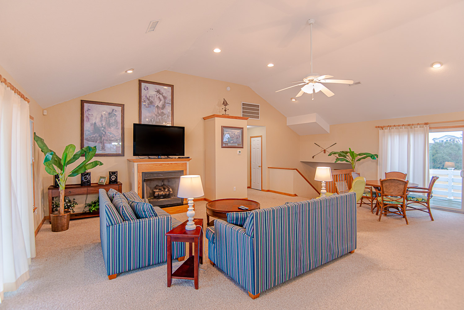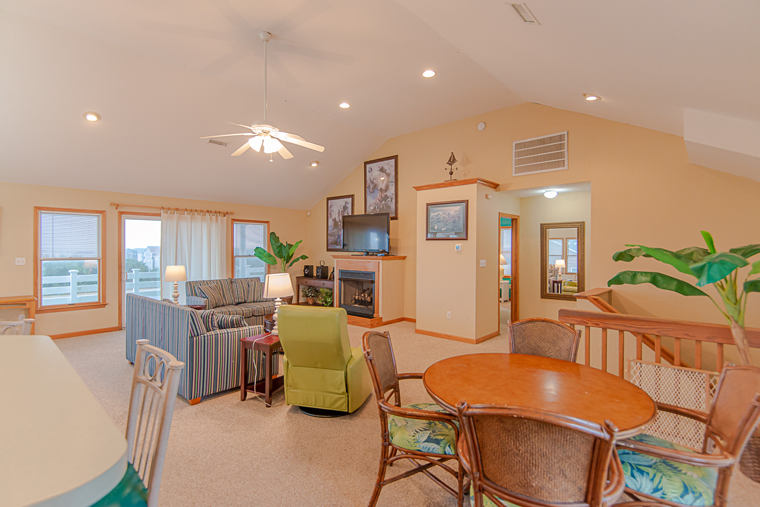 Top Level: Very Well Equipped Living/Dining/Kitchen Areas w/Cathedral Ceilings, Gas Fireplace, TV, Half Bath, Great Ocean & Golf Course Views, Private Suite w/King, TV, & Full Bath w/Jacuzzi, Covered Deck, & Sun Deck.