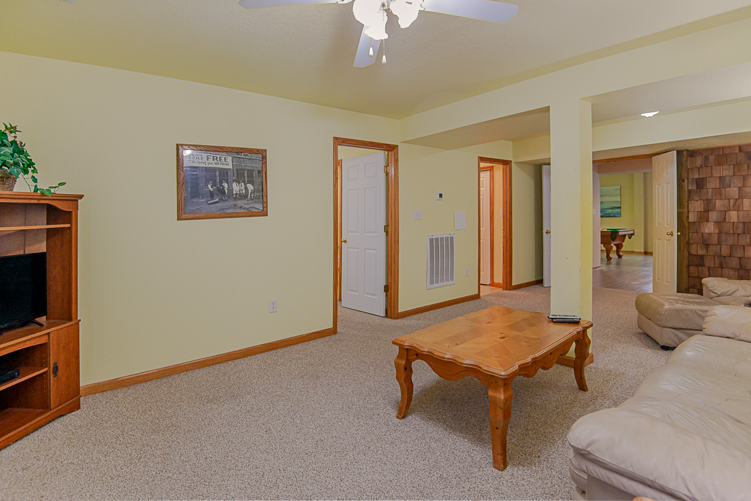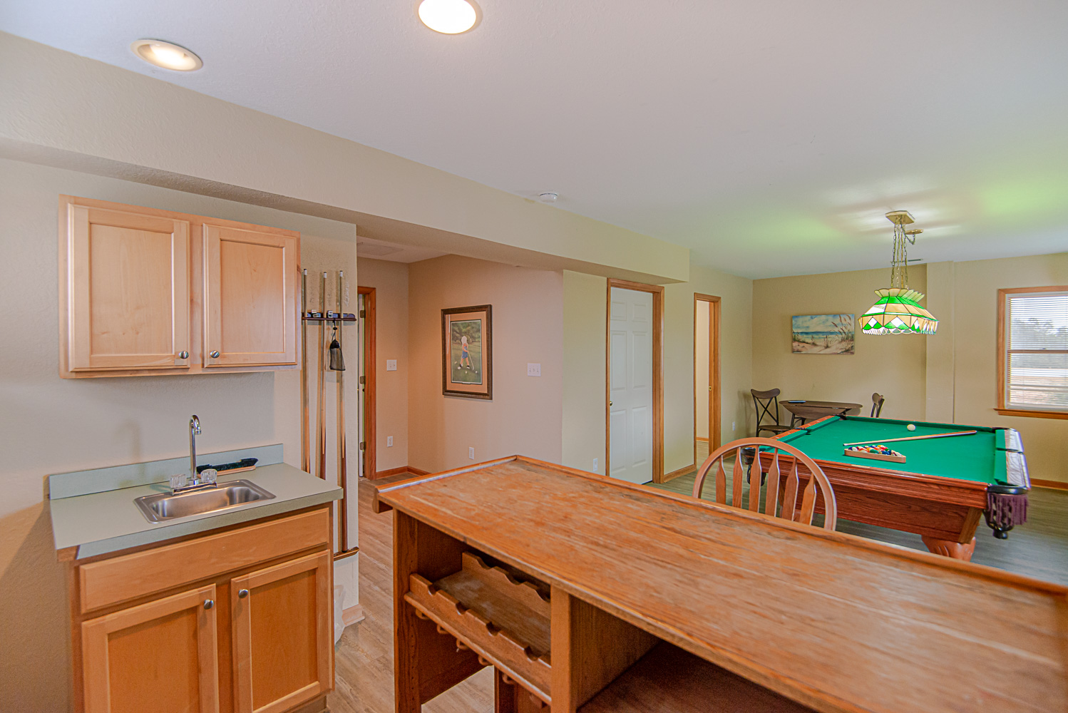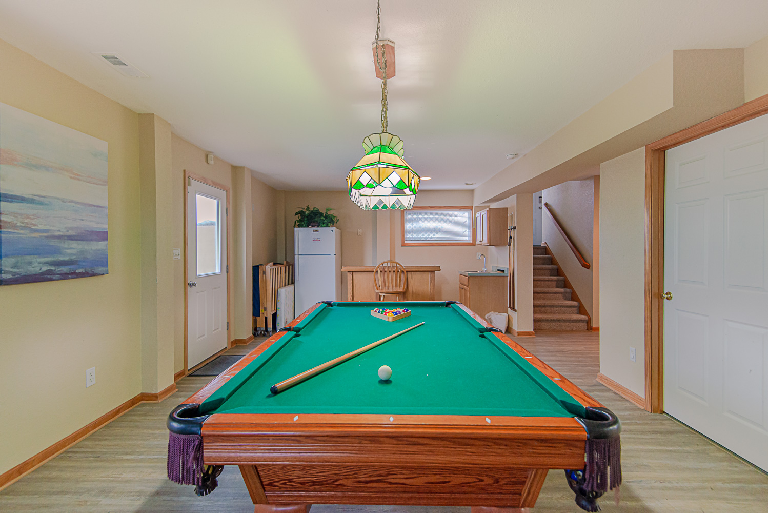 Ground Level: Parking for 4 Cars, Sports Bar/Rec. Room w/Pool Table, TV, Wet Bar, Full Size Refrigerator, Half Bath, Large Den w/TV, Bedroom w/King, TV, & Full Bath, Access to Patio Area w/Private 12 x 28 Swimming Pool - Open Seasonally , Hot Tub, Enclosed Outside Shower, & Charcoal Grill.