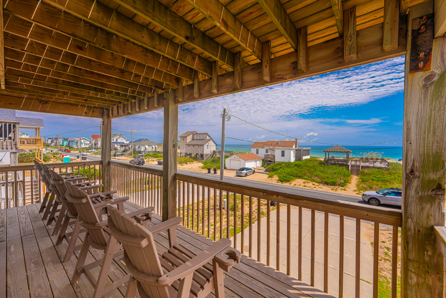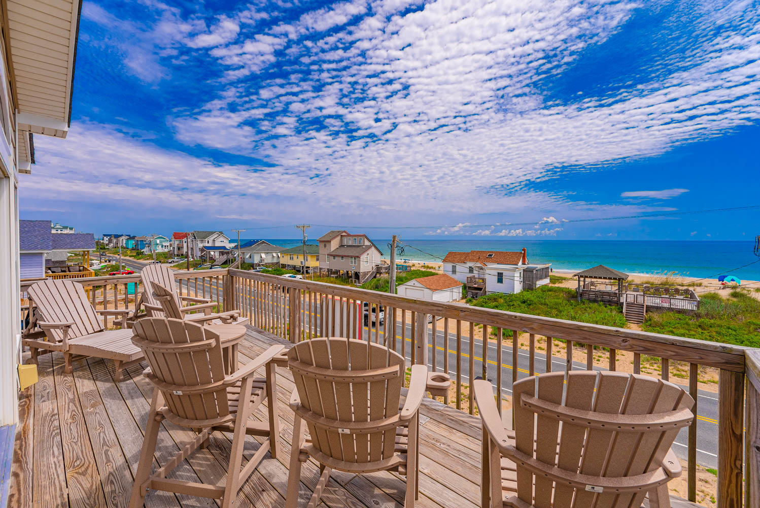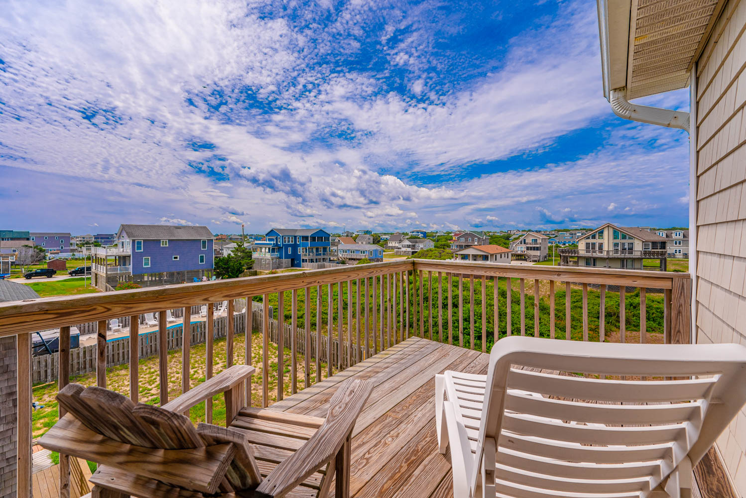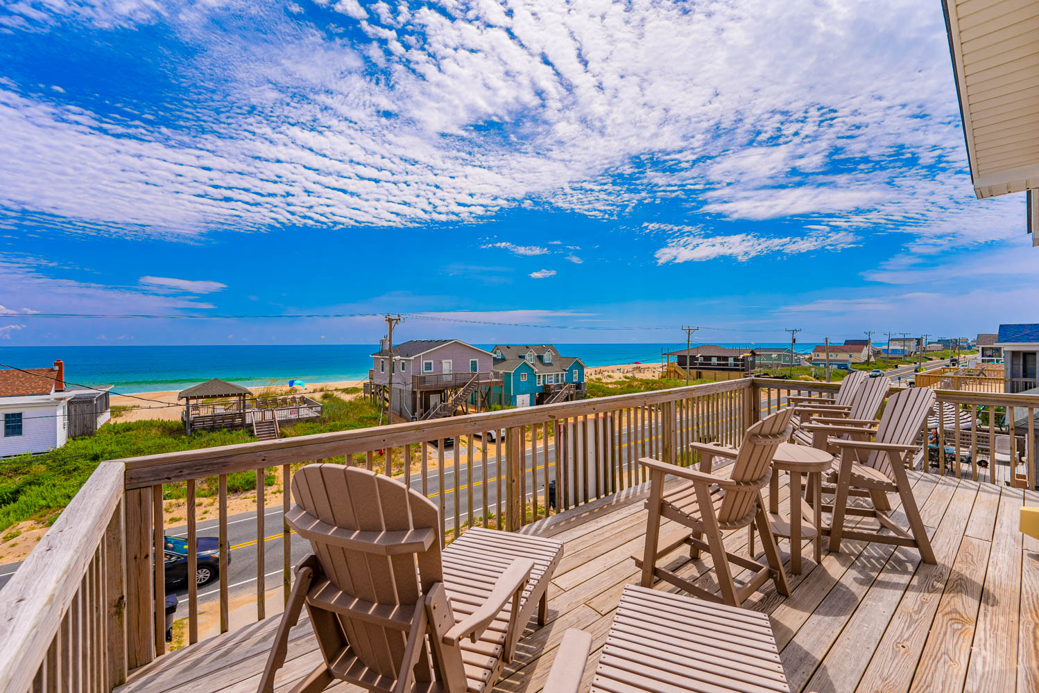 Top Level: Living/Dining/Kitchen Area, Cathedral Ceiling, Smart TV, DVD, Great Ocean Views, Private Suite w/King, TV, Full Bath w/Jacuzzi Tub, Half Bath, Sun Deck w/Furniture, Fantastic Ocean Views, and Sun Deck Overlooking Pool Area.
