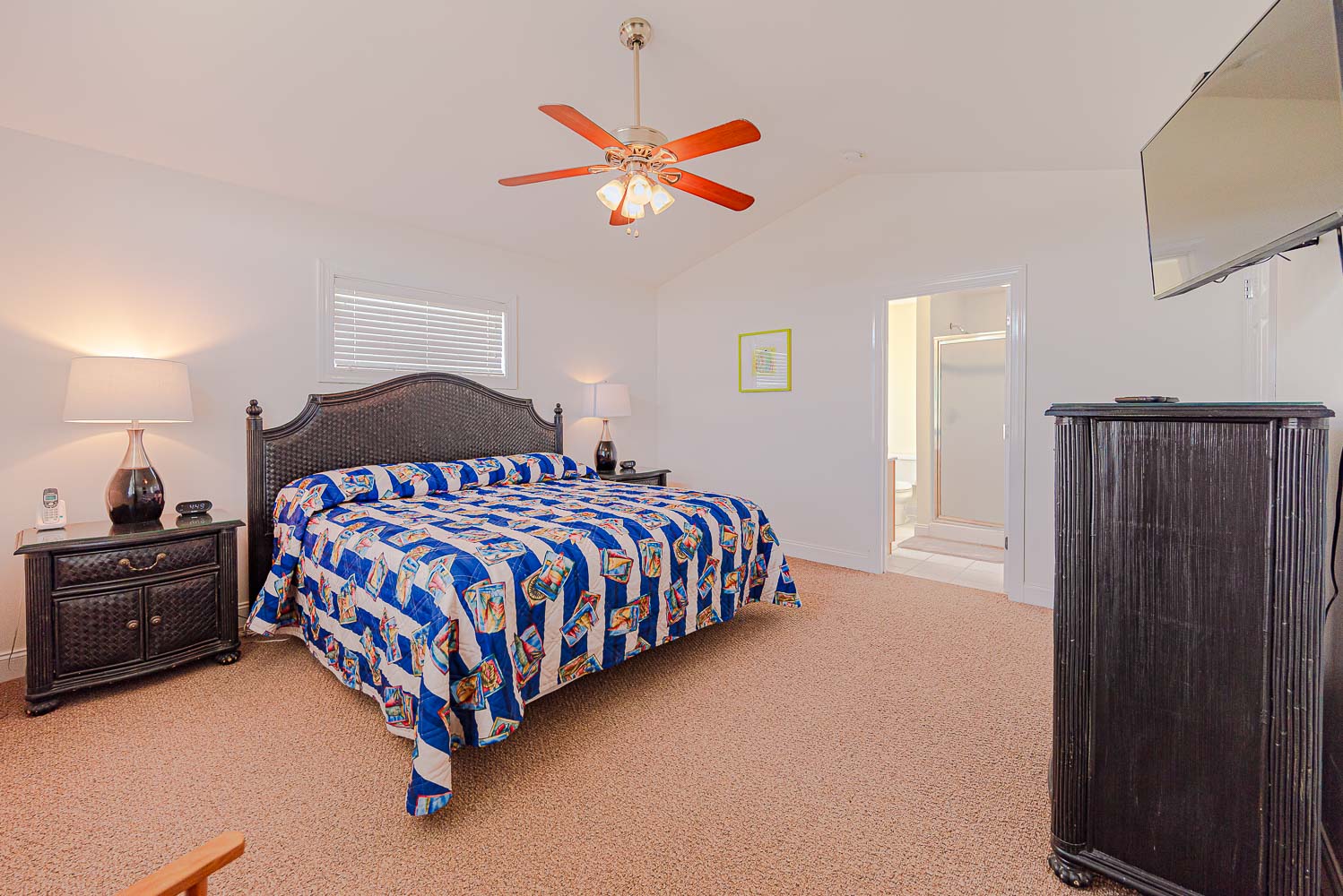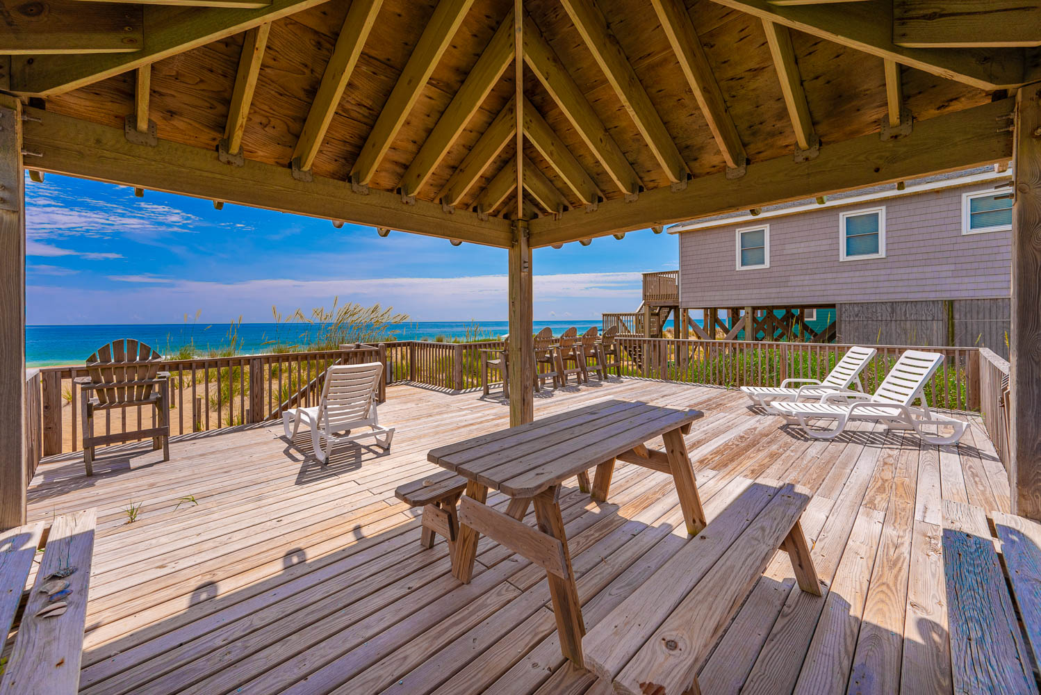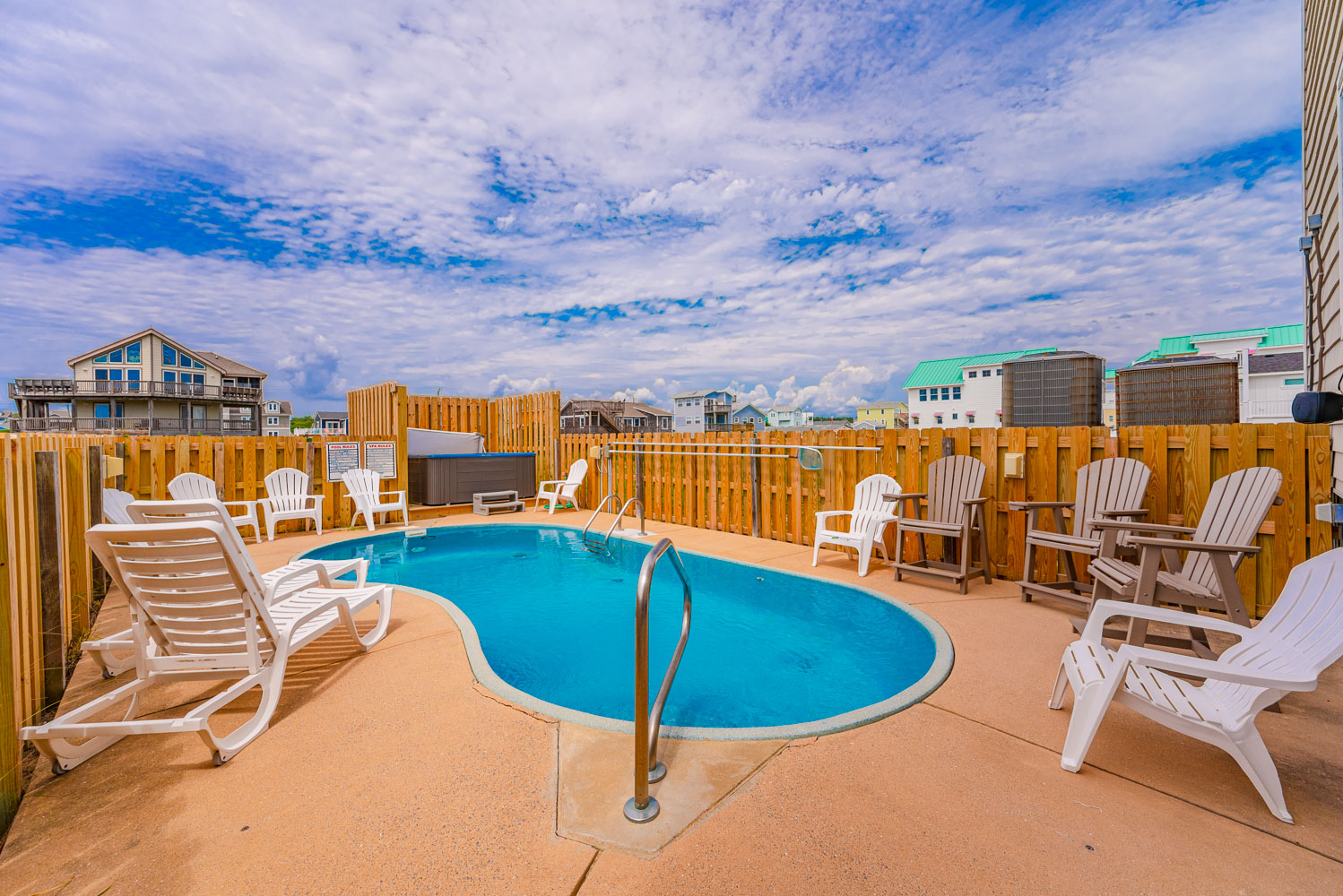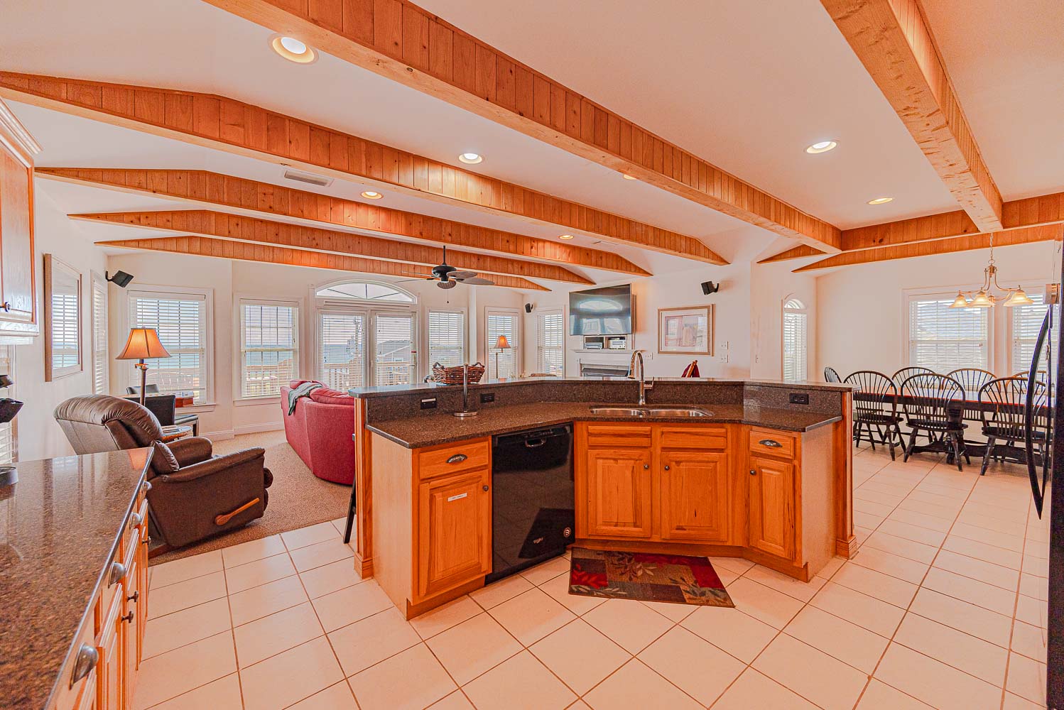 Top Level: Living/Dining/Kitchen Area, Cathedral Ceiling, Smart TV, DVD, Great Ocean Views, Private Suite w/King, TV, Full Bath w/Jacuzzi Tub, Half Bath, Sun Deck w/Furniture, Fantastic Ocean Views, and Sun Deck Overlooking Pool Area.