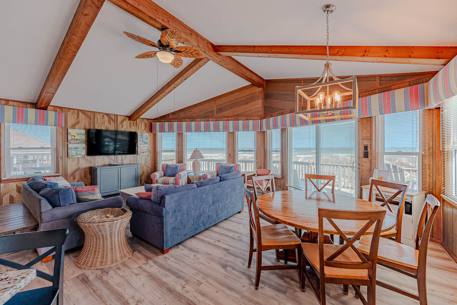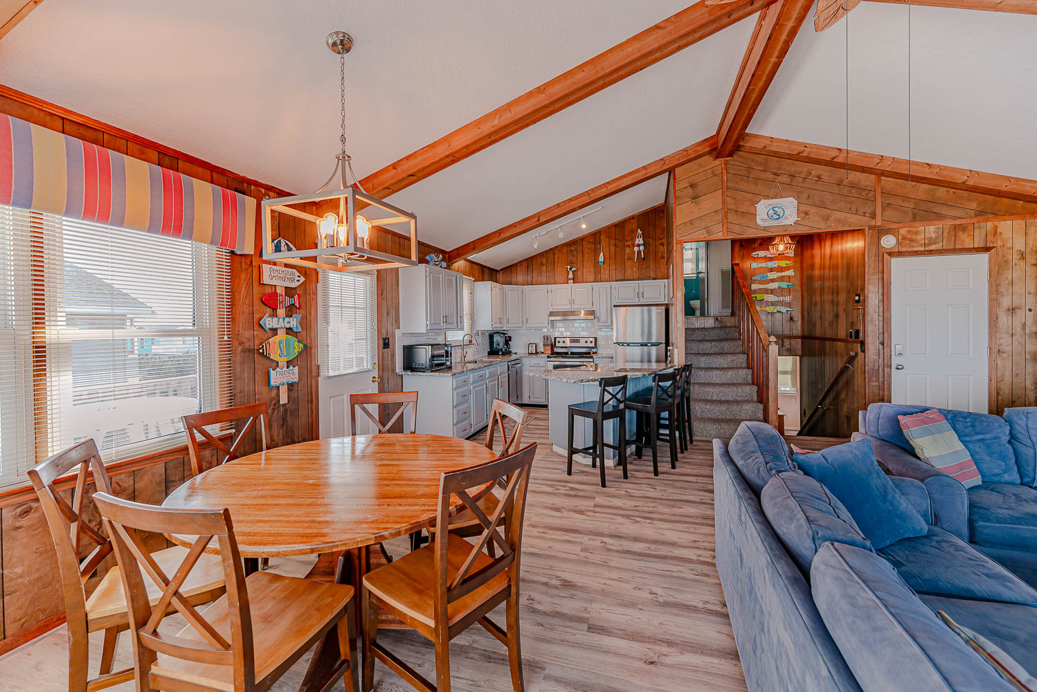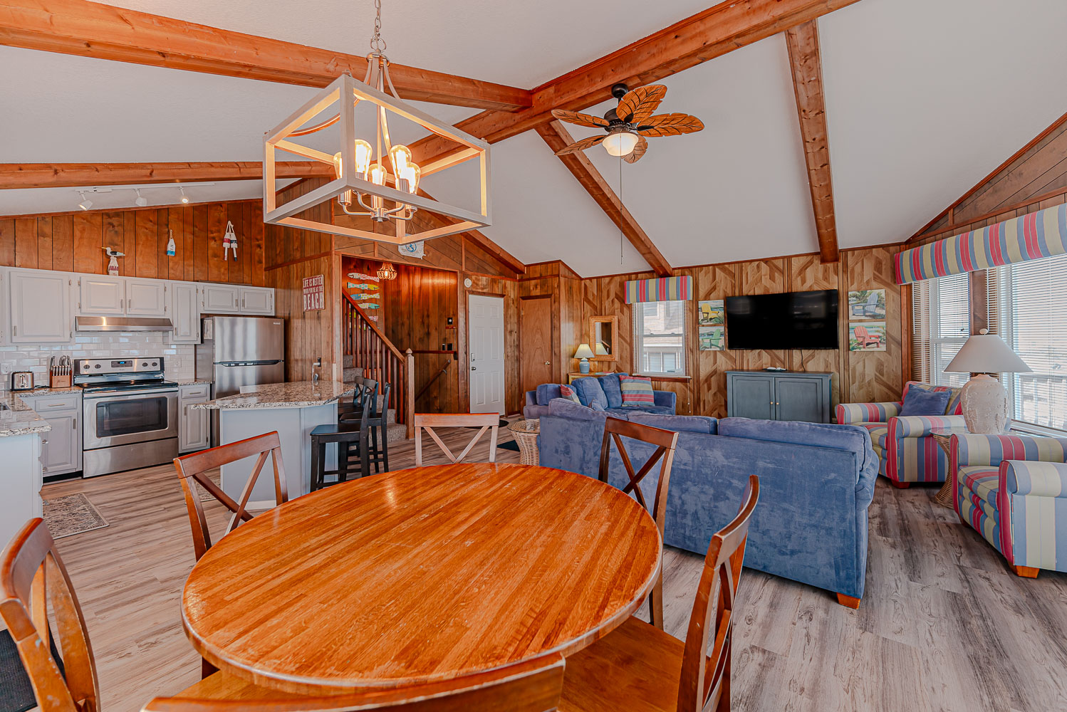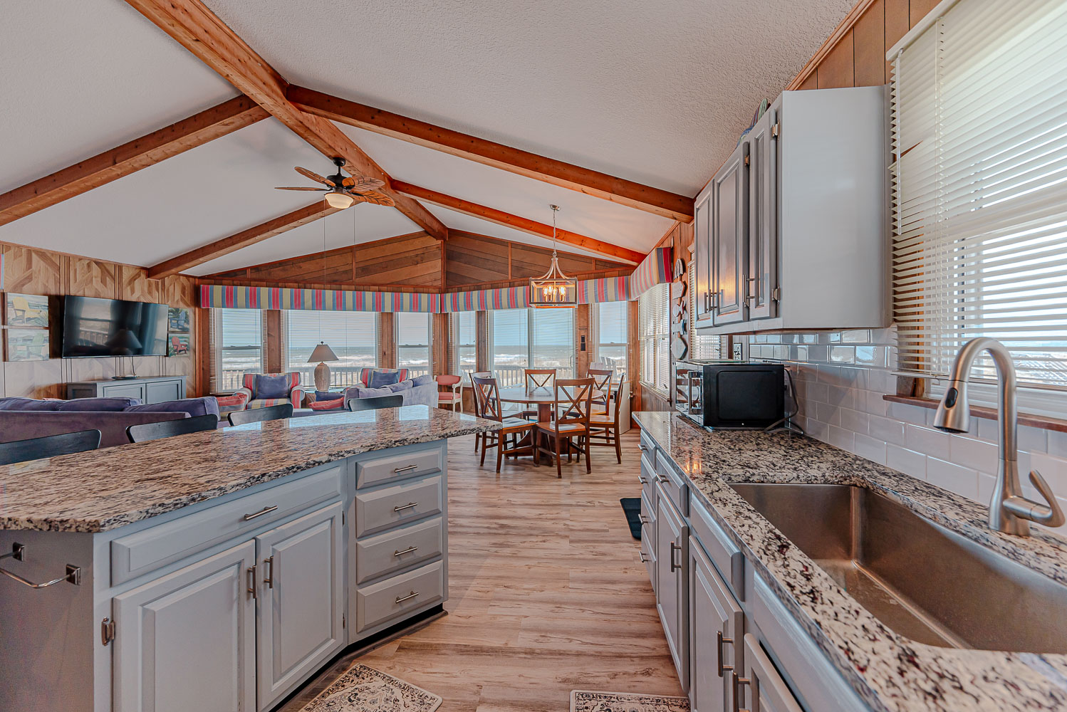 Mid Level: Living/Dining/Kitchen Area, TV, Access to Large Sun Deck w/Unobstructed Views of Ocean, Deck Furniture, Full Bath, and Split-Level Design with Steps Down to 2 Bedrooms (1 w/Queen; 1 w/2 Bunk Sets).