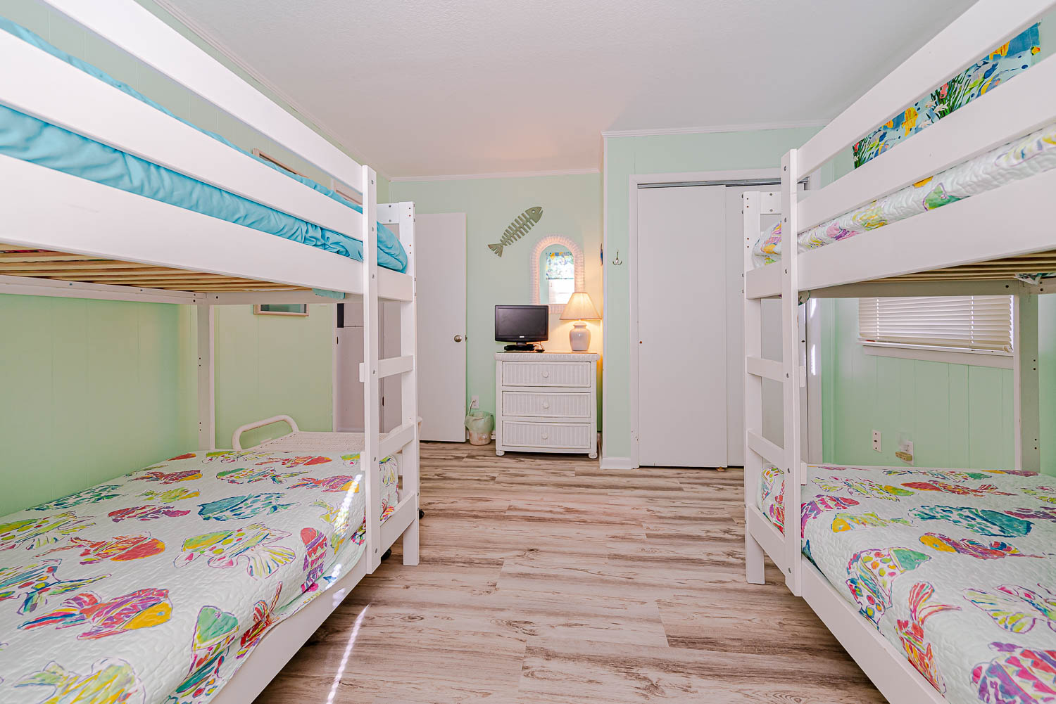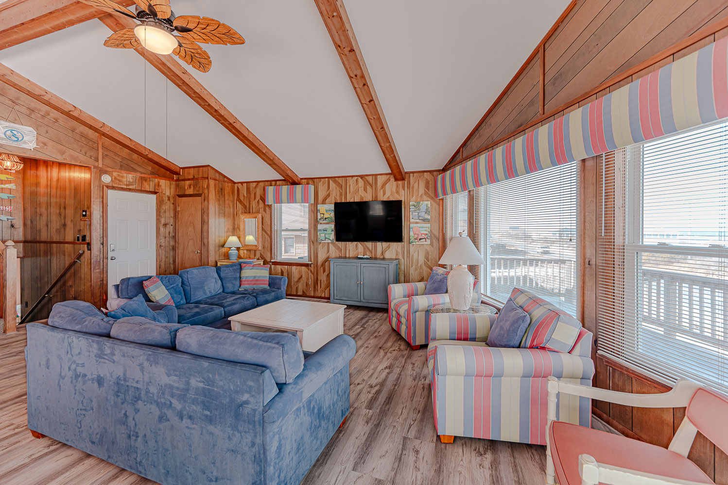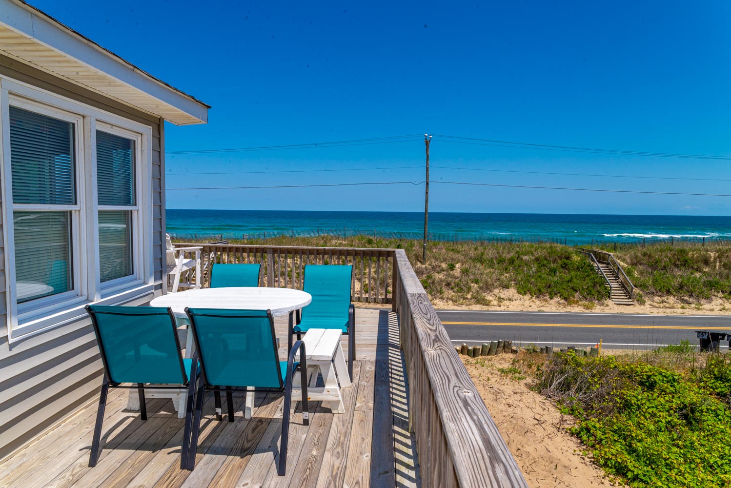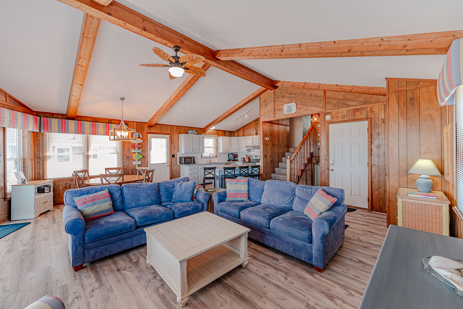 Mid Level: Living/Dining/Kitchen Area, TV, Access to Large Sun Deck w/Unobstructed Views of Ocean, Deck Furniture, Full Bath, and Split-Level Design with Steps Down to 2 Bedrooms (1 w/Queen; 1 w/2 Bunk Sets).