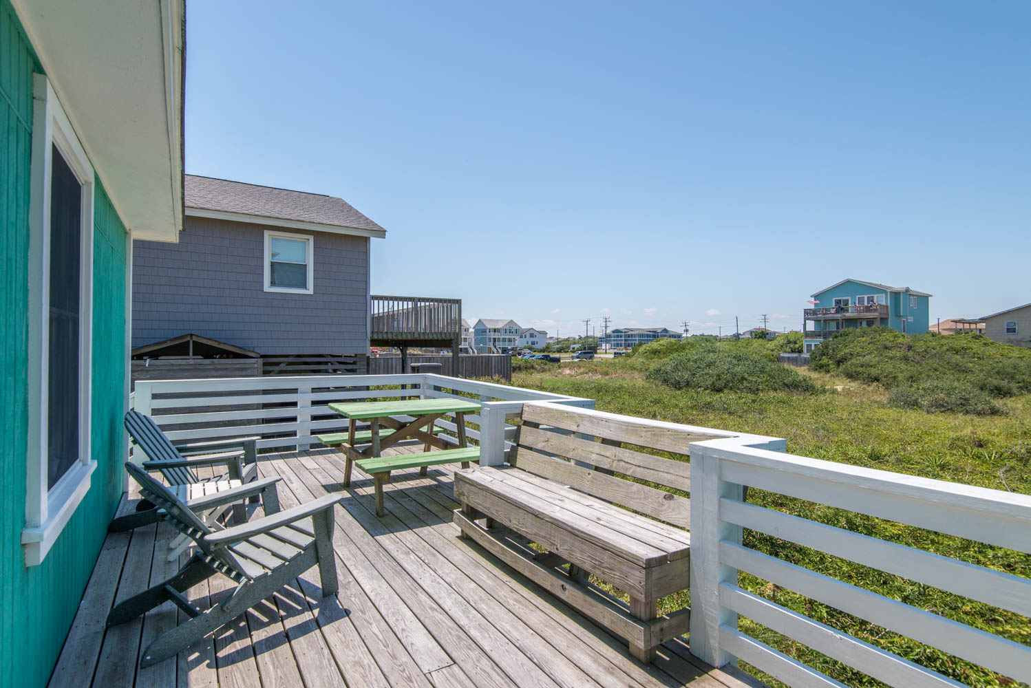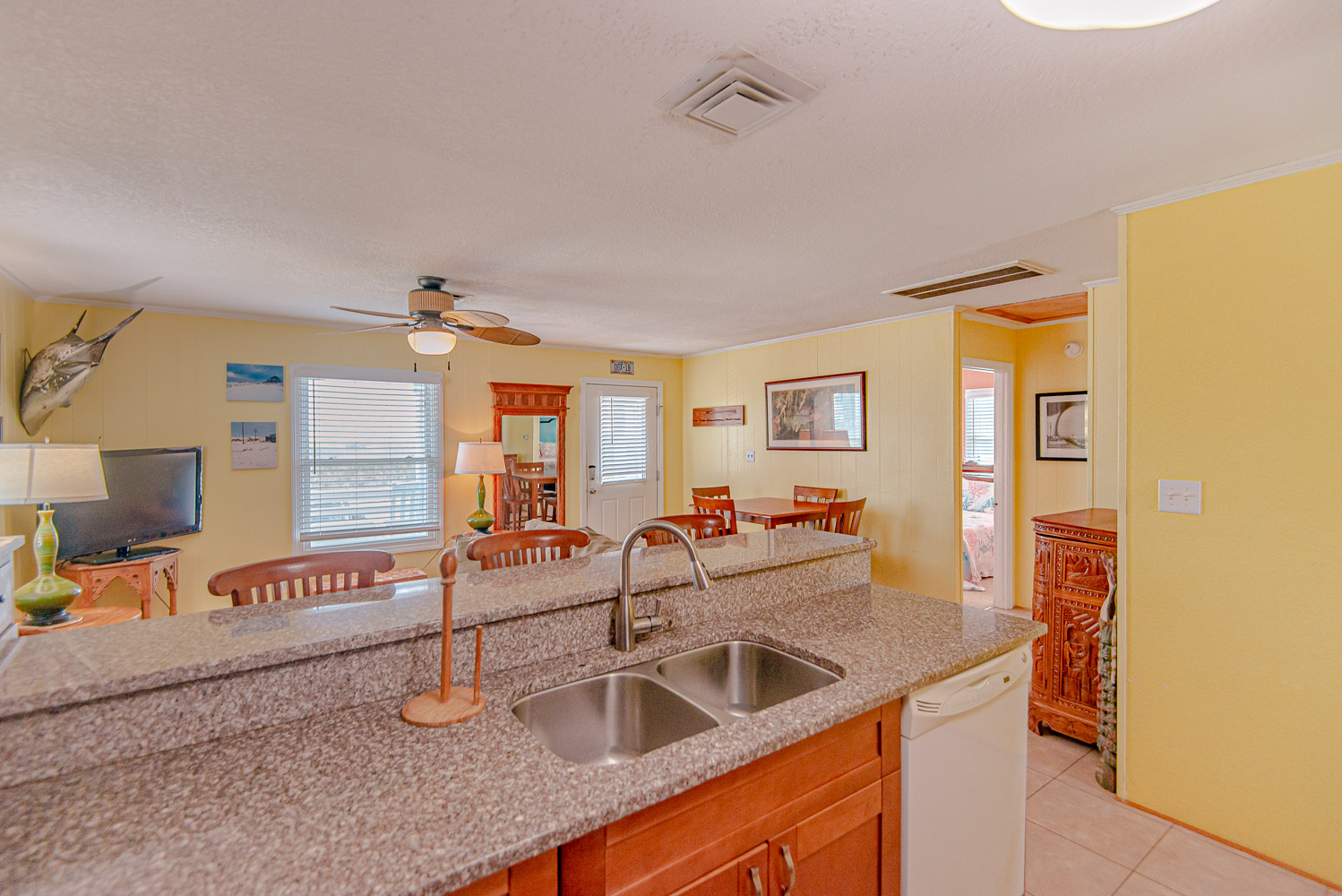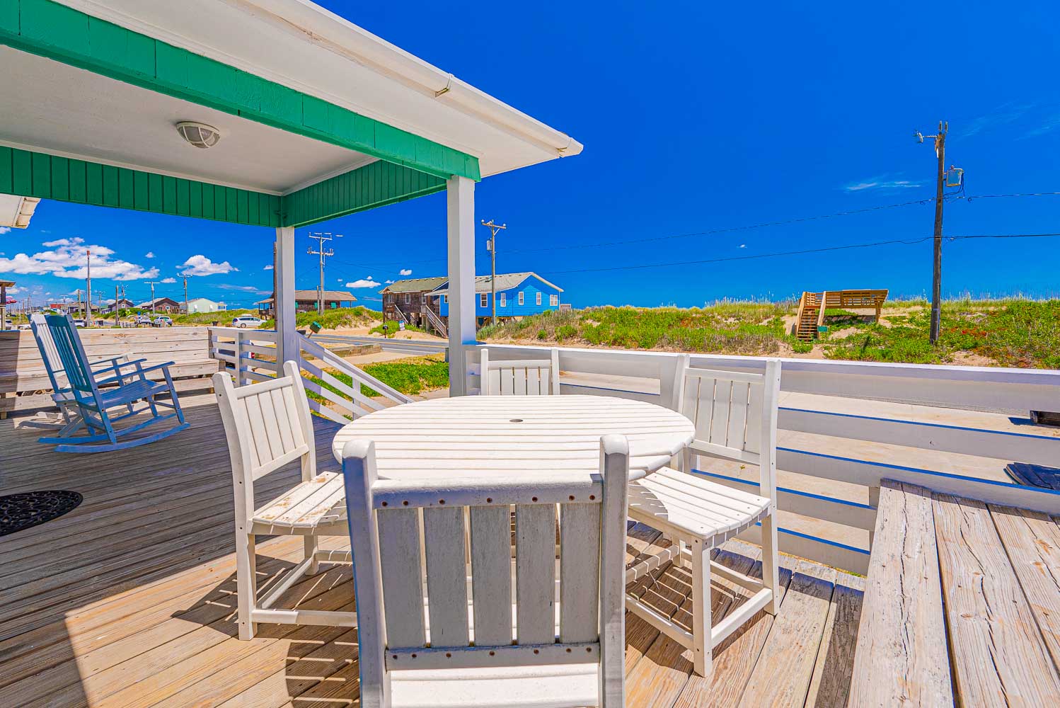 Main Level: Living Area w/ Flat Screen TV, Queen Sleep Sofa; Dining Area; Kitchen w/Granite Counters; Ocean Views, Laundry Area, 2 Bedrooms (Private Suite w/King, Flat Screen TV, Full Bath; 1 w/King, Flat Screen TV), Full Hall Bath, Covered Deck, Front Sun Deck w/Built-In Seats, & Back Sun Deck w/Deck Furniture.