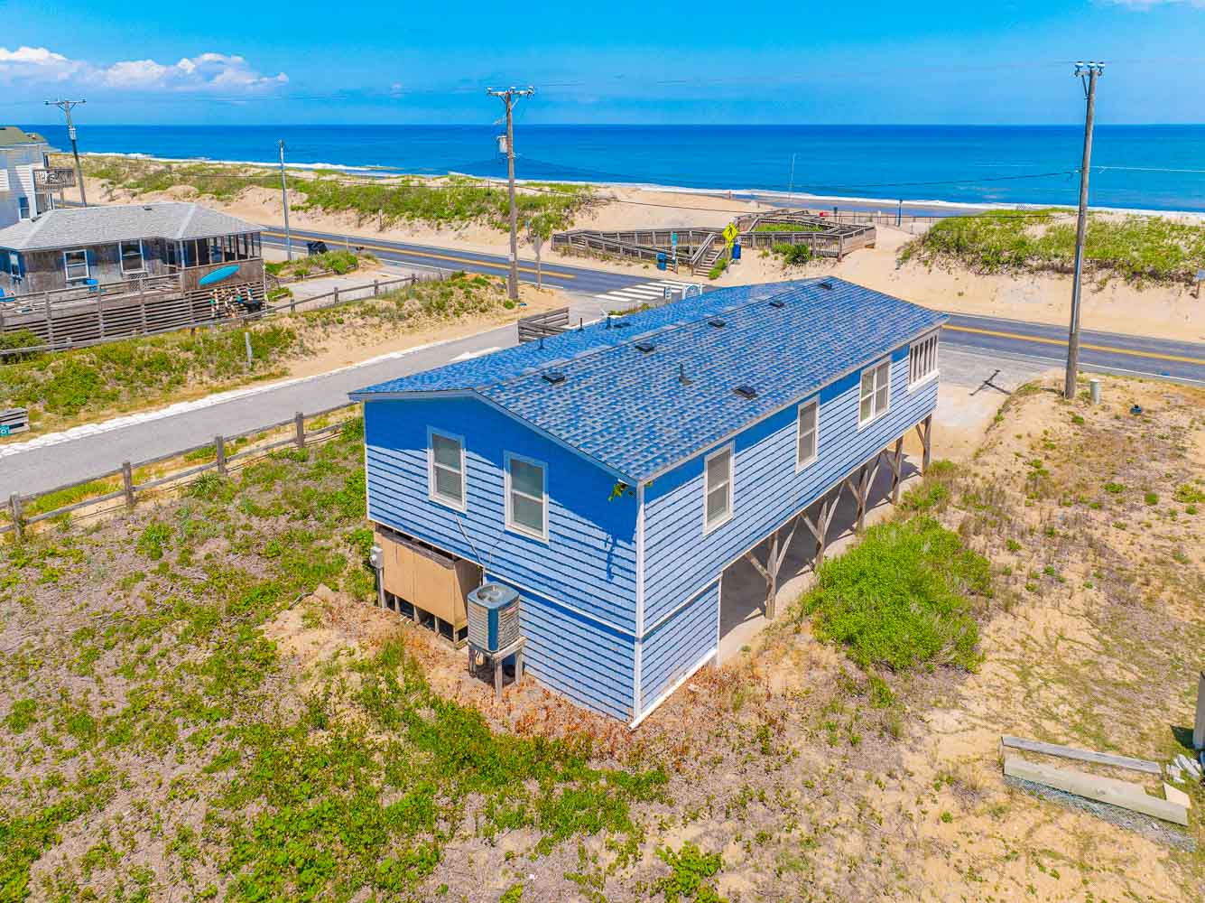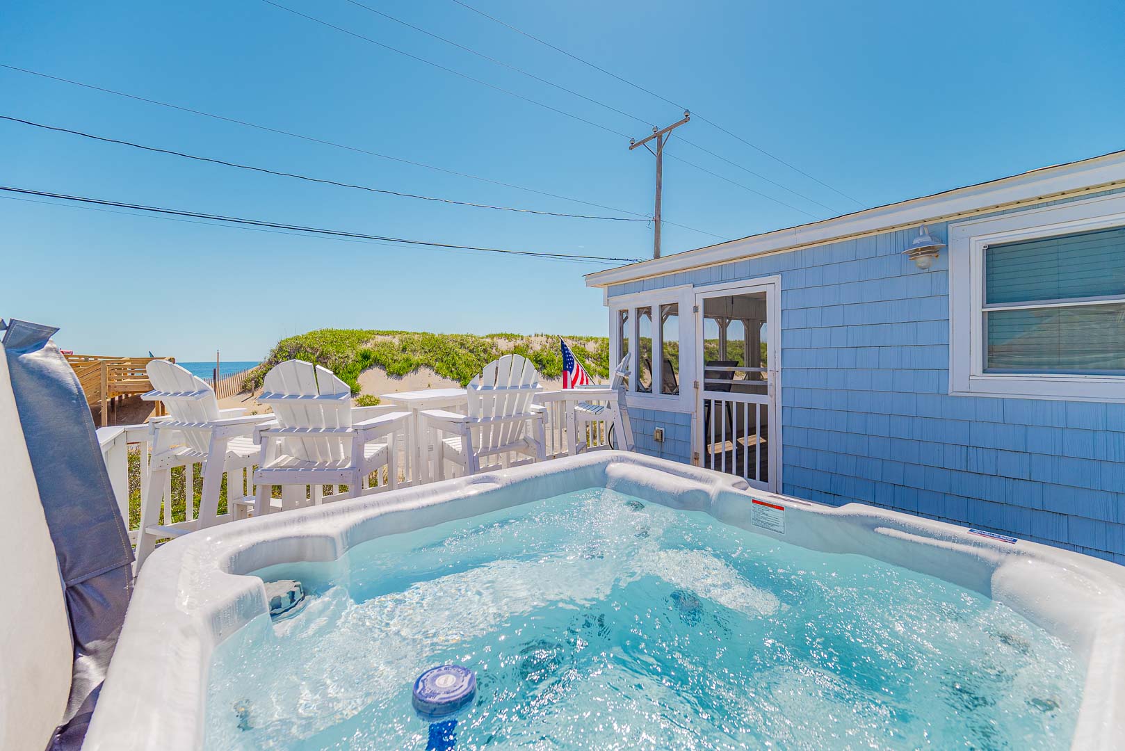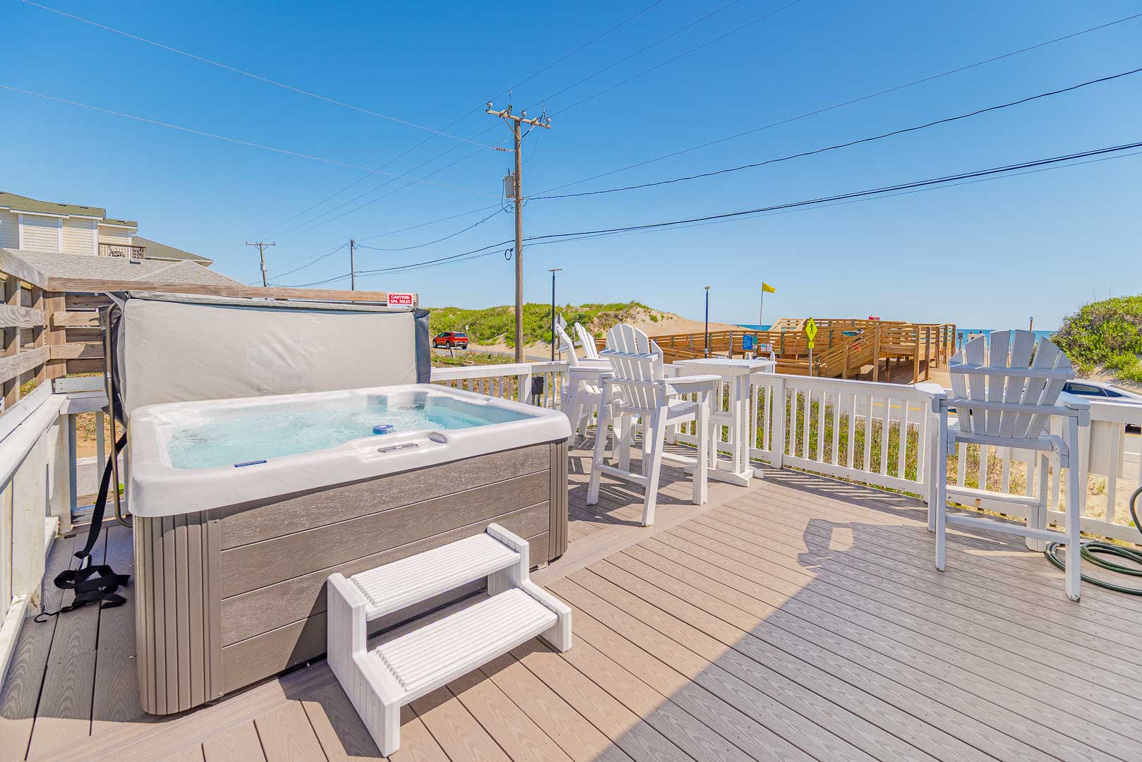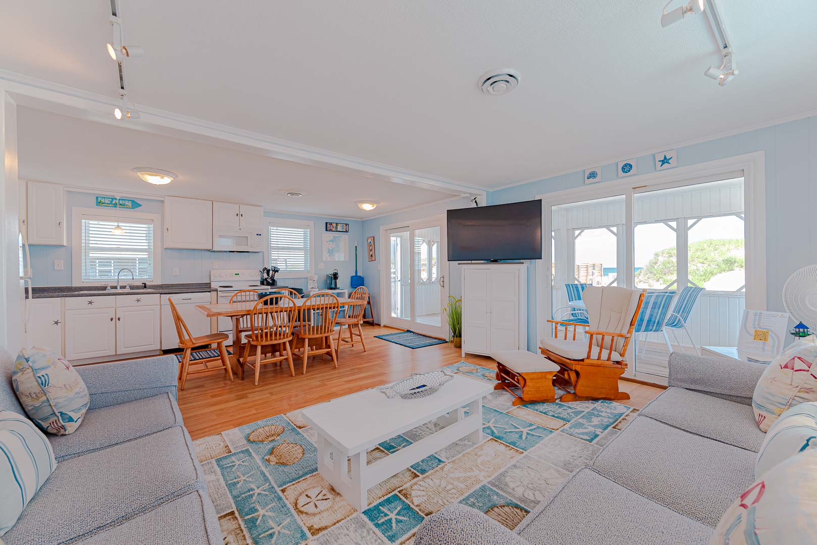 Main Level: Living/Dining/Kitchen Area, Coffee Station, TV, DVD, Stereo, Beautiful Hardwood Floors, 3 Bedrooms (Private Suite w/Queen, TV, Full Bath w/Shower Only, 1 w/Queen; 1 w/Duo Bunk w/Trundle, TV), Full Hall Bath, Screen Porch w/Furniture, and Sun Deck w/Hot Tub, Deck Furniture, and Ocean Views.