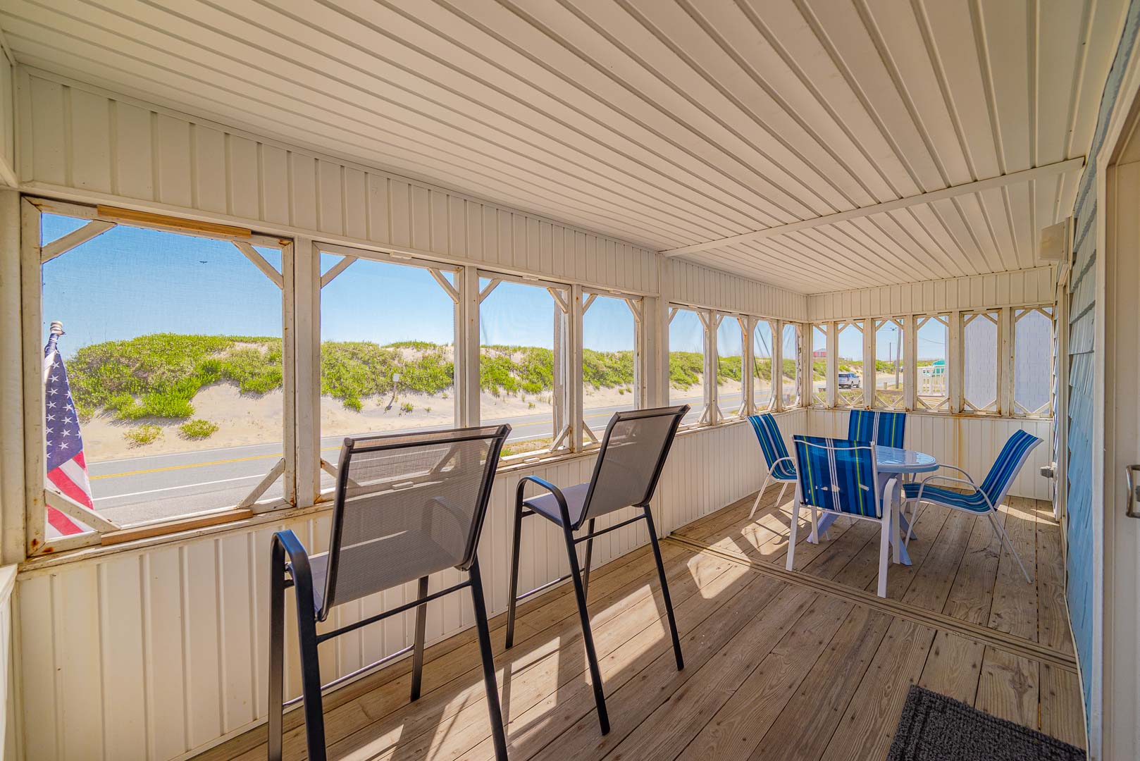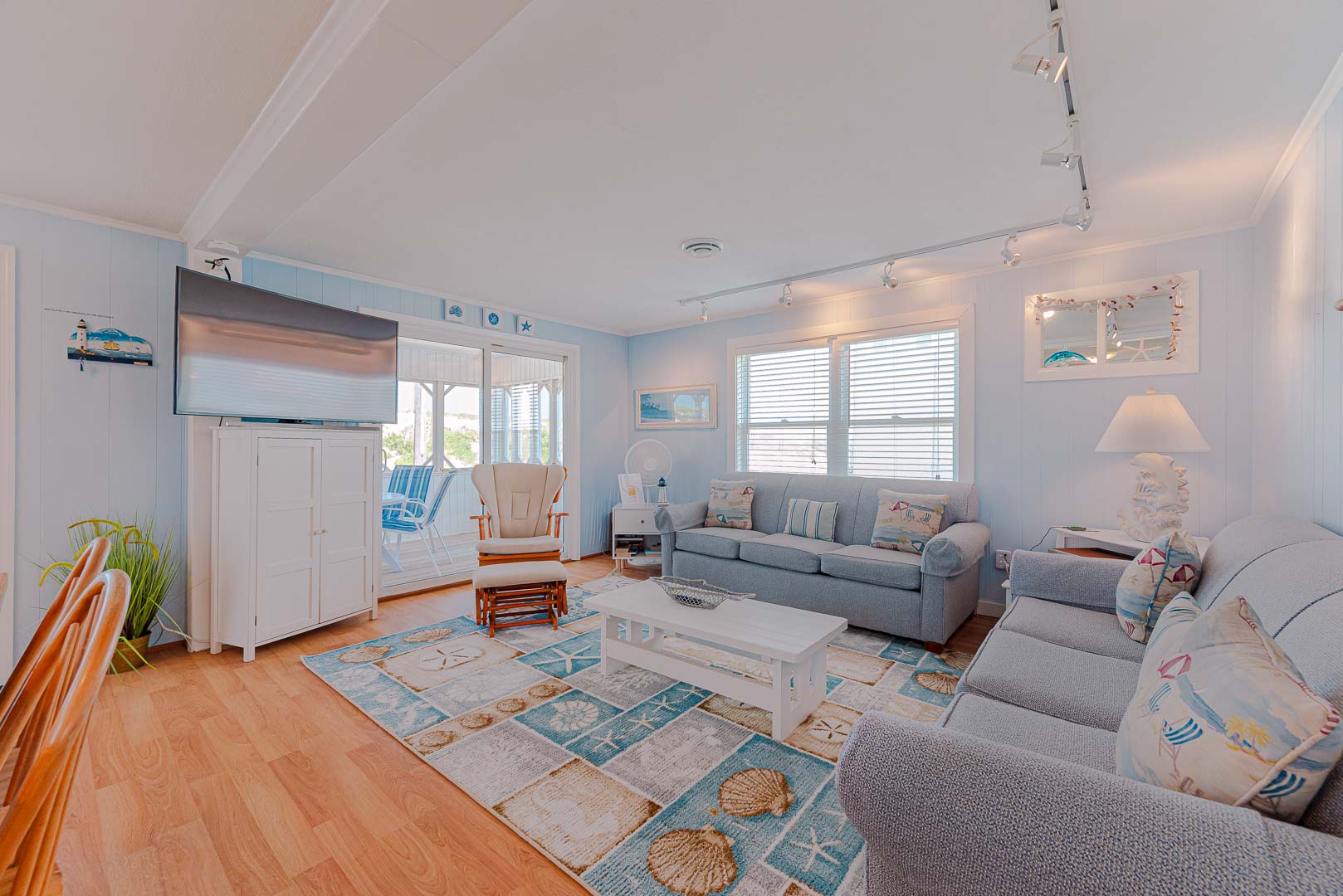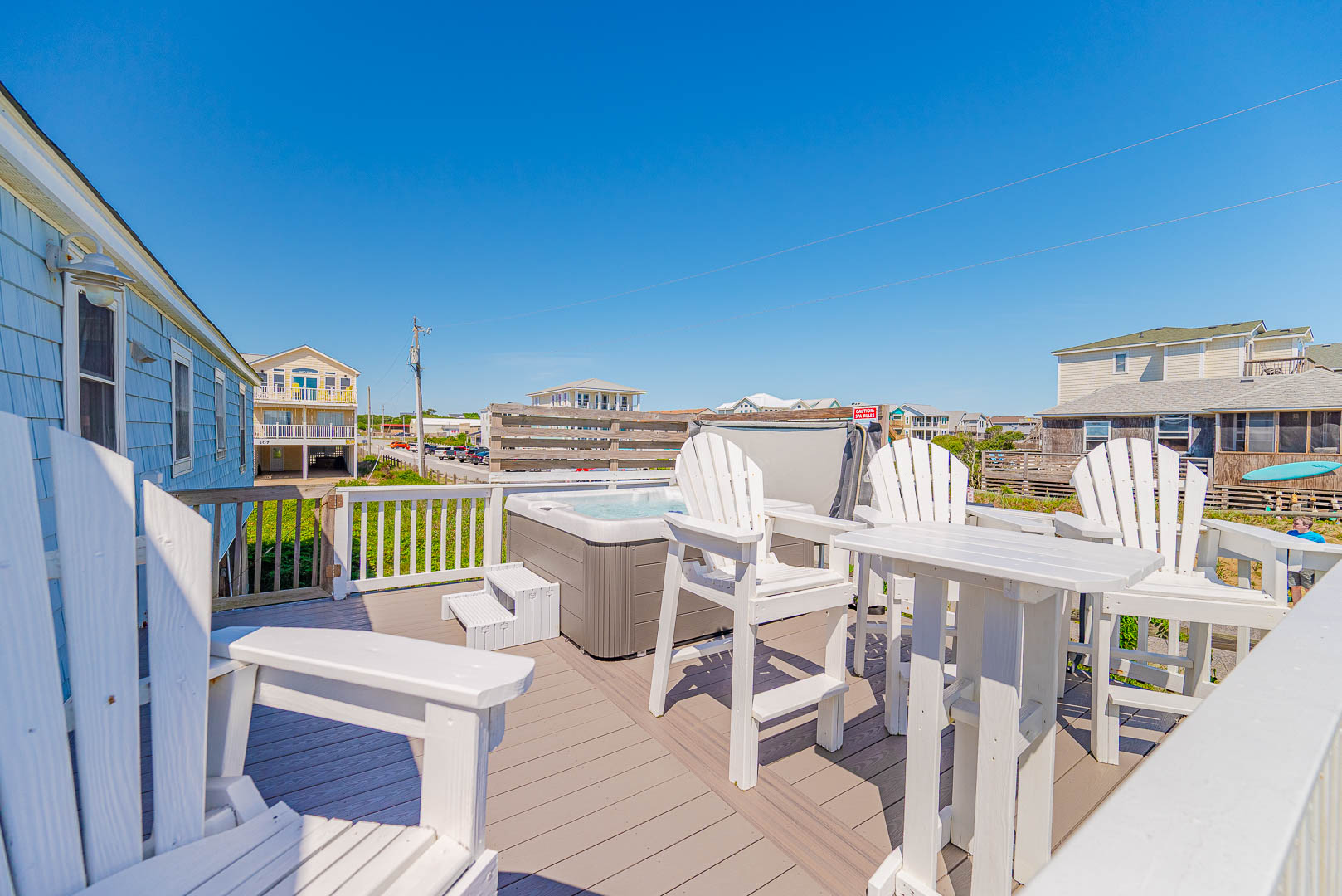 Main Level: Living/Dining/Kitchen Area, Coffee Station, TV, DVD, Stereo, Beautiful Hardwood Floors, 3 Bedrooms (Private Suite w/Queen, TV, Full Bath w/Shower Only, 1 w/Queen; 1 w/Duo Bunk w/Trundle, TV), Full Hall Bath, Screen Porch w/Furniture, and Sun Deck w/Hot Tub, Deck Furniture, and Ocean Views.