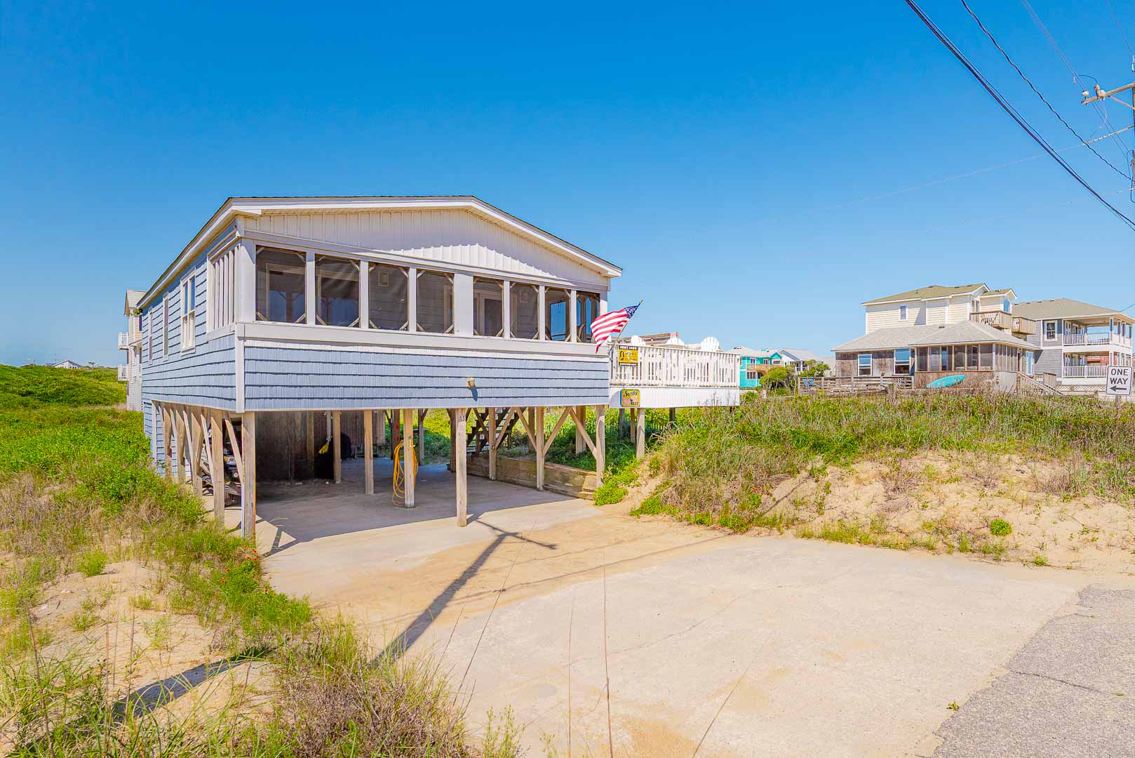 Ground Level: Parking for 4 Cars, Storage Room w/Washer and Dryer, Beach Chairs, Boogie Boards, Steps to Main Level Entry, Enclosed Outside Shower, Picnic Table, and Charcoal Grill.