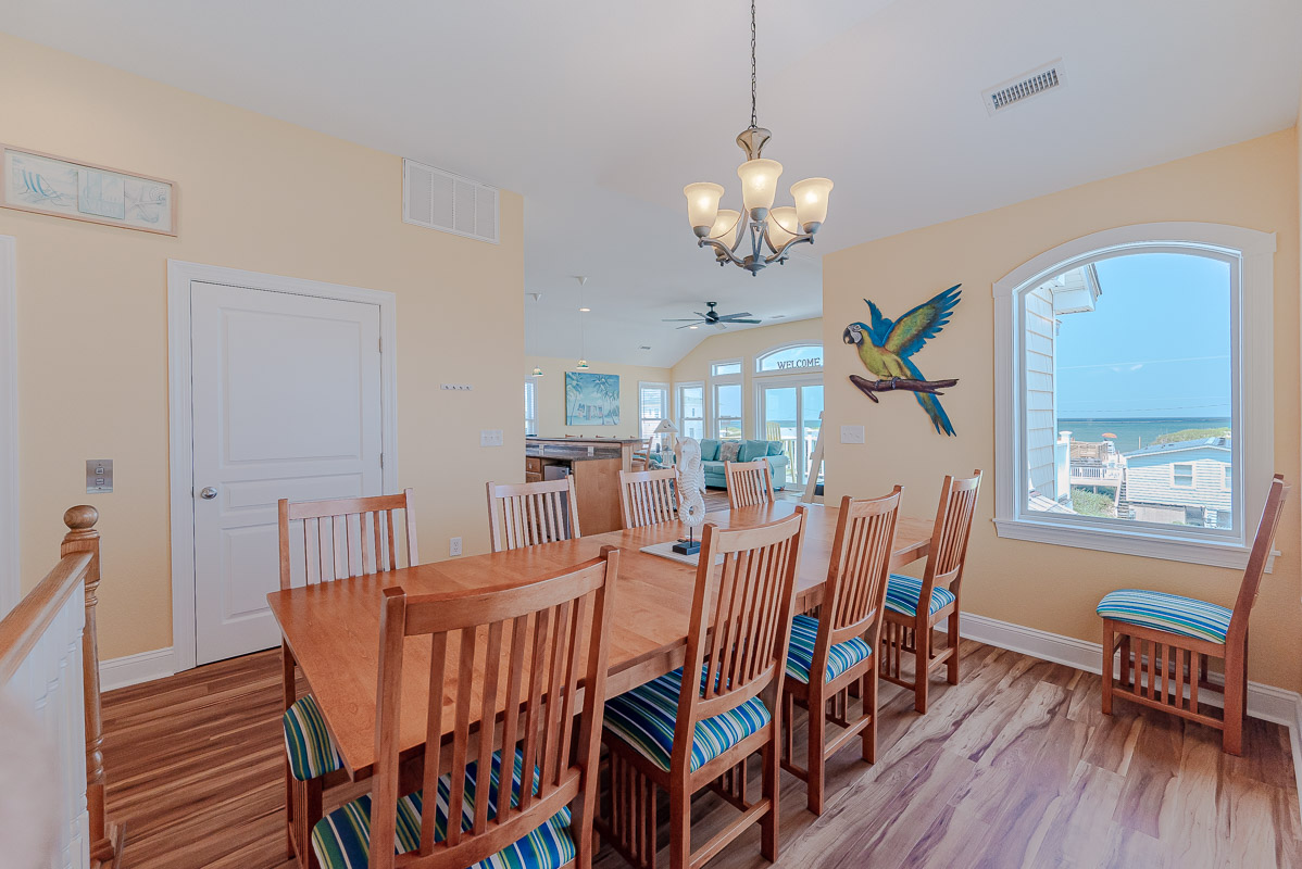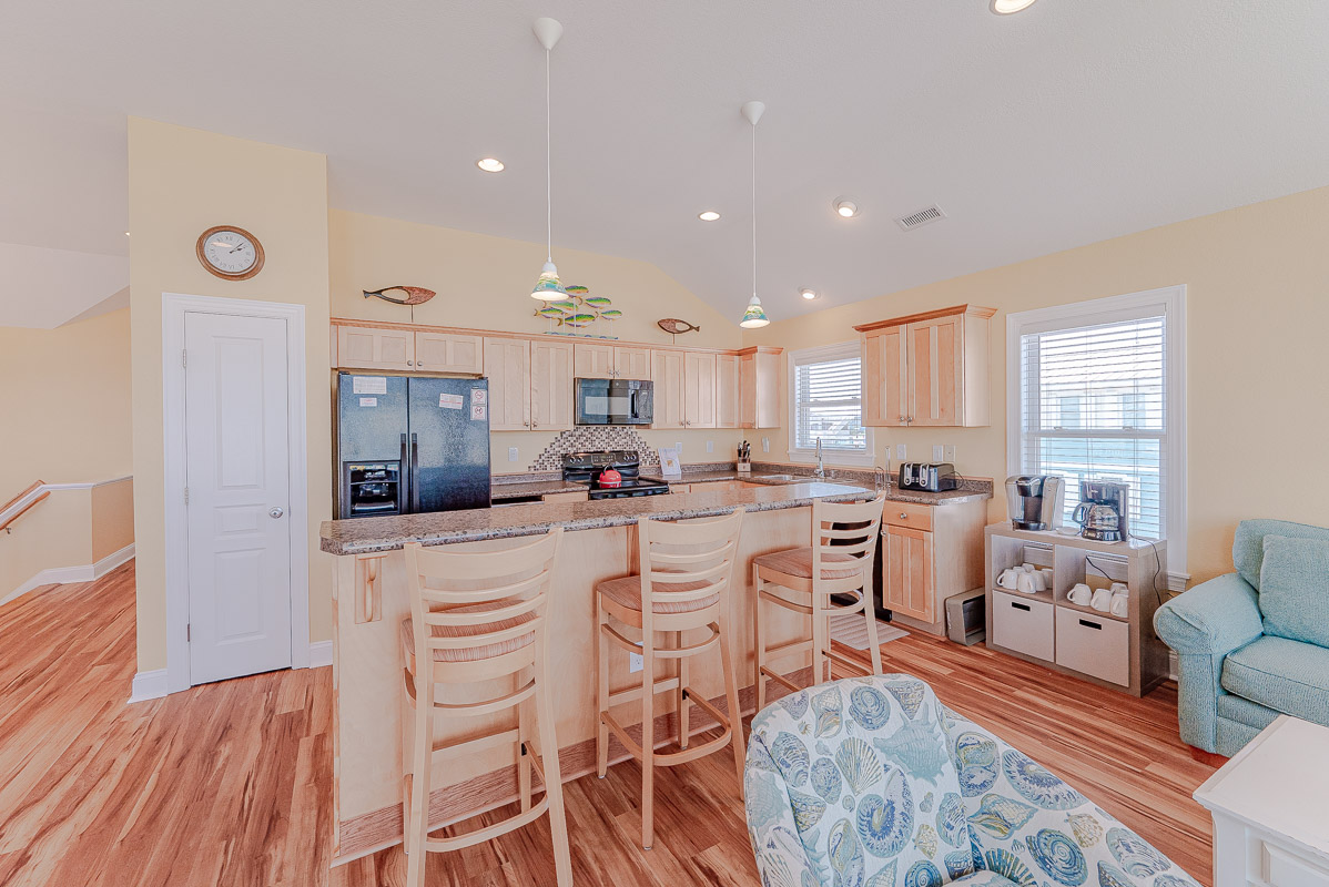 Top Level: Beautifully Decorated Living Area, TV, Stereo Sound System, Outside Speakers, Hardwood Floors, Well Equipped Kitchen, Island Bar w/Seating for Three (3); Dining Area w/Seating for Ten (10), Access to Front Sun Deck w/Deck Furniture and Amazing Ocean Views; Half Bath; Private w/King, TV, Full Bath w/Walk-In Shower, Access to Small Back Sun Deck.