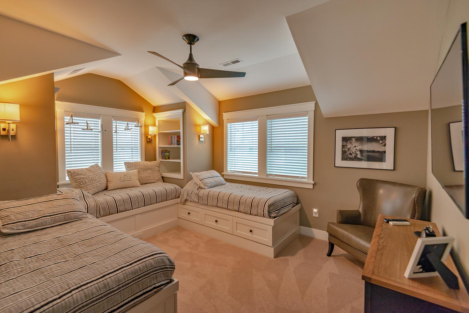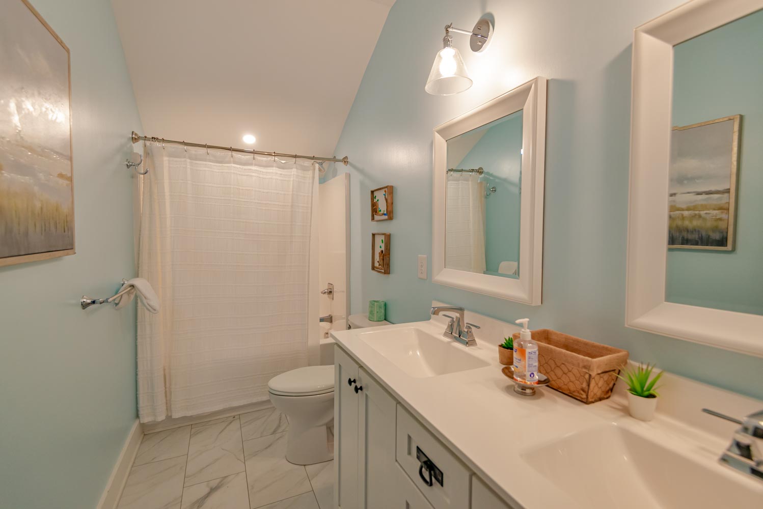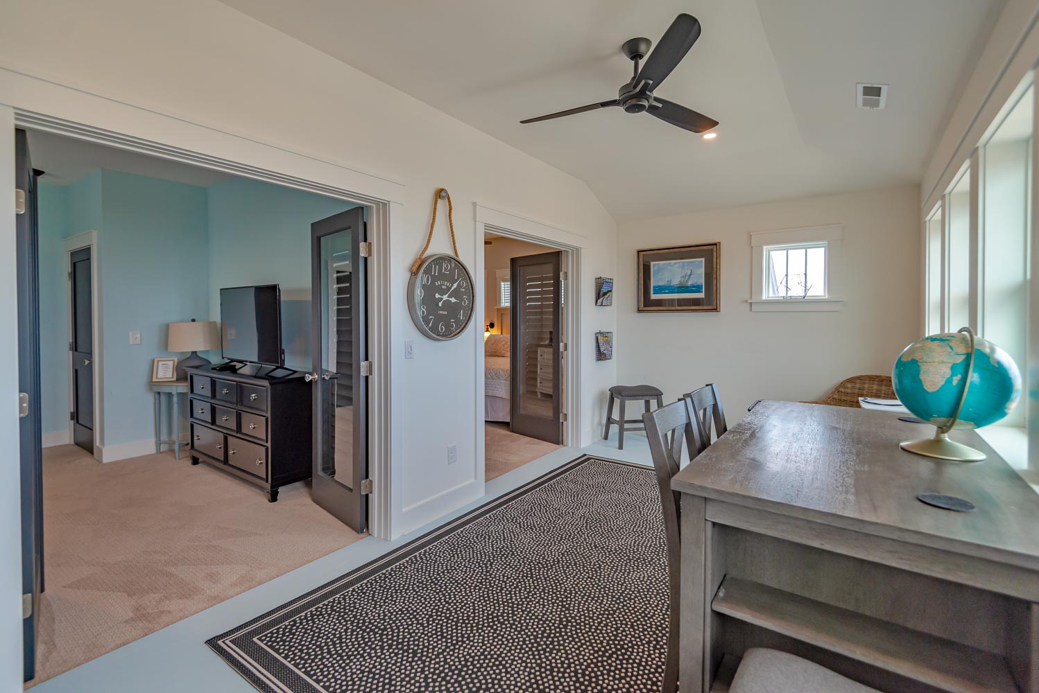 Top Level: 4 Bedrooms (2 Private Suites w/Kings, TVs, & Full Baths w/Showers, & Access to Enclosed Sun Room w/Ocean Views, 1 w/3 Built-In Singles, 1 w/2 Doubles), Shared Full Hall Bath w/Tub & Shower.