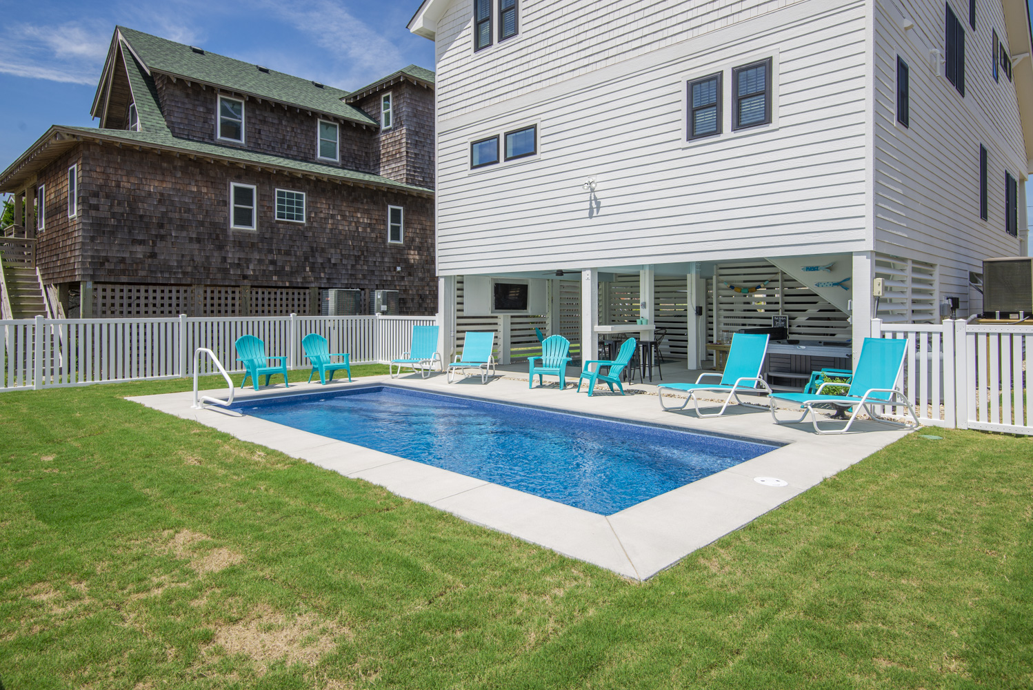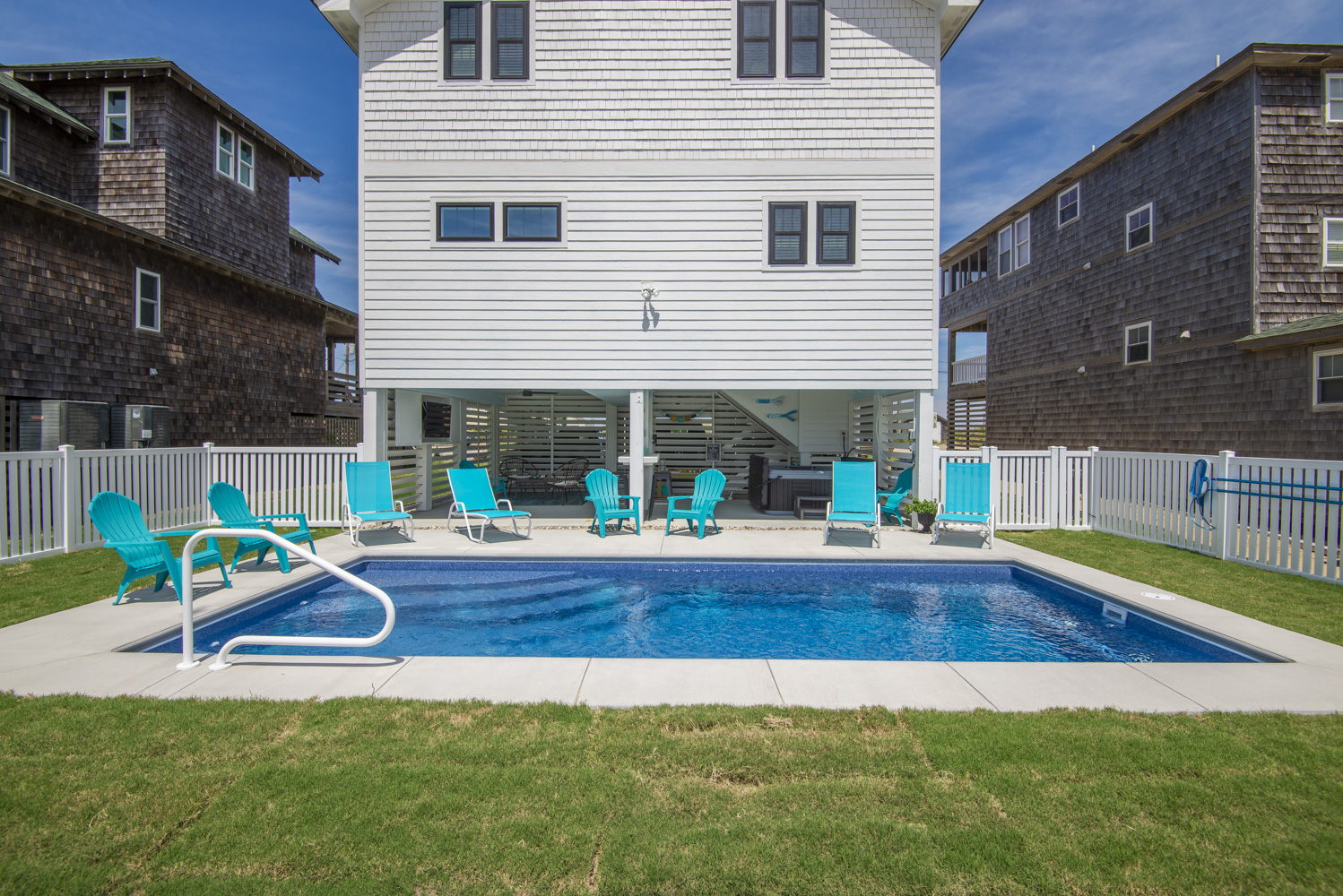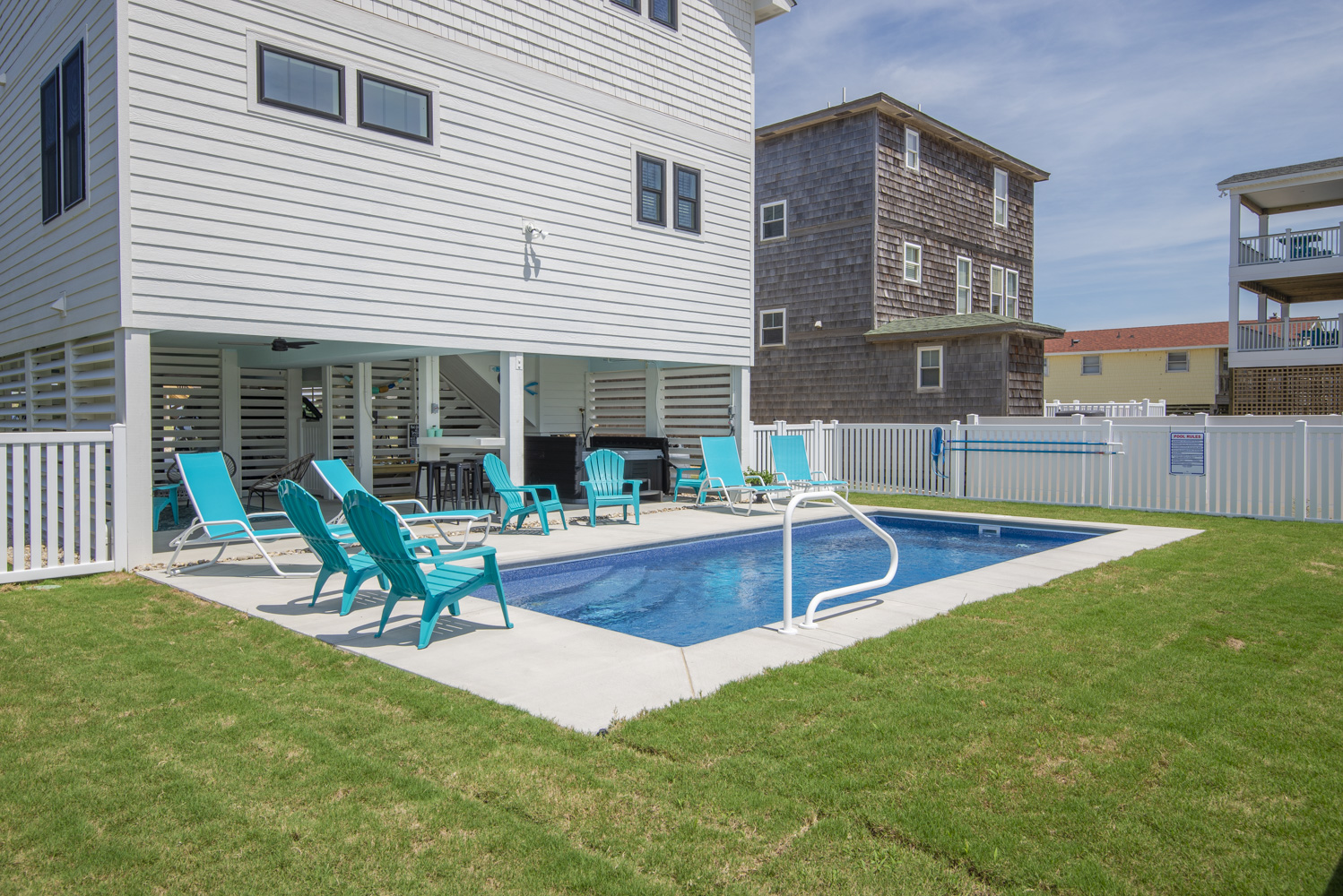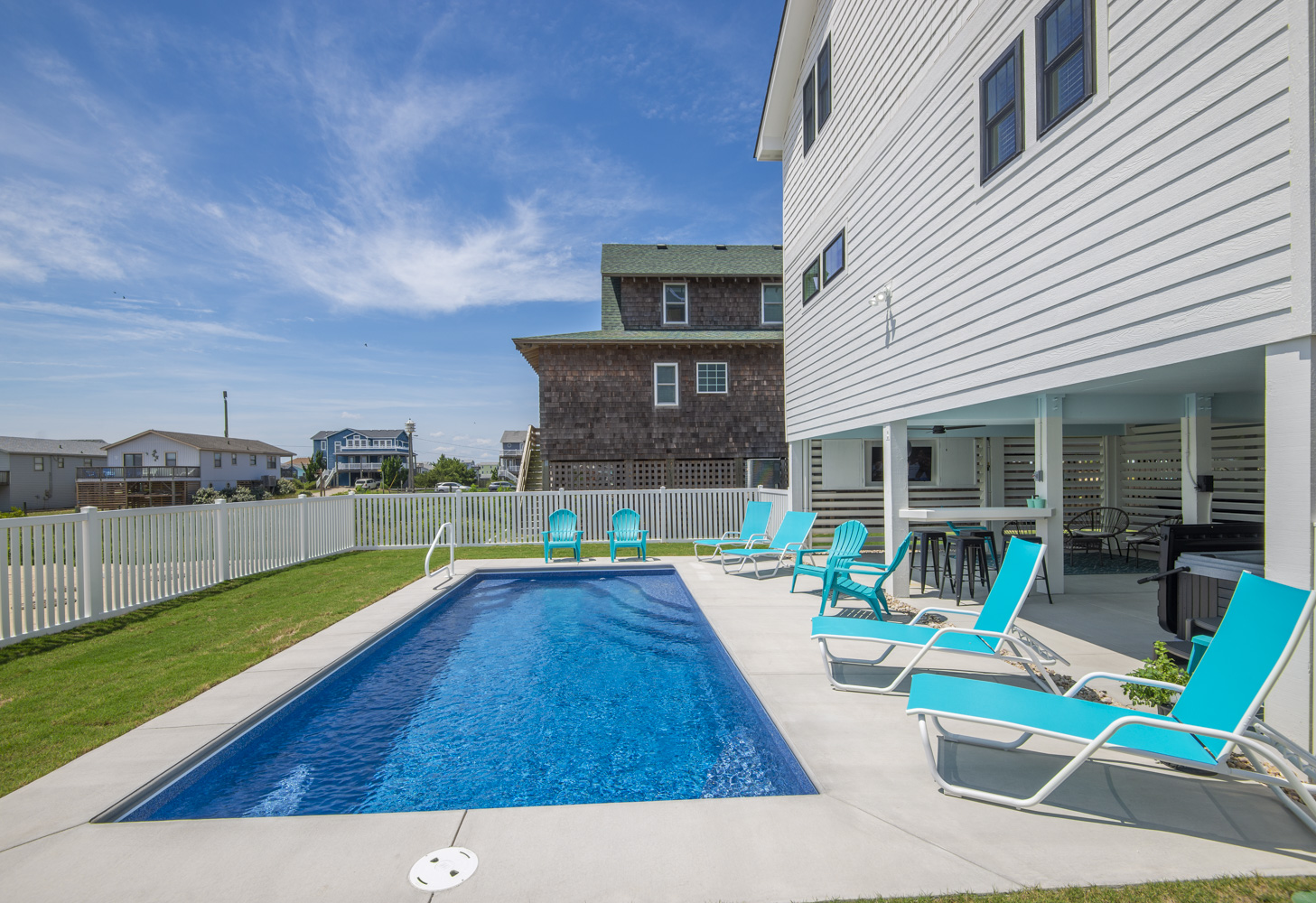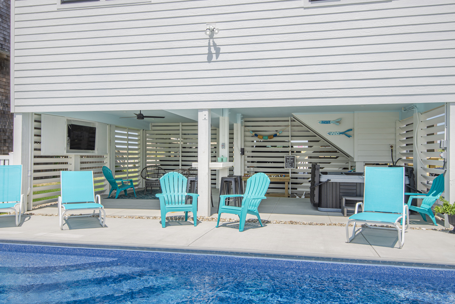 Ground Level: Parking for 5 Cars, New in 2025: Direct Beach Access Via Your Own Private Dune Deck and Beach Walkway, Covered Entry to Home, Under House Outdoor Entertainment Area w/TV, Sitting Area, Bar in Cabana Style Setting w/Plenty of Shade & Outdoor Activities, Enclosed Outside Shower, Gas Grill, Private 12x25 Heated Saltwater Swimming Pool - Open Seasonally. (Can Be Heated for $200.00 Plus Tax Per Week - Please Bear in Mind That Pool Temperature is Subject to Outside Temperatures & Conditions), Hot Tub, & Fenced Yard.