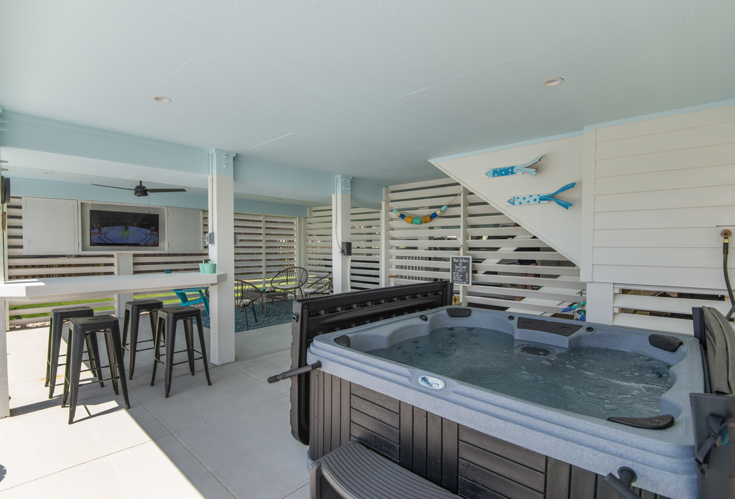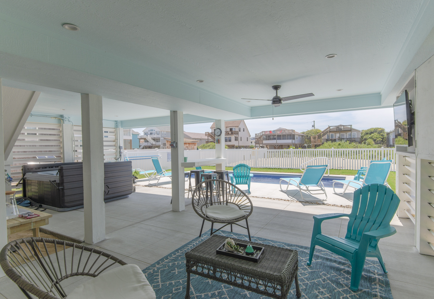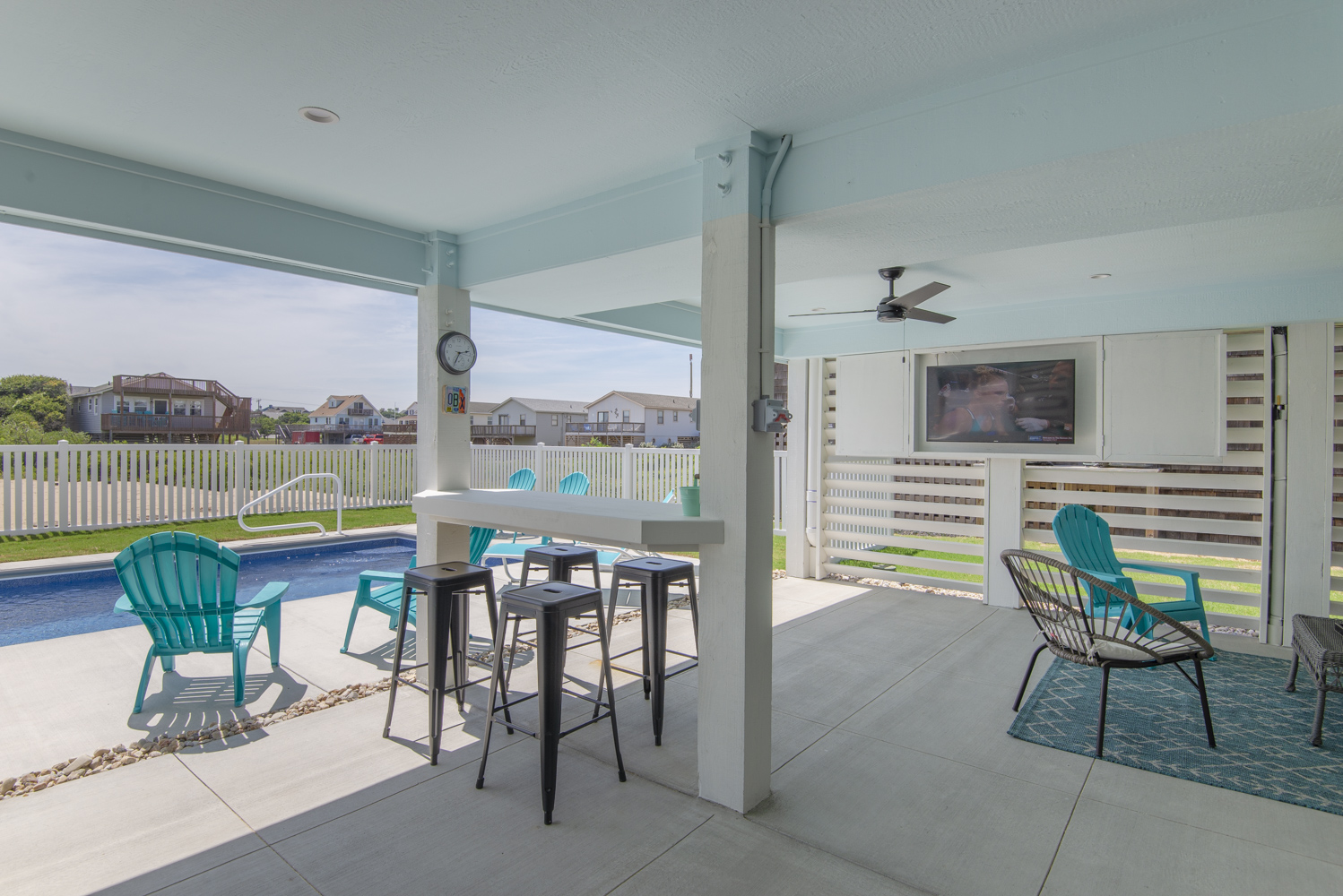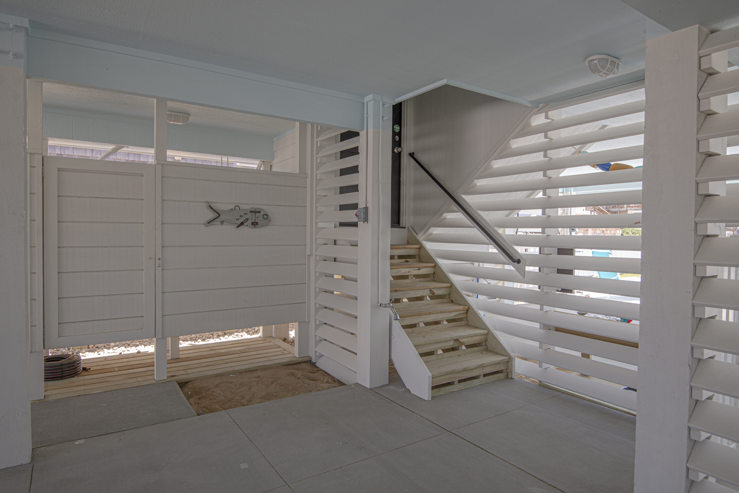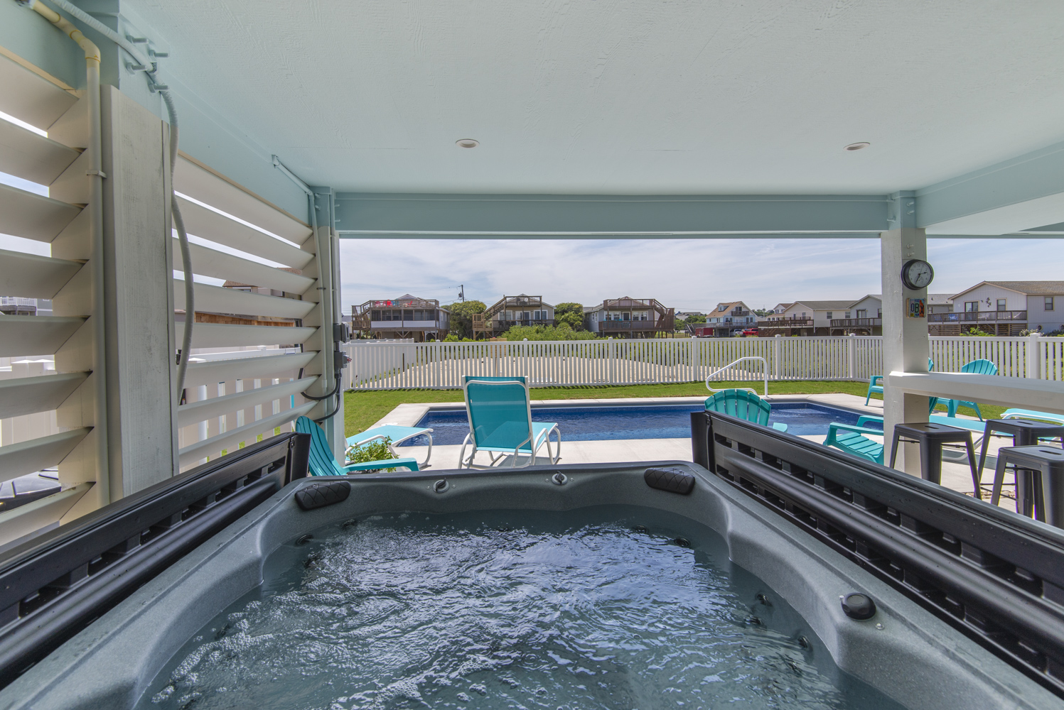 Ground Level: Parking for 5 Cars, New in 2025: Direct Beach Access Via Your Own Private Dune Deck and Beach Walkway, Covered Entry to Home, Under House Outdoor Entertainment Area w/TV, Sitting Area, Bar in Cabana Style Setting w/Plenty of Shade & Outdoor Activities, Enclosed Outside Shower, Gas Grill, Private 12x25 Heated Saltwater Swimming Pool - Open Seasonally. (Can Be Heated for $200.00 Plus Tax Per Week - Please Bear in Mind That Pool Temperature is Subject to Outside Temperatures & Conditions), Hot Tub, & Fenced Yard.