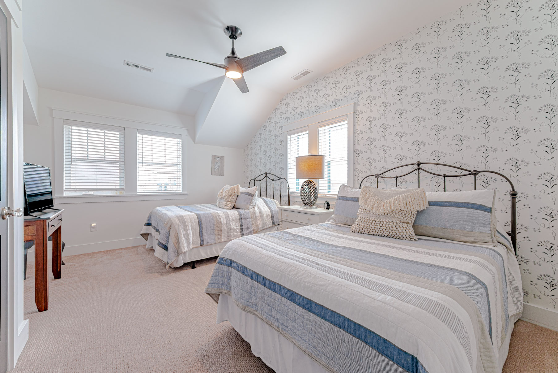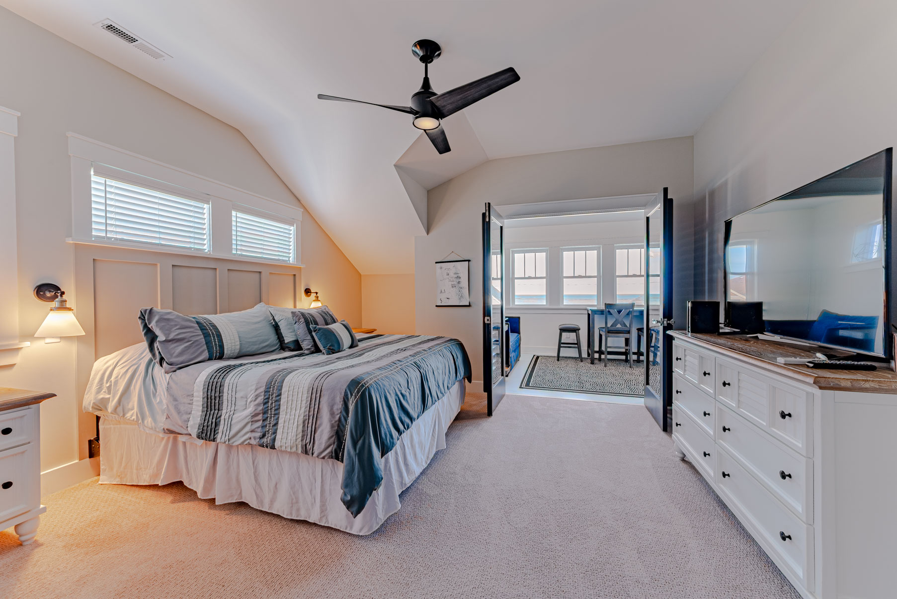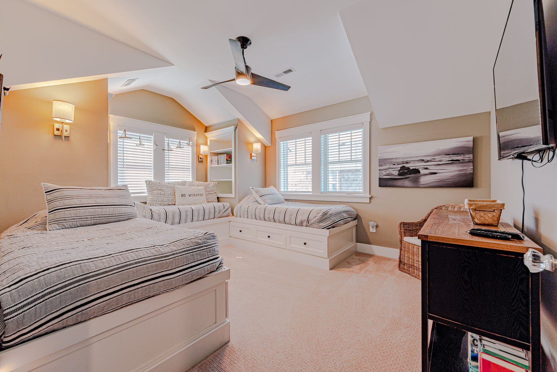 Top Level: 4 Bedrooms (2 Private Suites w/Kings, TVs, & Full Baths w/Showers, & Access to Enclosed Sun Room w/Ocean Views, 1 w/3 Built-In Singles, 1 w/2 Doubles), Shared Full Hall Bath w/Tub & Shower.