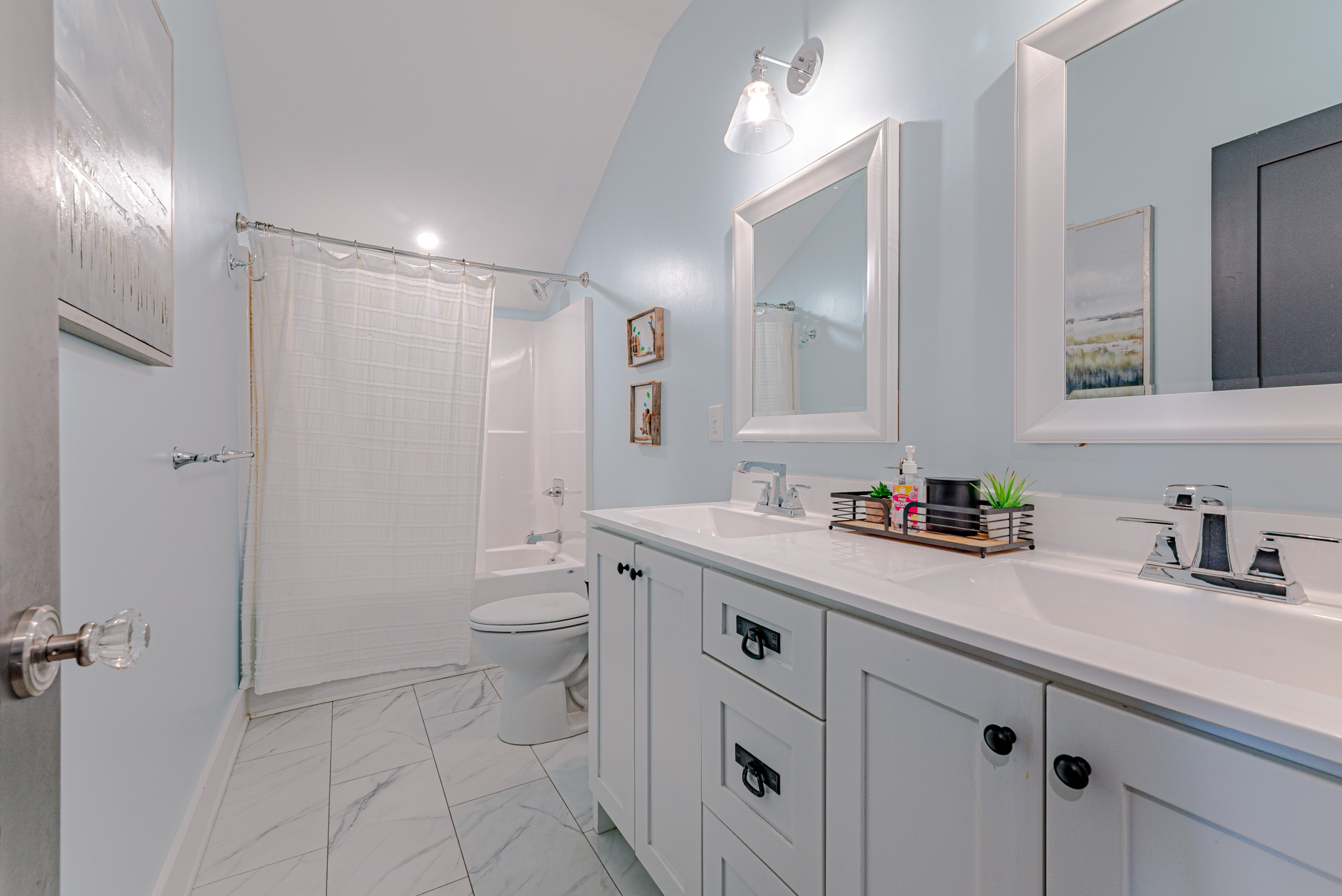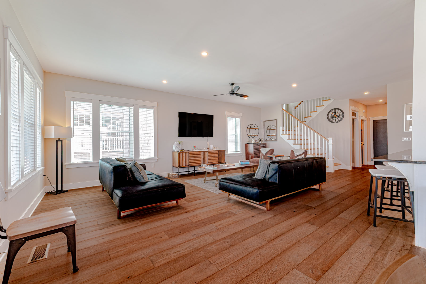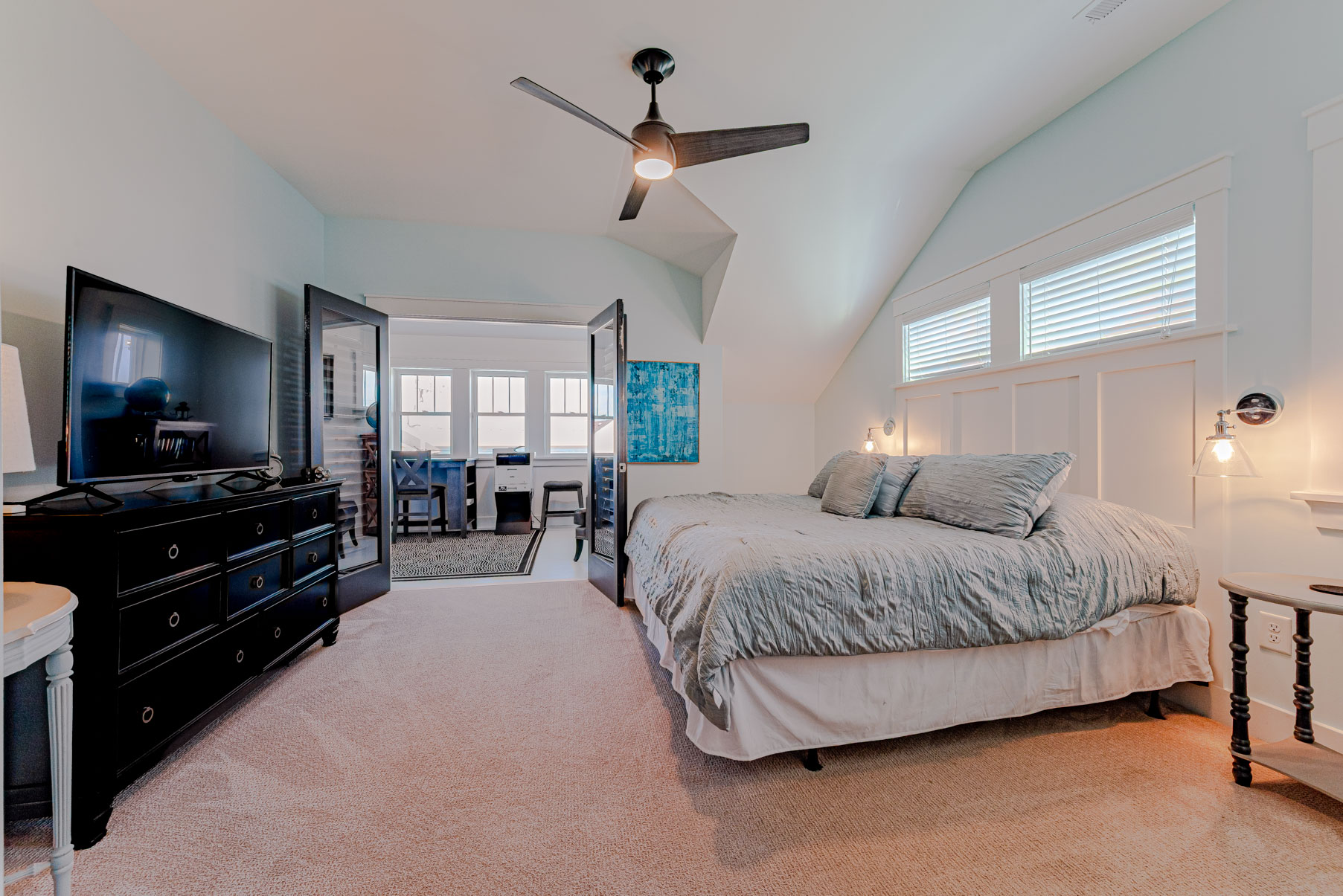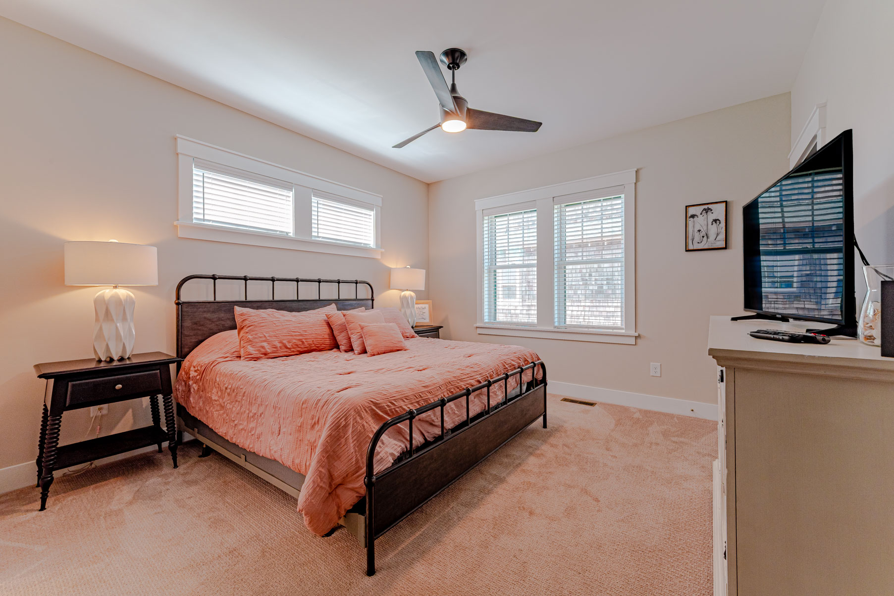 Top Level: 4 Bedrooms (2 Private Suites w/Kings, TVs, & Full Baths w/Showers, & Access to Enclosed Sun Room w/Ocean Views, 1 w/3 Built-In Singles, 1 w/2 Doubles), Shared Full Hall Bath w/Tub & Shower.