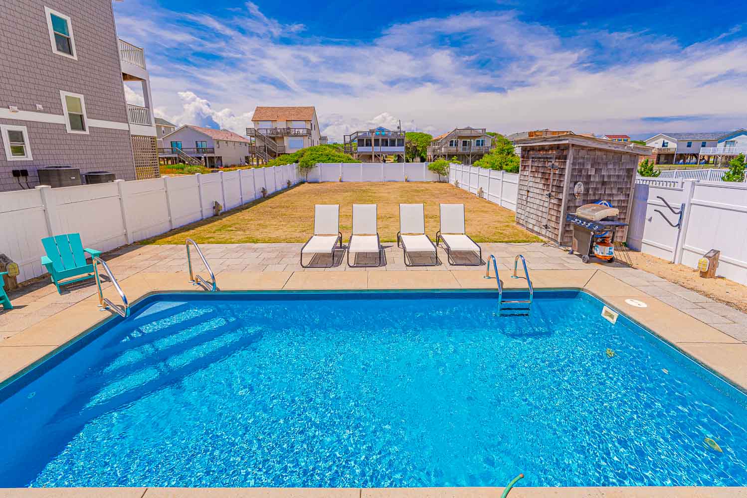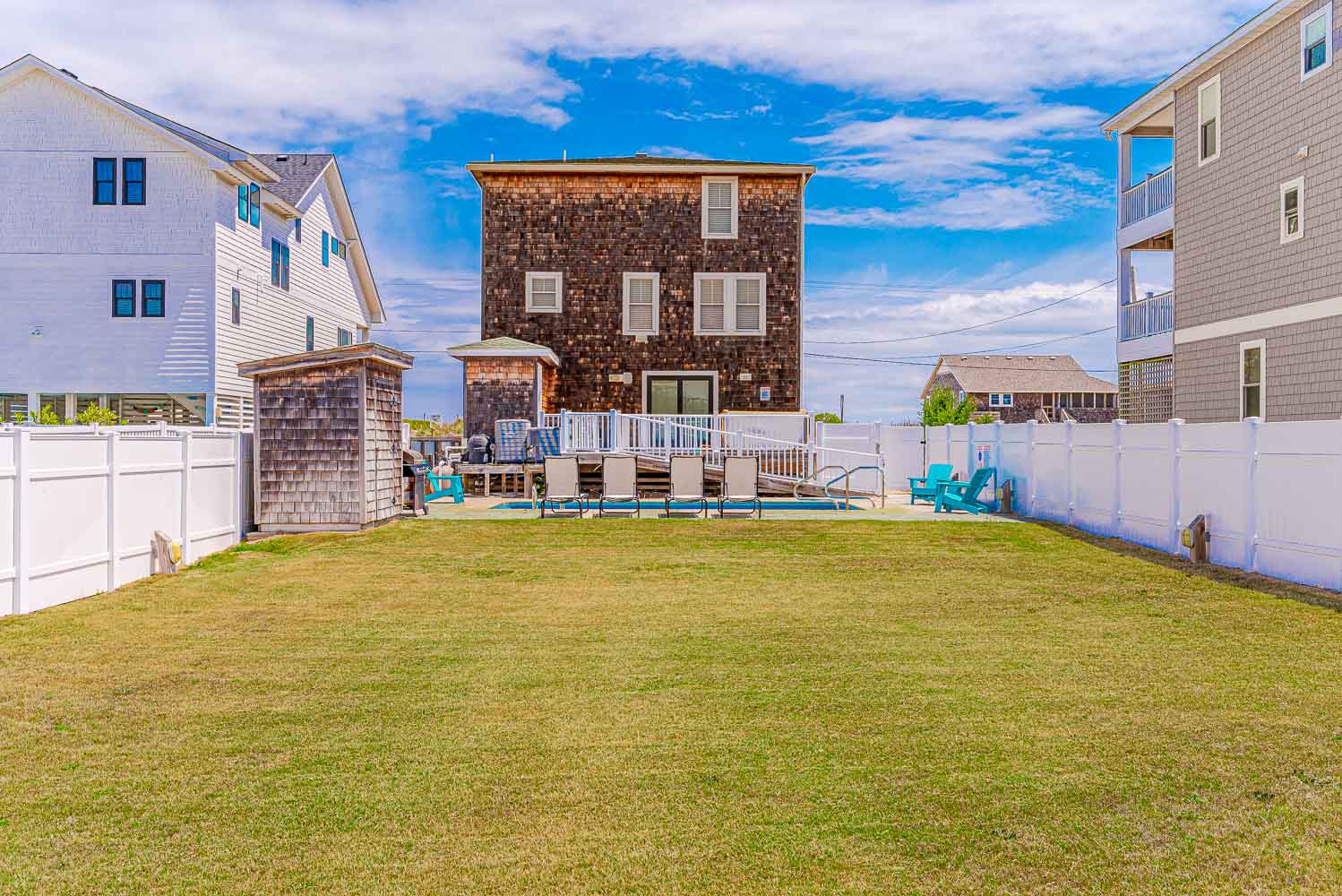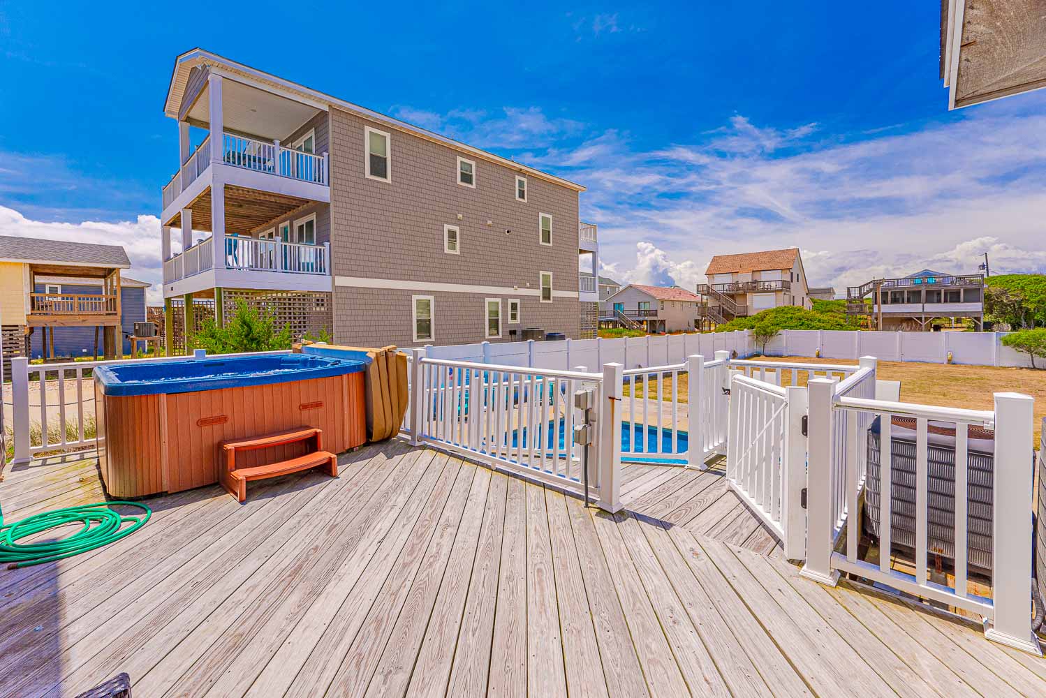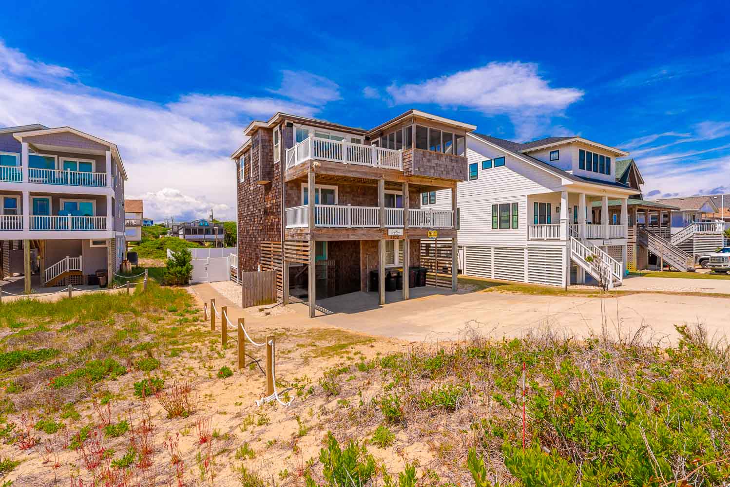 Ground Level: Parking for 4 Cars, Steps to Covered Entry, Ramp from Rear of Home to West Side Sun Deck, Entry, Large Fenced in Yard, Private Heated Saltwater Swimming Pool - Open Seasonally. (Can Be Heated for $400.00 Per Week, Plus Tax - Please Bear in Mind That Pool Temperature is Subject to Outside Temperatures and Conditions). Beach Access Located Across Beach Road Just South with Wooden Walkway The beach access is located just to the south across the Beach Road and is marked with a sign. There is a wooden walkway and then a sand path the leads to the beach.