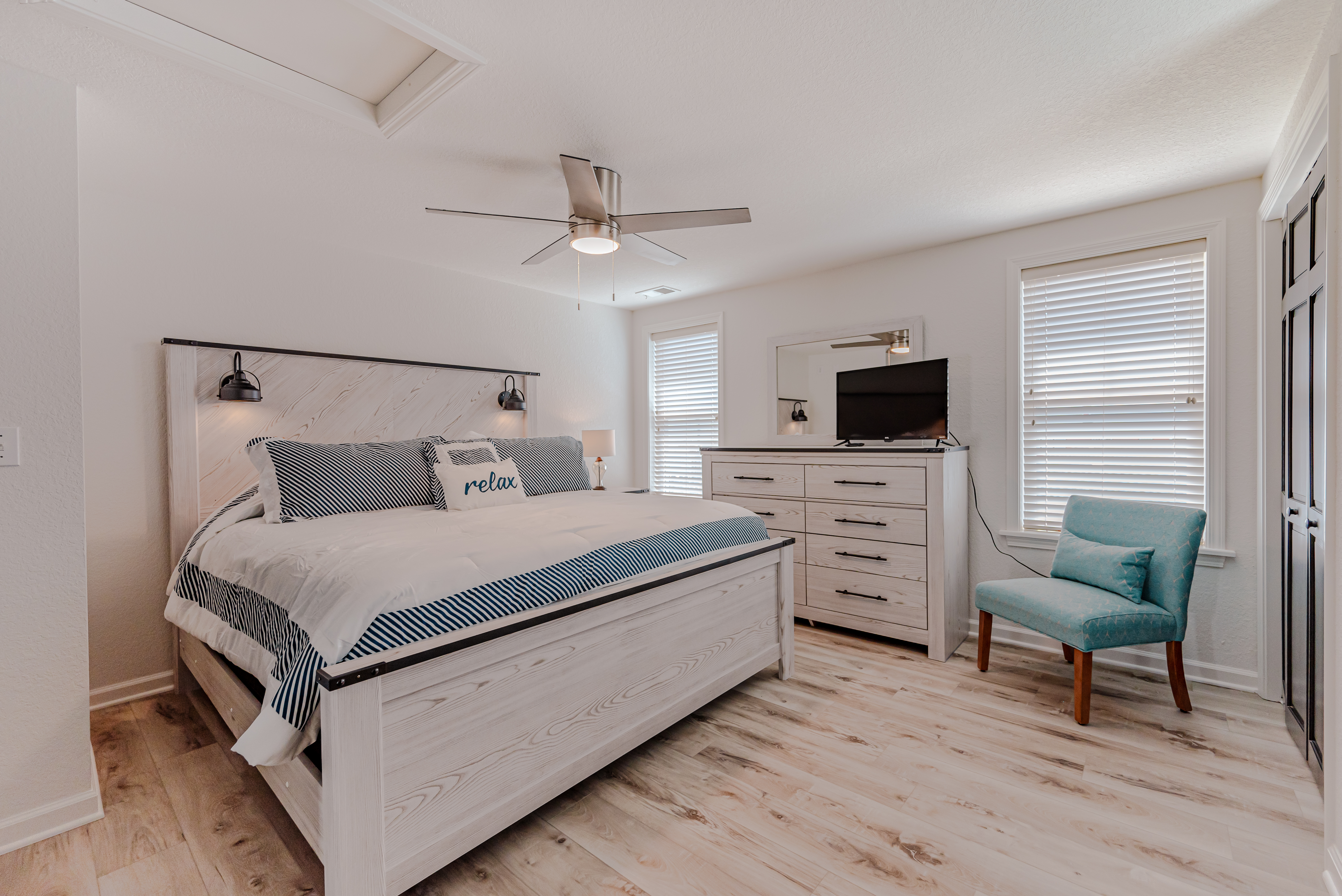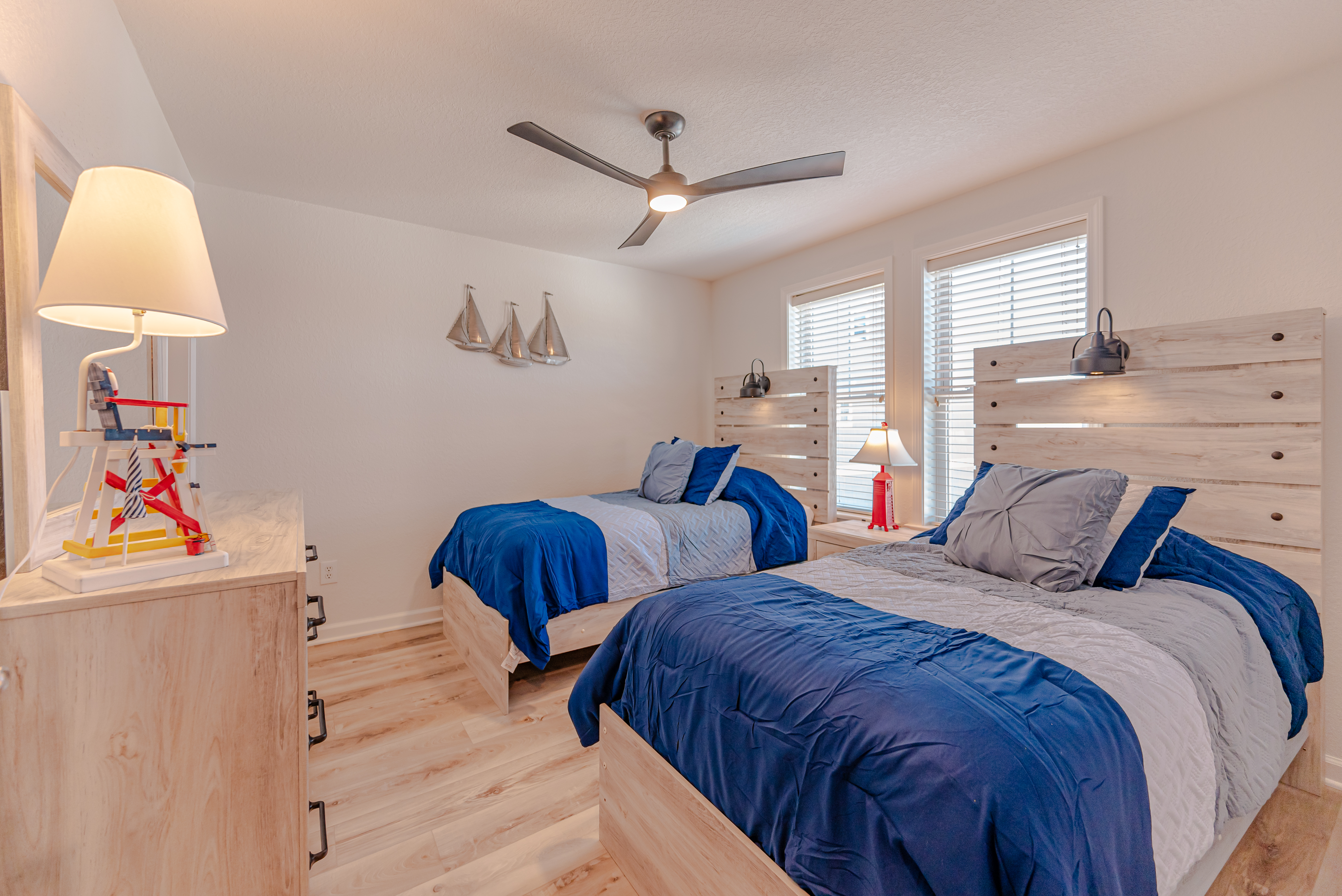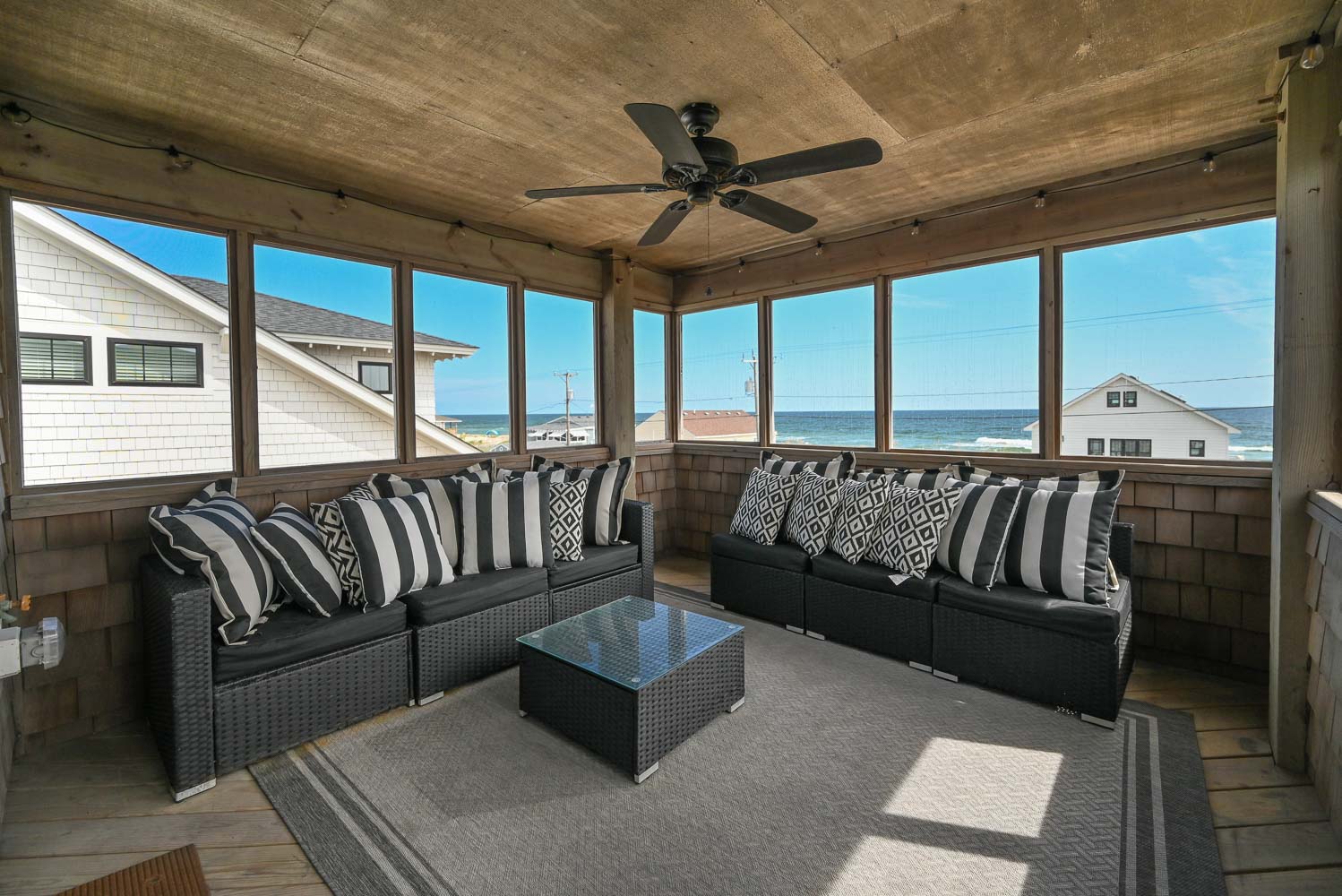 Level Two: 3 Bedrooms (Ocean Facing Private Suite w/King, TV, Full Bath w/Walk-In Shower, Direct Access to Covered Deck w/Ocean Views; Ocean Facing Private Suite w/King, TV, Full Bath w/Walk-In Shower; Private Suite w/2 Singles, TV, Full Bath w/Tub/Shower), and Covered Deck w/Deck Furniture and Ocean Views.