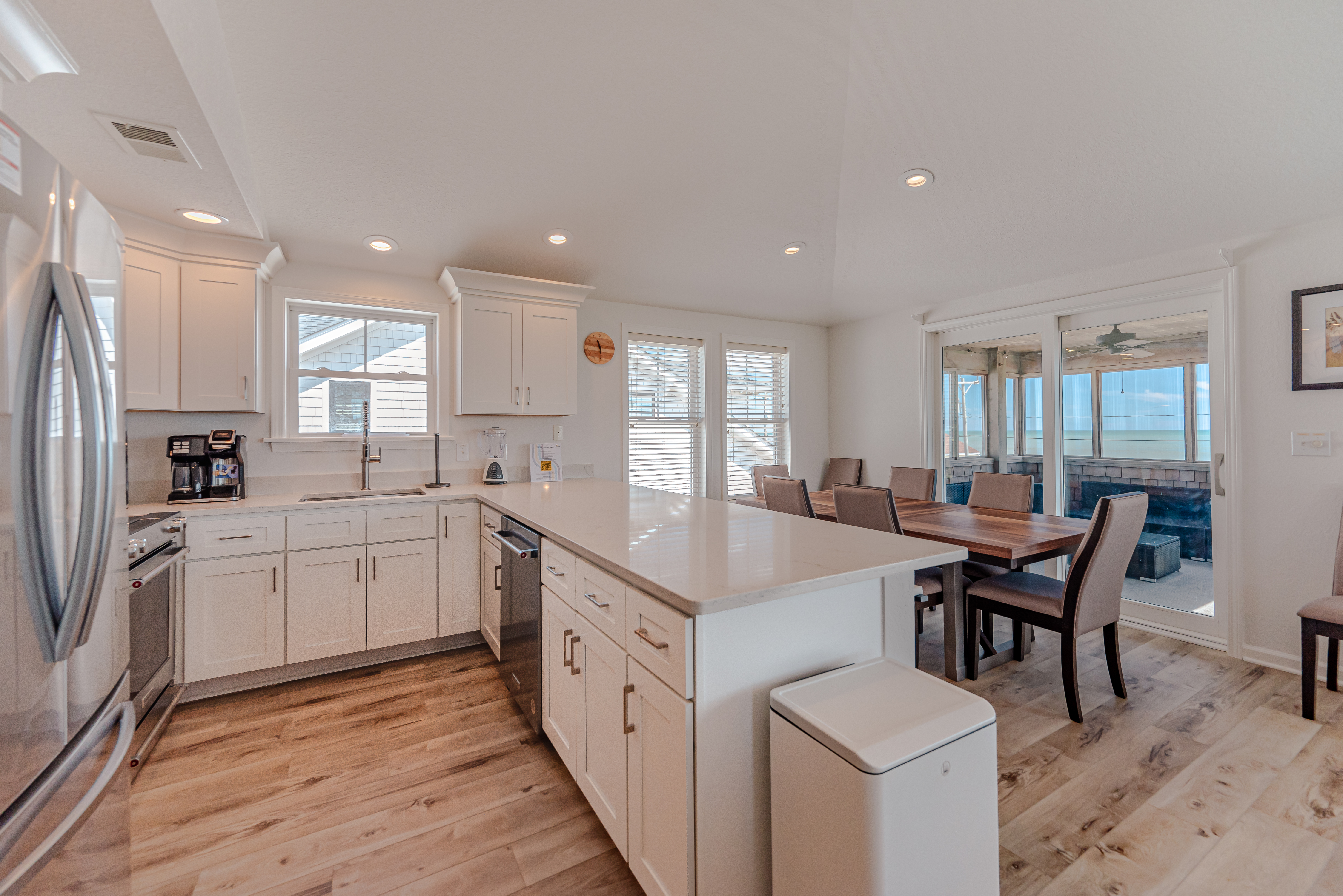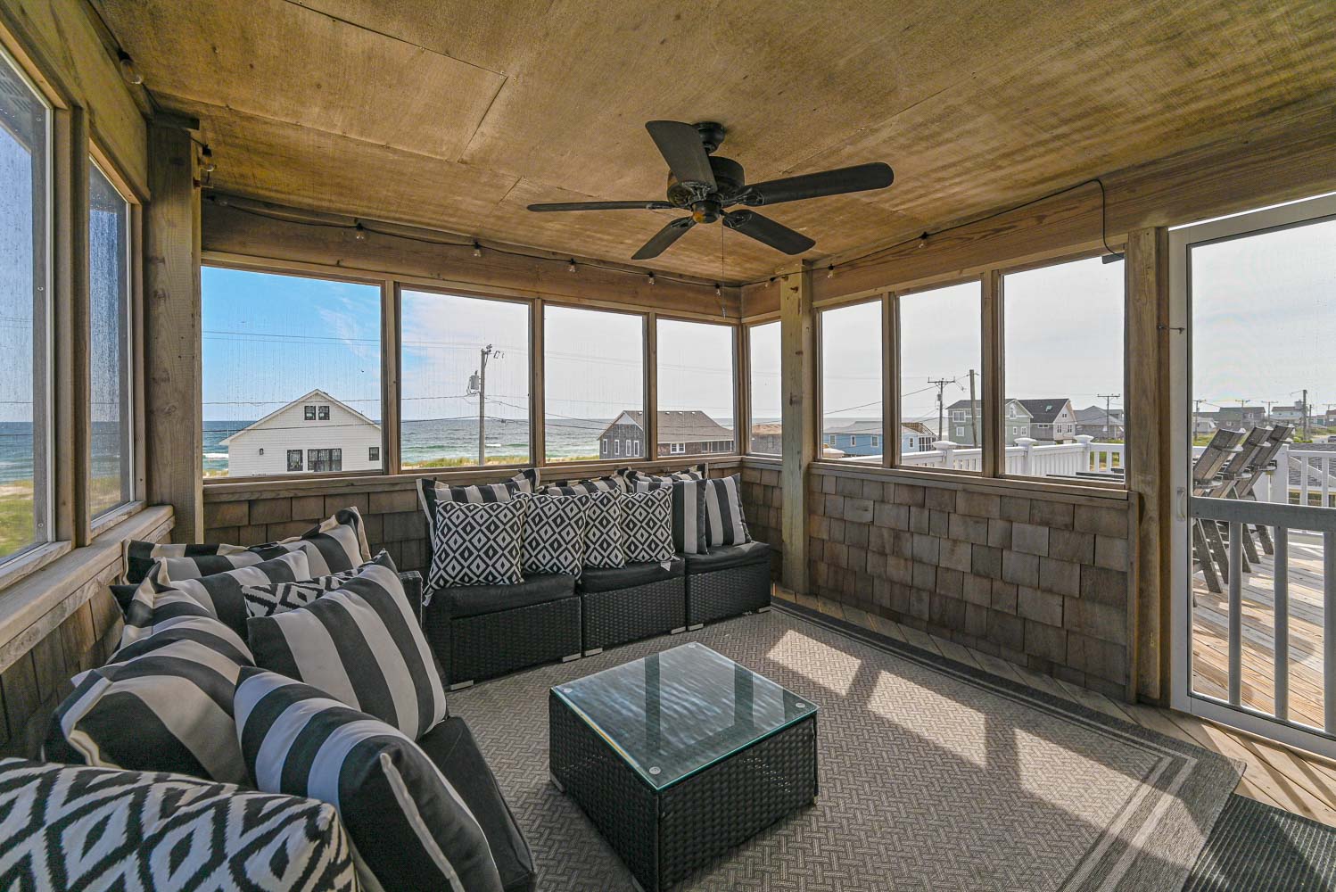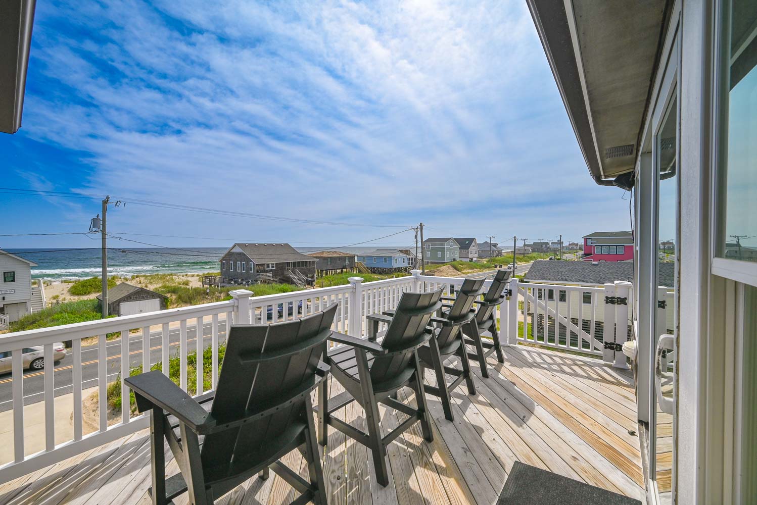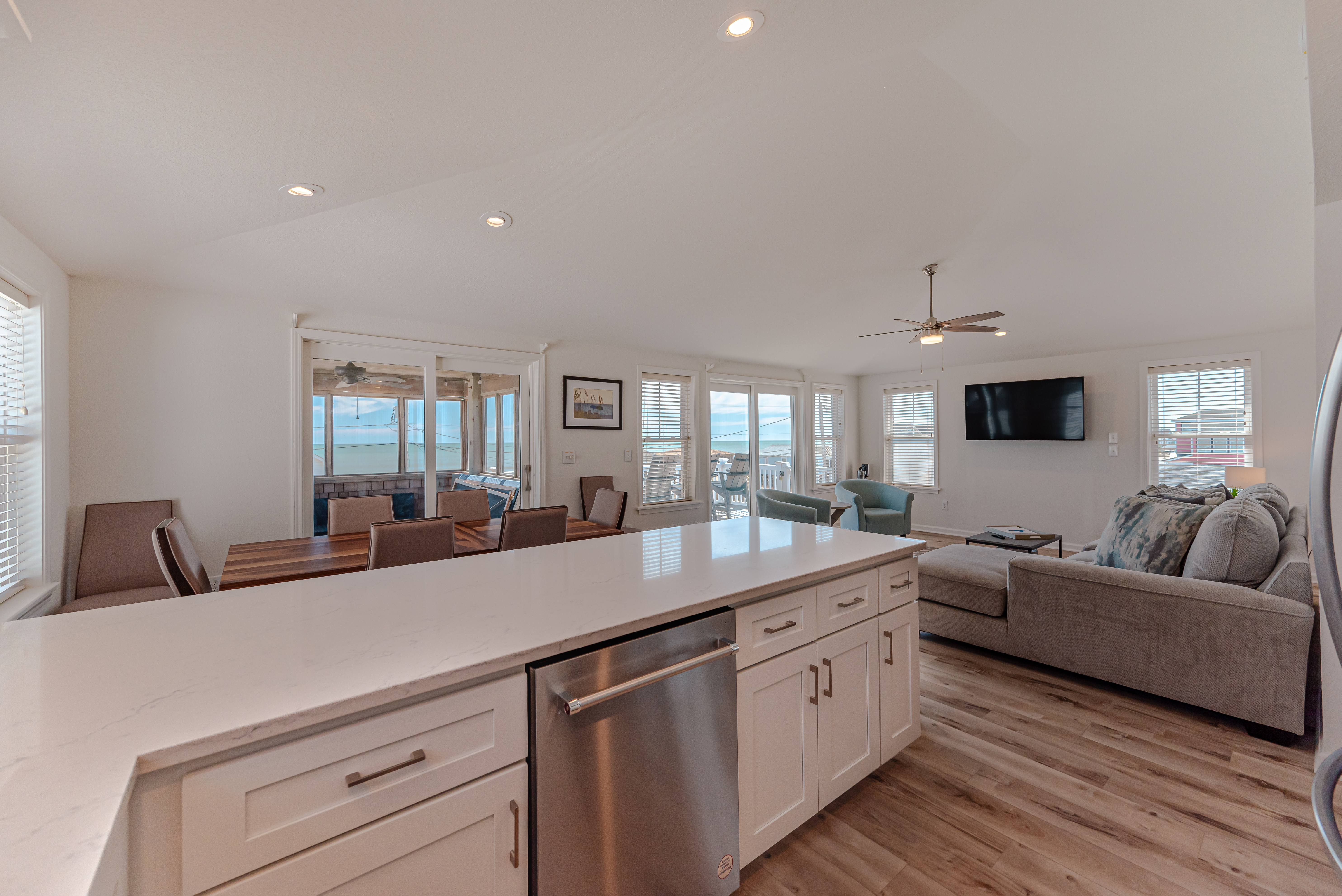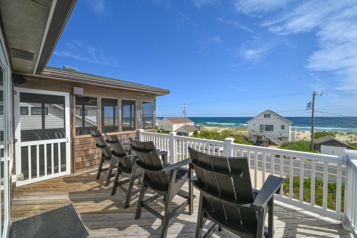Top Level: Living Area, TV, Fantastic Ocean Views, Full Equipped Kitchen Granite Counters, Stainless Steel Appliances, Breakfast Bar Seating for Four (4), Dining Area w/Seating for Eight (8), Bedroom w/King, TV, Full Bath, Walk-In Tiled Shower, Access to Screen Porch, Seating, and Sun Deck w/Adirondack Chairs and Lovely Ocean Views.