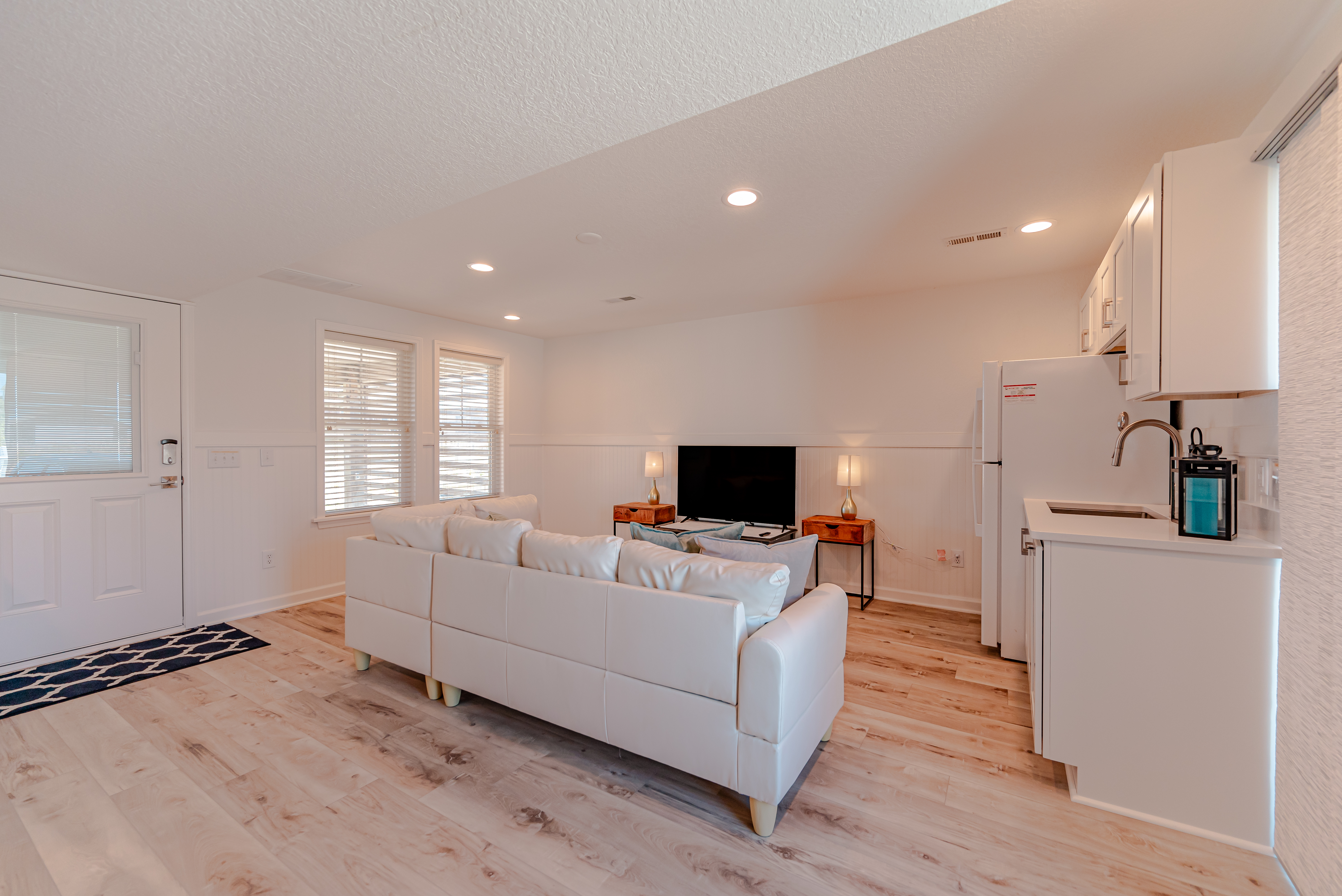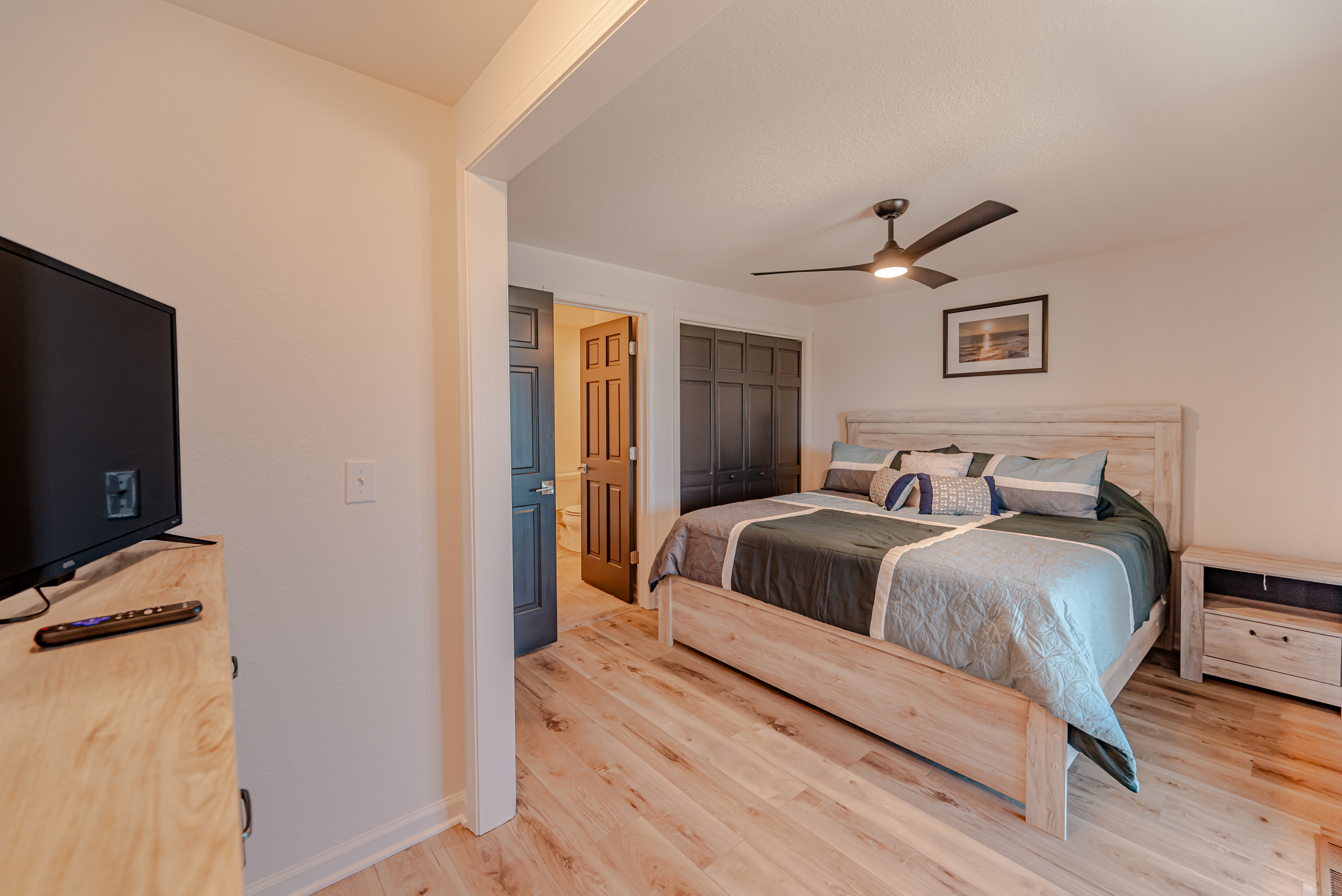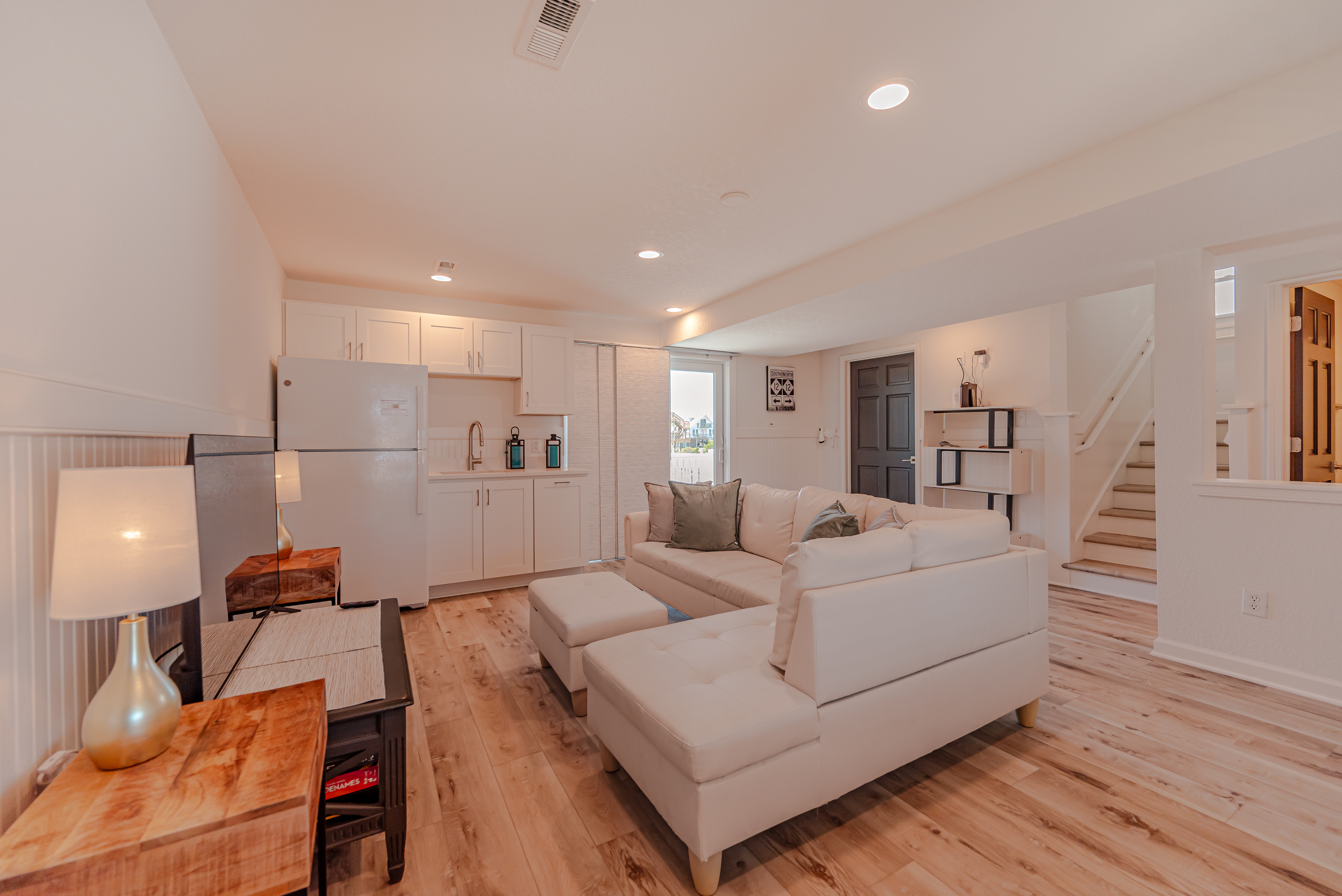 Level One: Spacious Den w/Large TV, Wet Bar w/Full Size Refrigerator, Bedroom w/King, TV, Full Hall Bath, and Sun Deck w/Hot Tub.