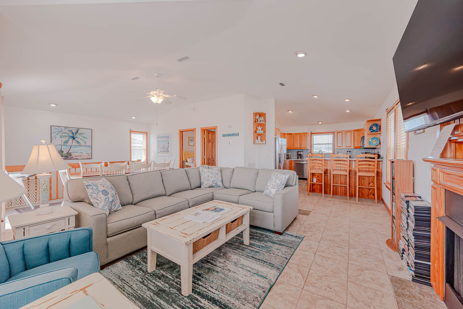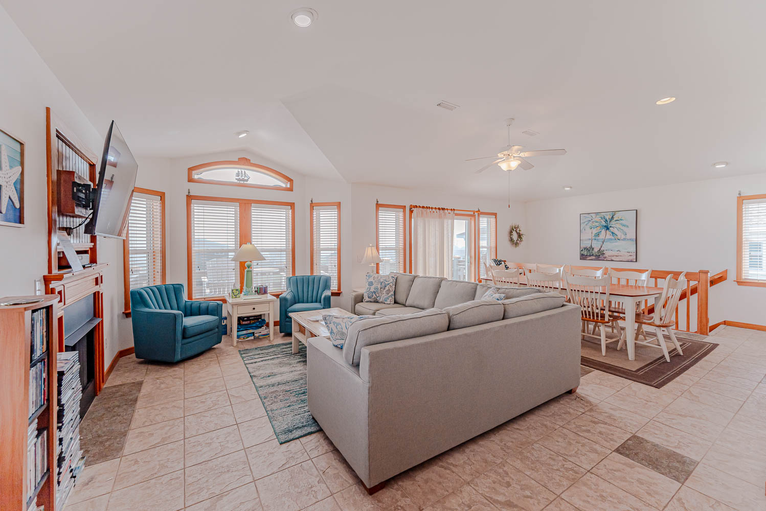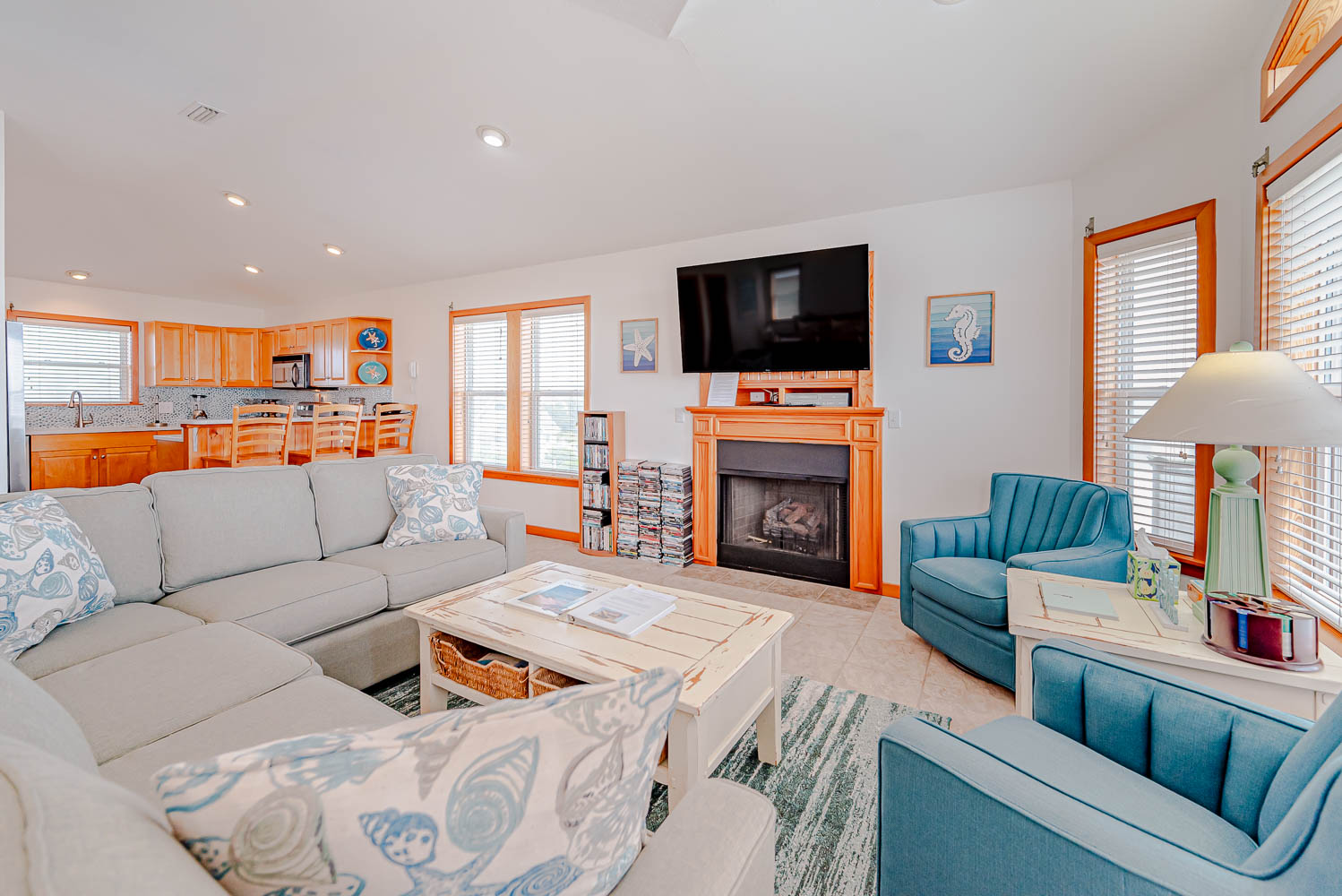 Top Level: Beautifully Decorated Living/Dining/Kitchen Area featuring Outstanding Ocean Views, Flat Screen TV Entertainment System w/DVD, Tile Floors, Stainless Steel Appliances, Gas Fireplace, Half Bath, Private Suite w/King, Flat Screen TV, DVD, & Full Bath, Sun Deck, & Covered Deck.