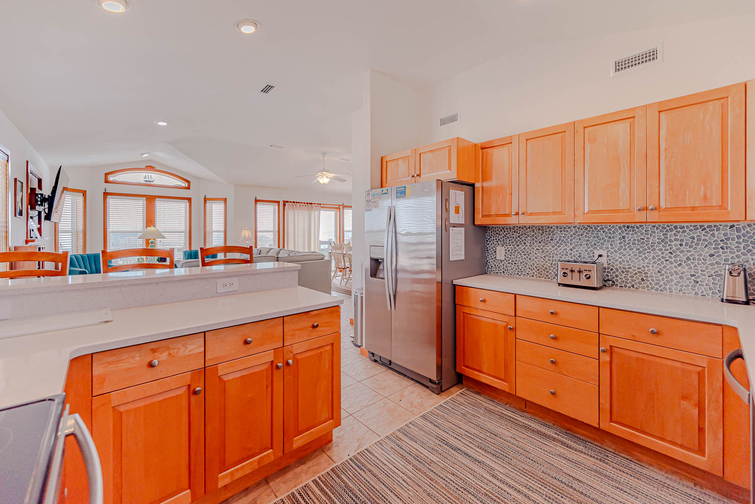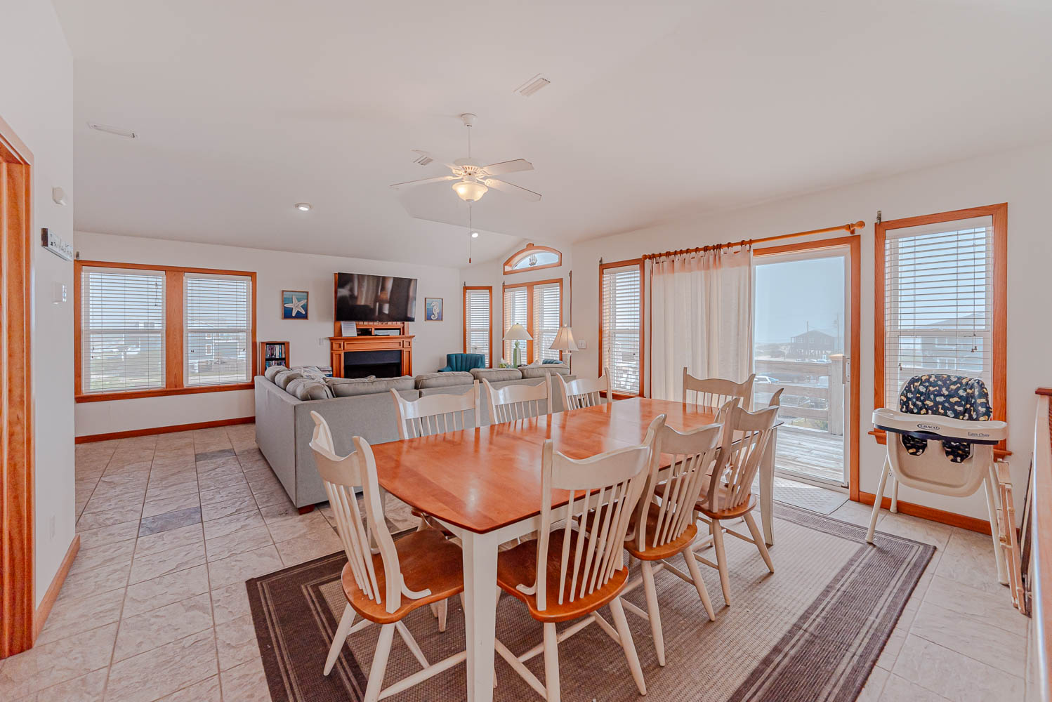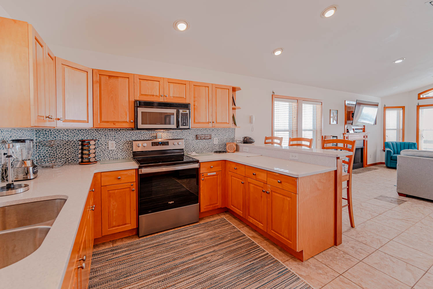Top Level: Beautifully Decorated Living/Dining/Kitchen Area featuring Outstanding Ocean Views, Flat Screen TV Entertainment System w/DVD, Tile Floors, Stainless Steel Appliances, Gas Fireplace, Half Bath, Private Suite w/King, Flat Screen TV, DVD, & Full Bath, Sun Deck, & Covered Deck.
