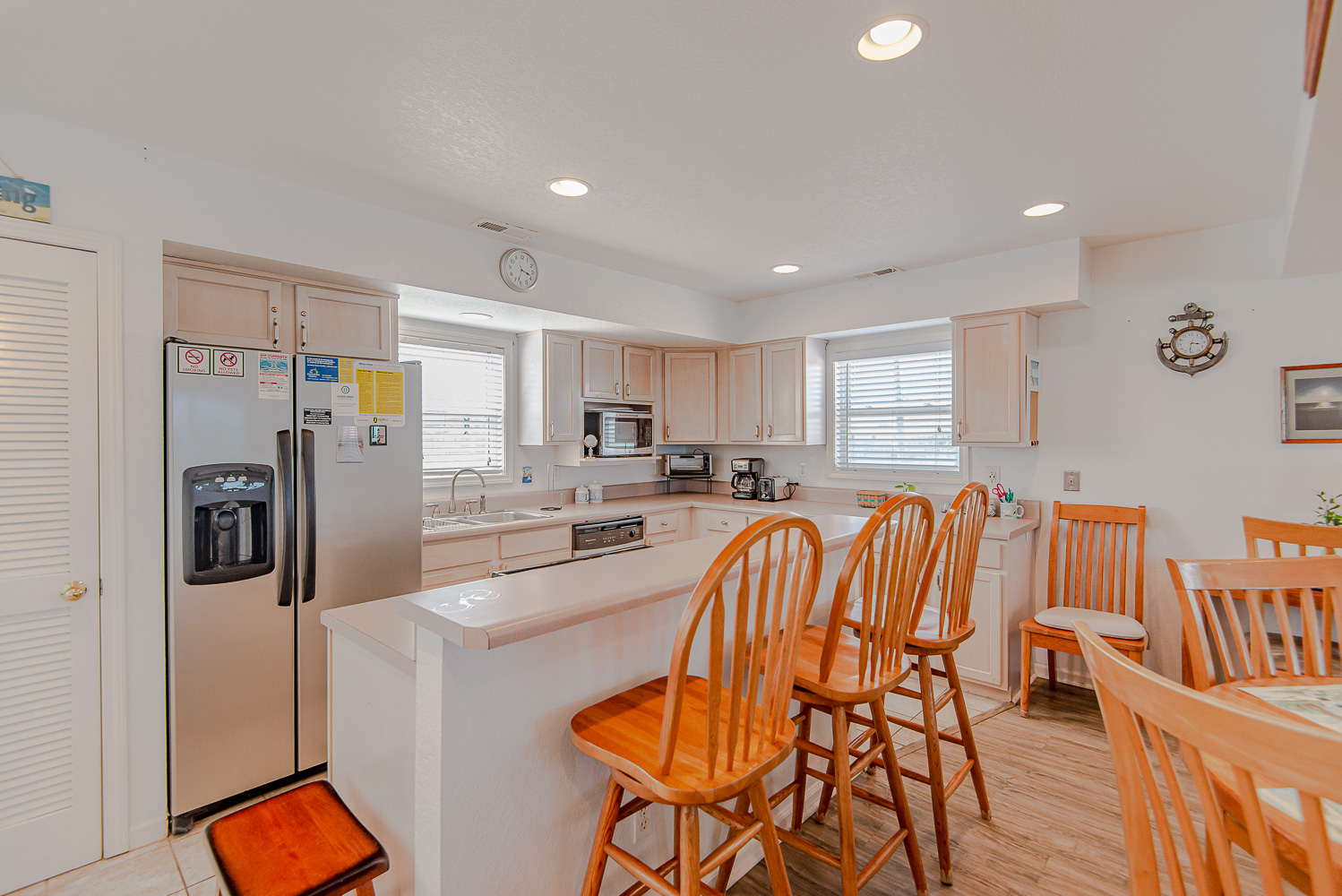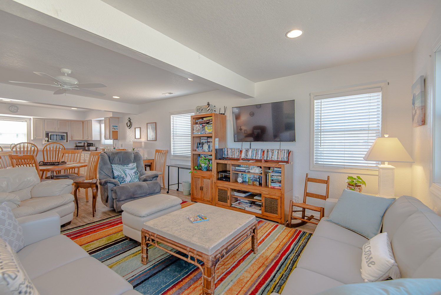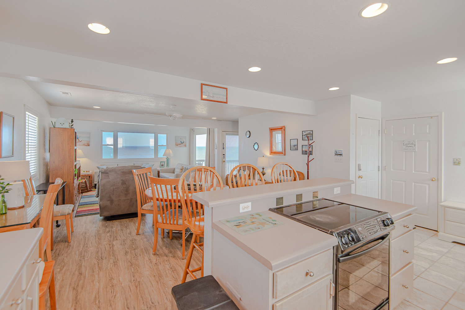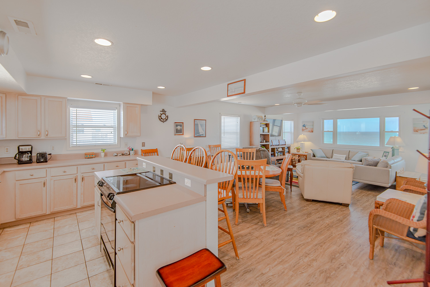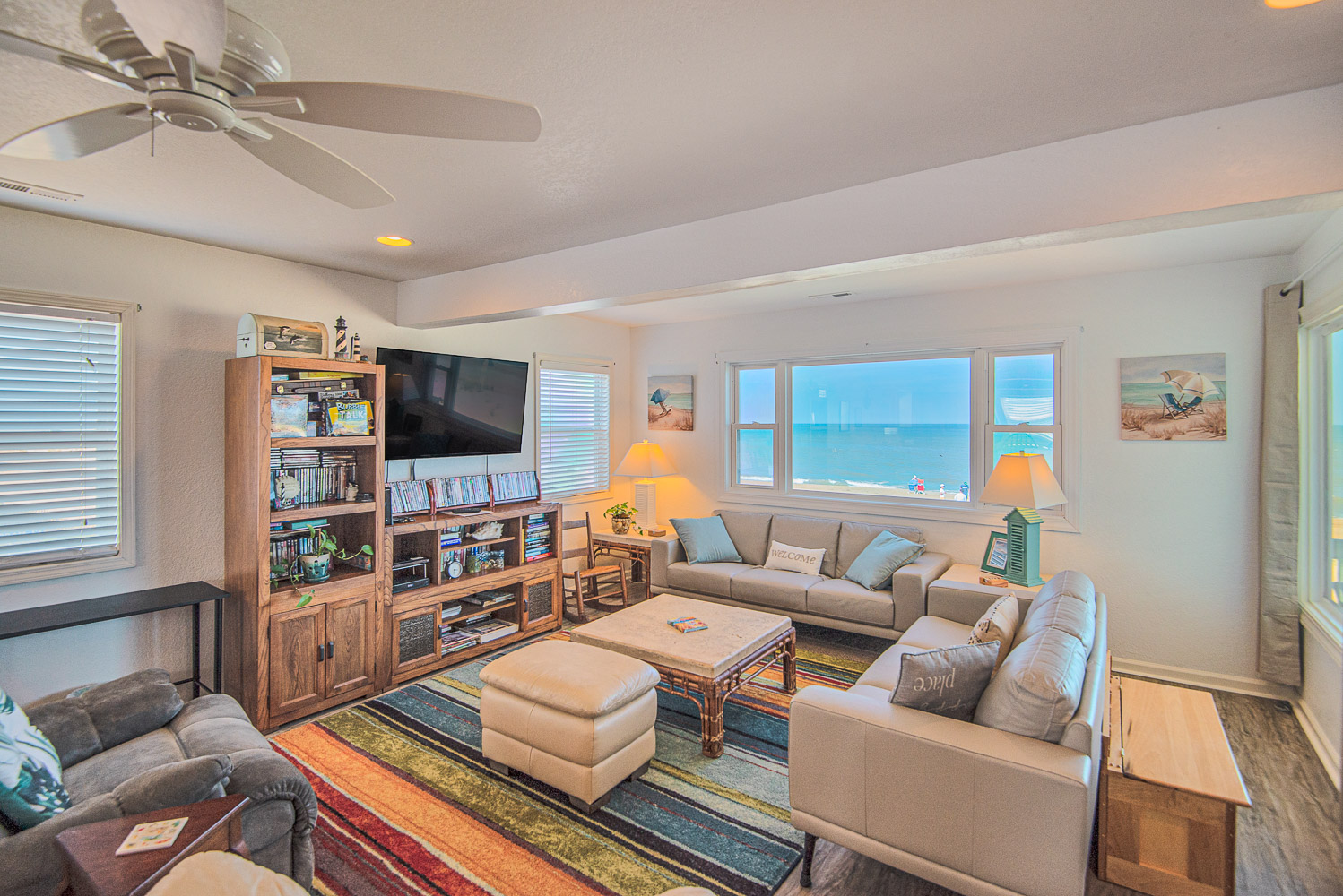 Mid Level: Living Area, Entertainment Center w/55 Inch Flat Screen TV, Ocean Views, Kitchen Area, Bar Seating for 3, Dining Area w/Seating for 6, Two (2) Large Oceanfront Picture Windows w/Outstanding Ocean Views, Half Bath, Private Suite w/Queen, Flat Screen TV, and Full Bath w/Tub/Shower, and Oceanfront Covered Deck w/Furniture, and Outstanding Ocean and Beach Views.