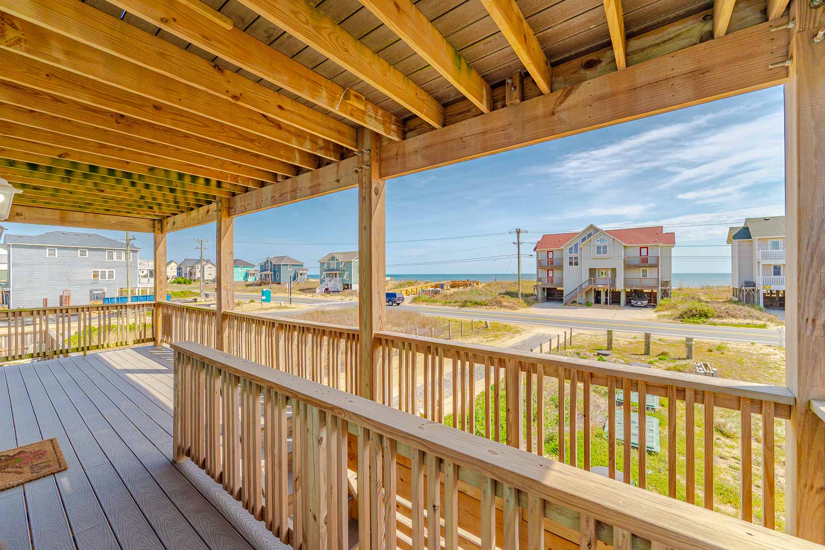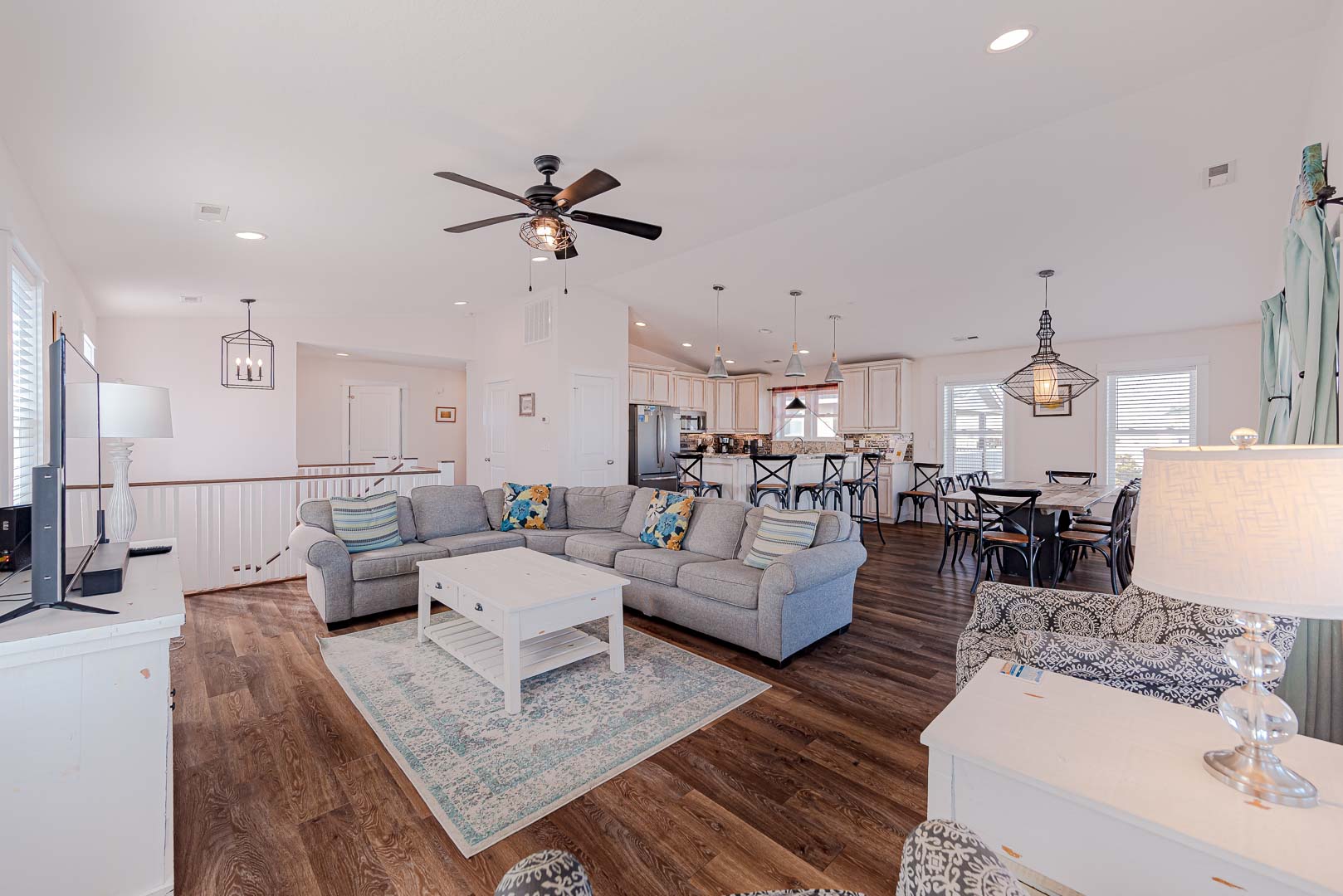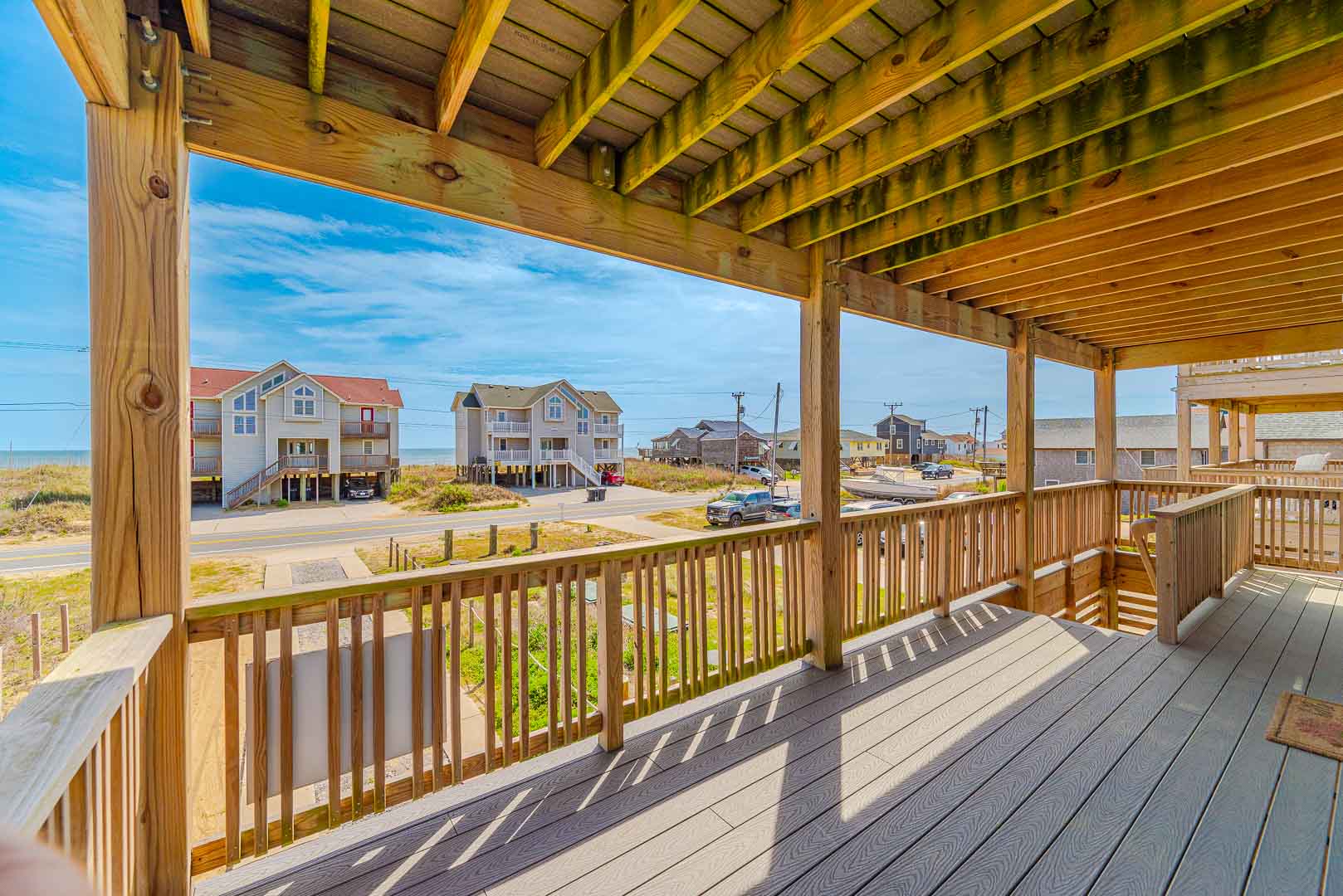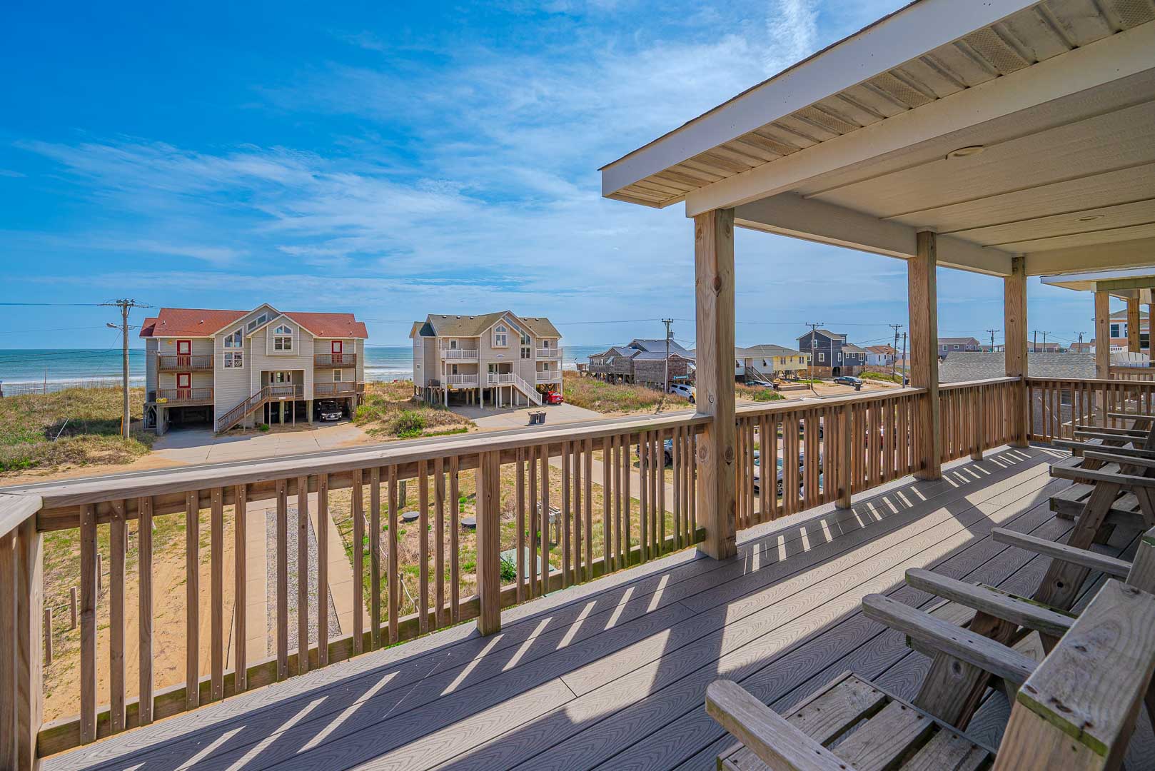 Top Level: Living Area, TV, Excellent Ocean Views, Fully Equipped Kitchen Area, Island Bar w/Seating for Four (4), Dining Area w/Seating for Ten (10), Half Bath, 2 Bedroom (Private Suite w/King, TV, Full Bath (Shower); Private Suite w/Queen, TV, Full Bath w/Tub/Shower), and Access to Covered Deck and Sun Deck both w/Deck Furniture and Ocean Views.