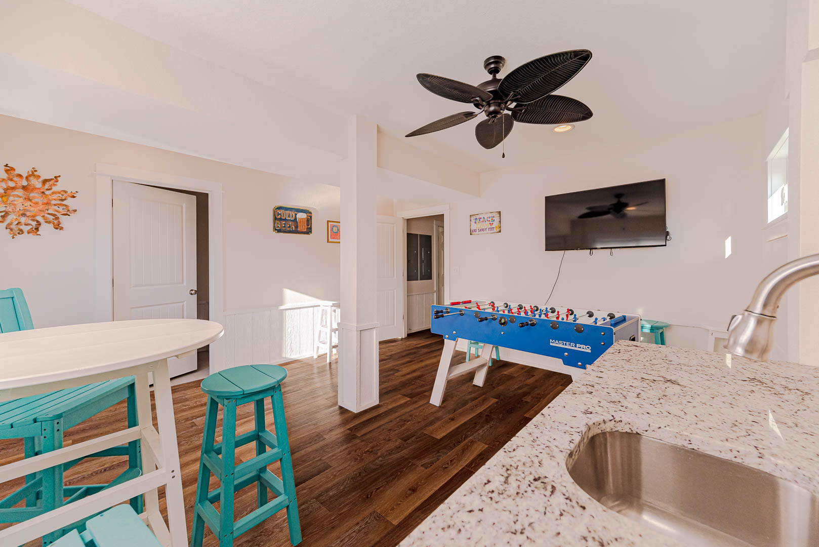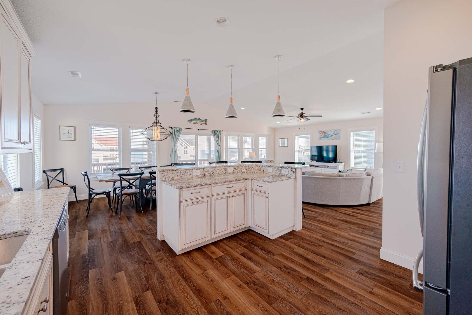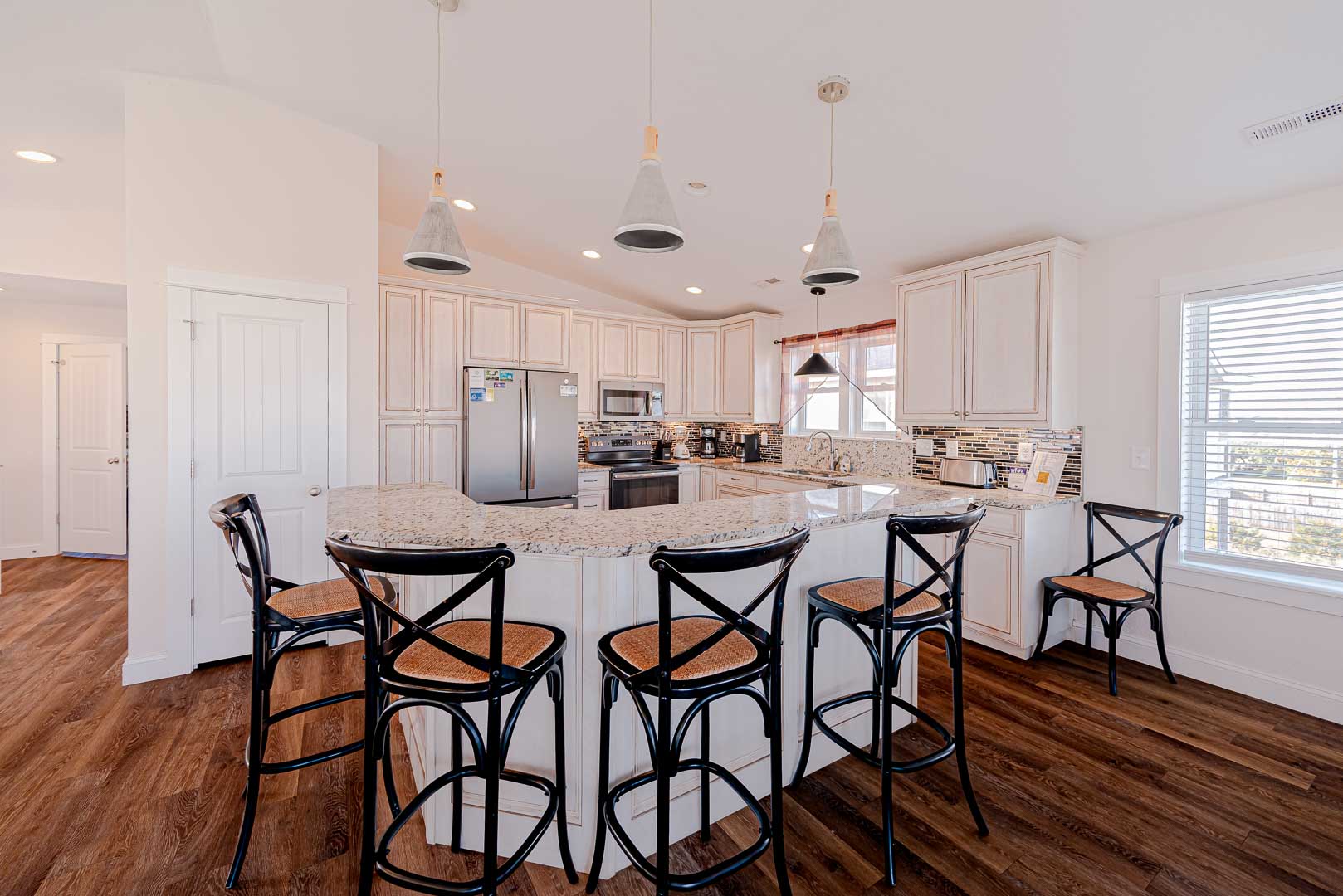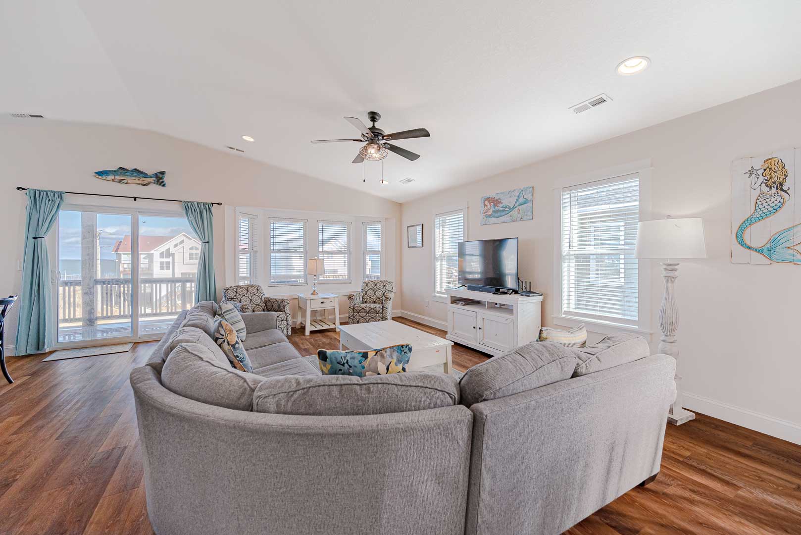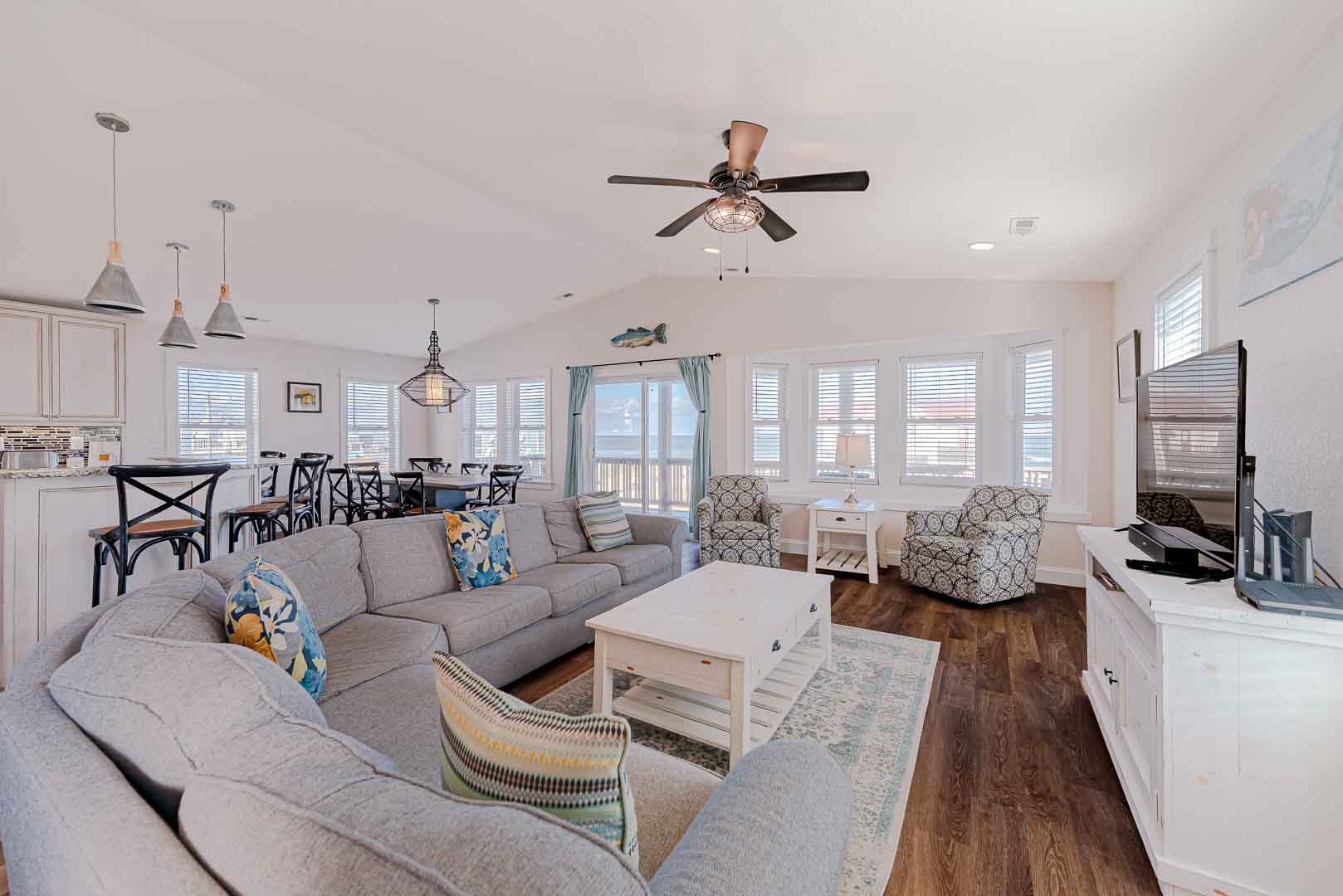 Top Level: Living Area, TV, Excellent Ocean Views, Fully Equipped Kitchen Area, Island Bar w/Seating for Four (4), Dining Area w/Seating for Ten (10), Half Bath, 2 Bedroom (Private Suite w/King, TV, Full Bath (Shower); Private Suite w/Queen, TV, Full Bath w/Tub/Shower), and Access to Covered Deck and Sun Deck both w/Deck Furniture and Ocean Views.