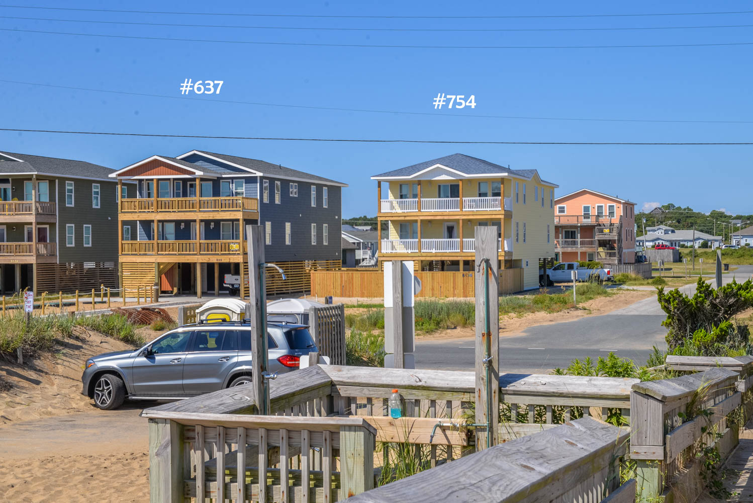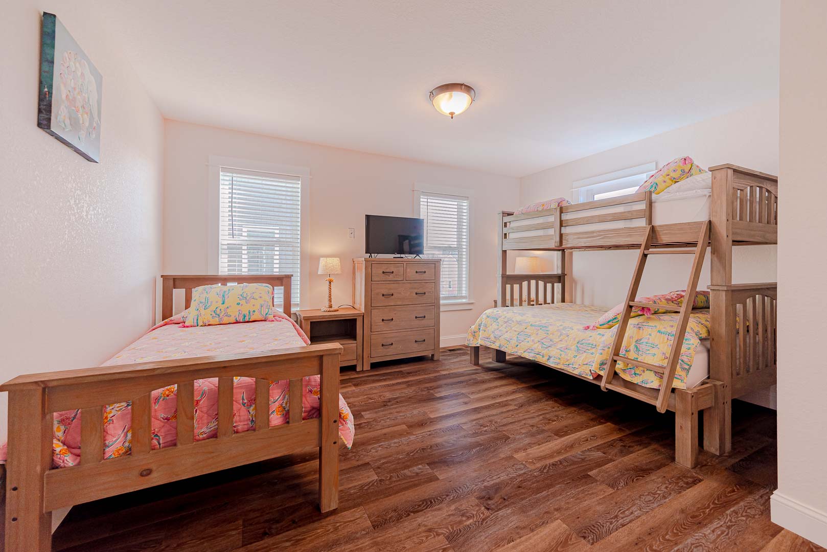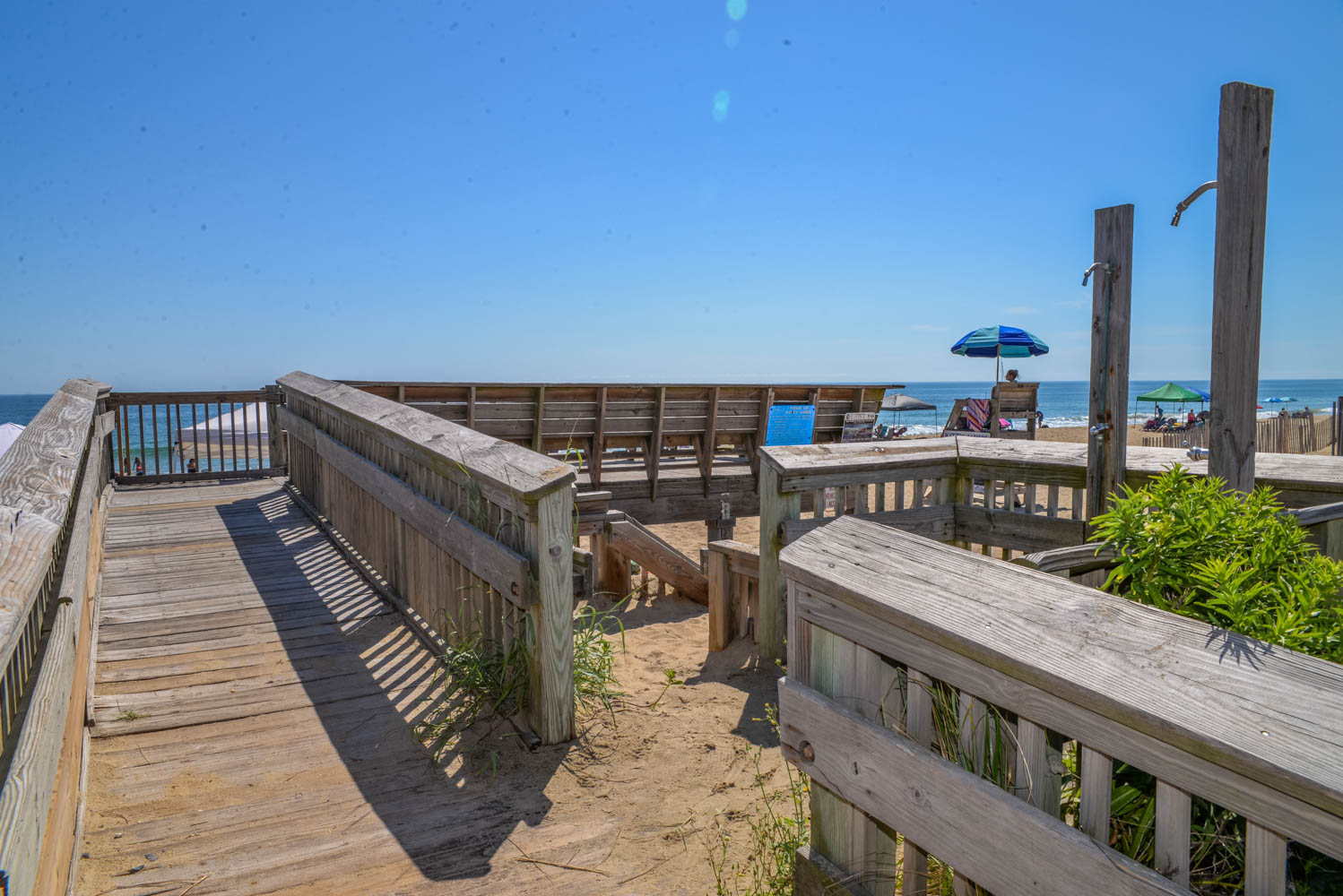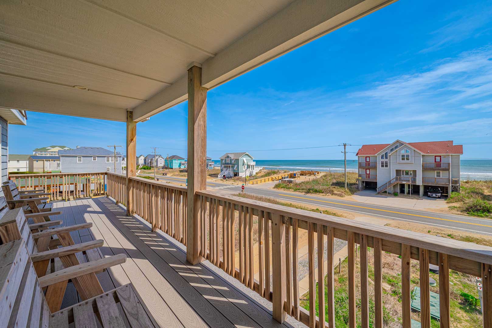 Mid Level: 4 Bedroom Suites (3 w/Kings, TVs, Full Baths w/Shower; 1 w/Duo Bunk, Single, TV, Full Bath w/Tub/Shower), Laundry Area, and Covered Deck w/Ocean Views and Rope Hammock Swing.