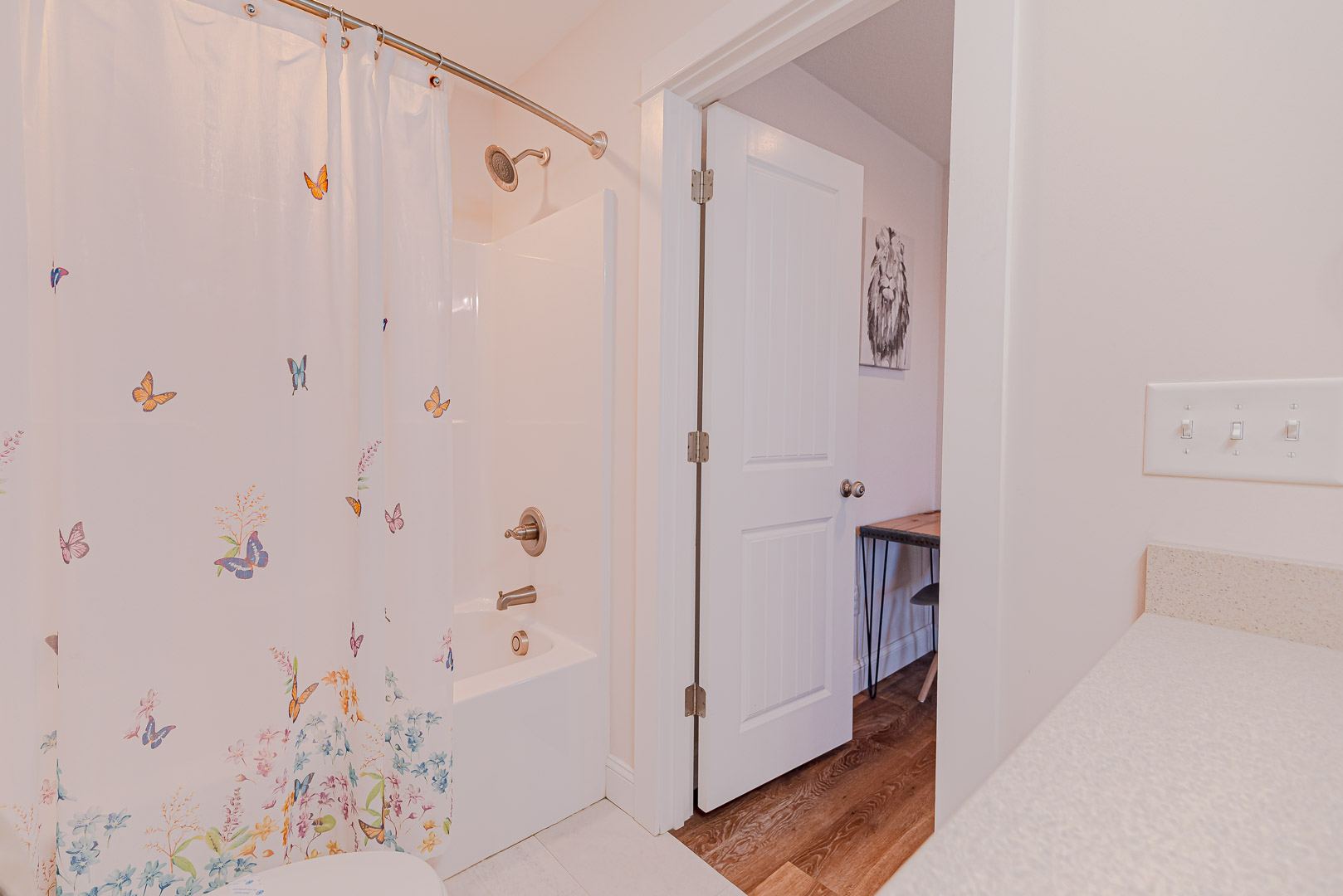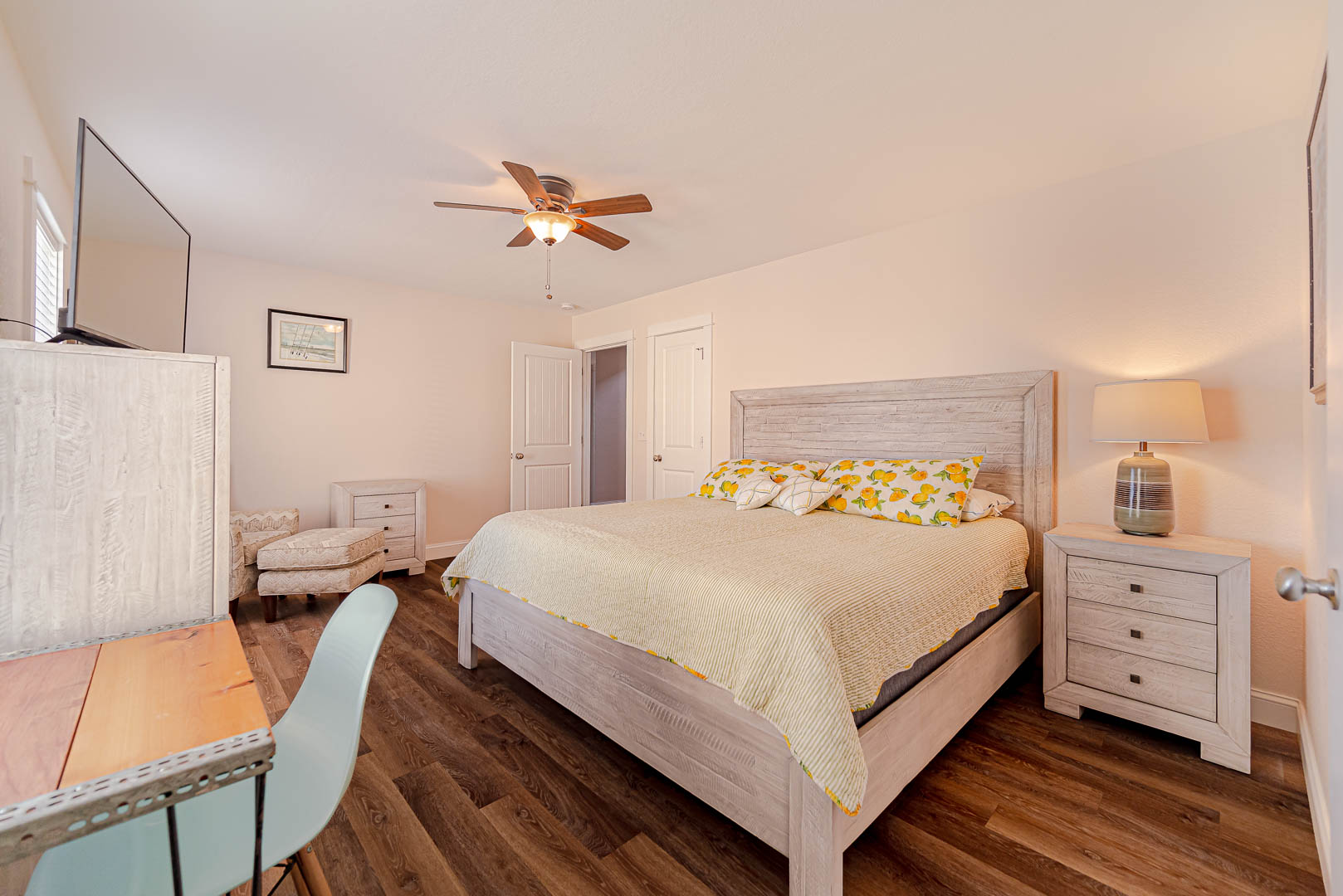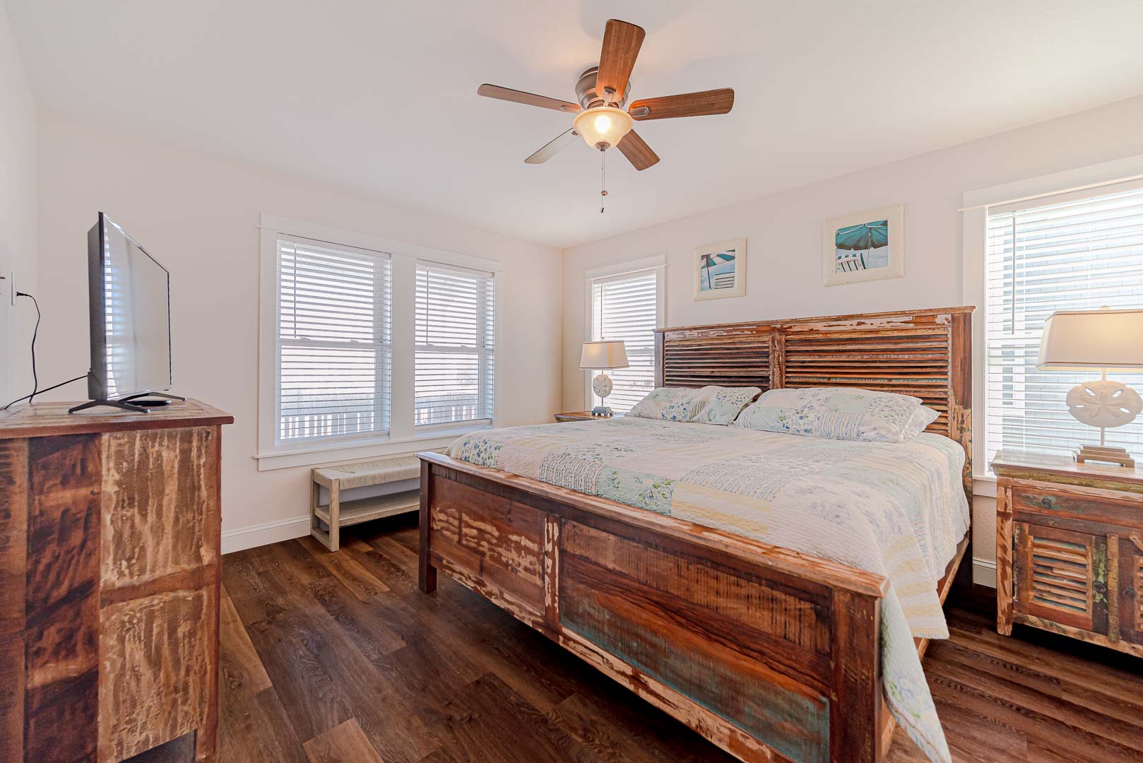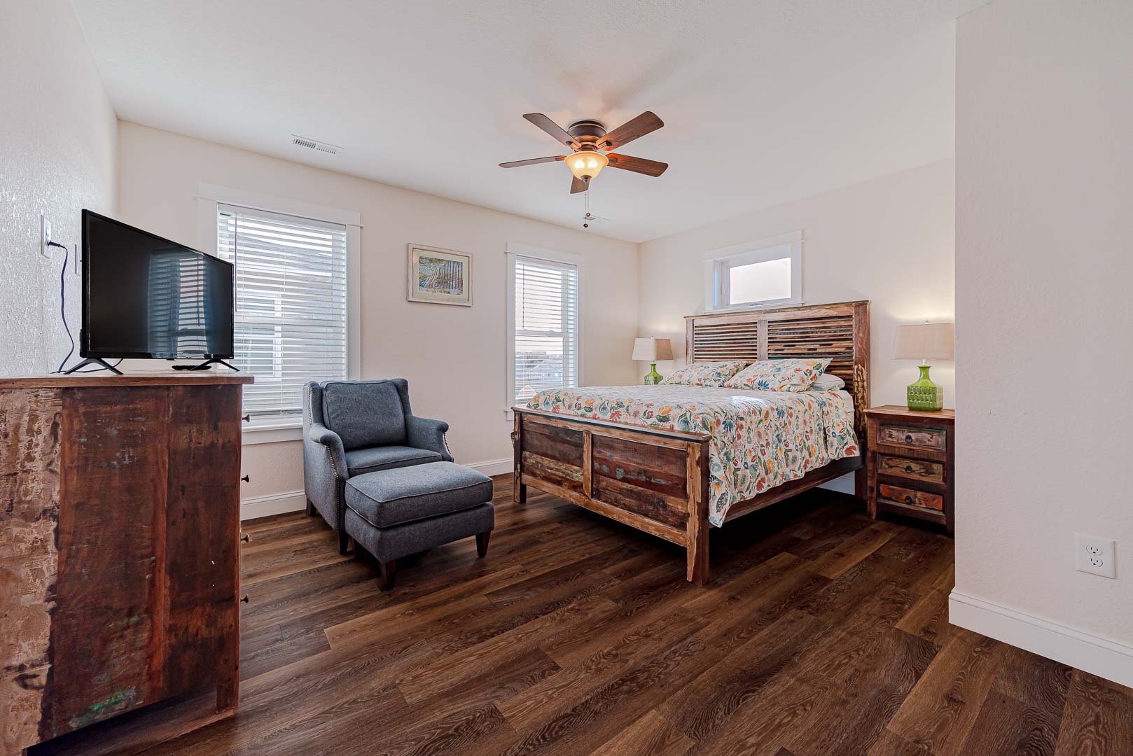 Mid Level: 4 Bedroom Suites (3 w/Kings, TVs, Full Baths w/Shower; 1 w/Duo Bunk, Single, TV, Full Bath w/Tub/Shower), Laundry Area, and Covered Deck w/Ocean Views and Rope Hammock Swing.