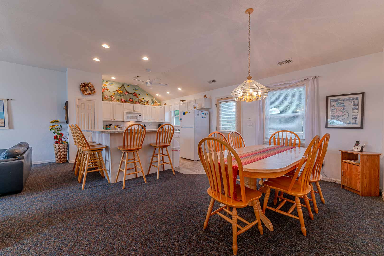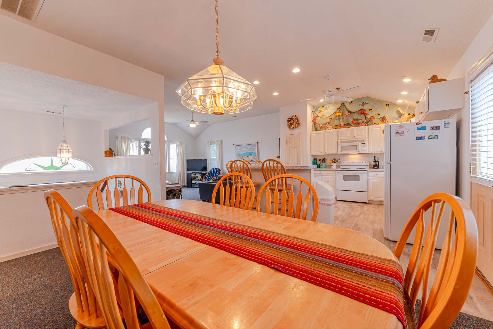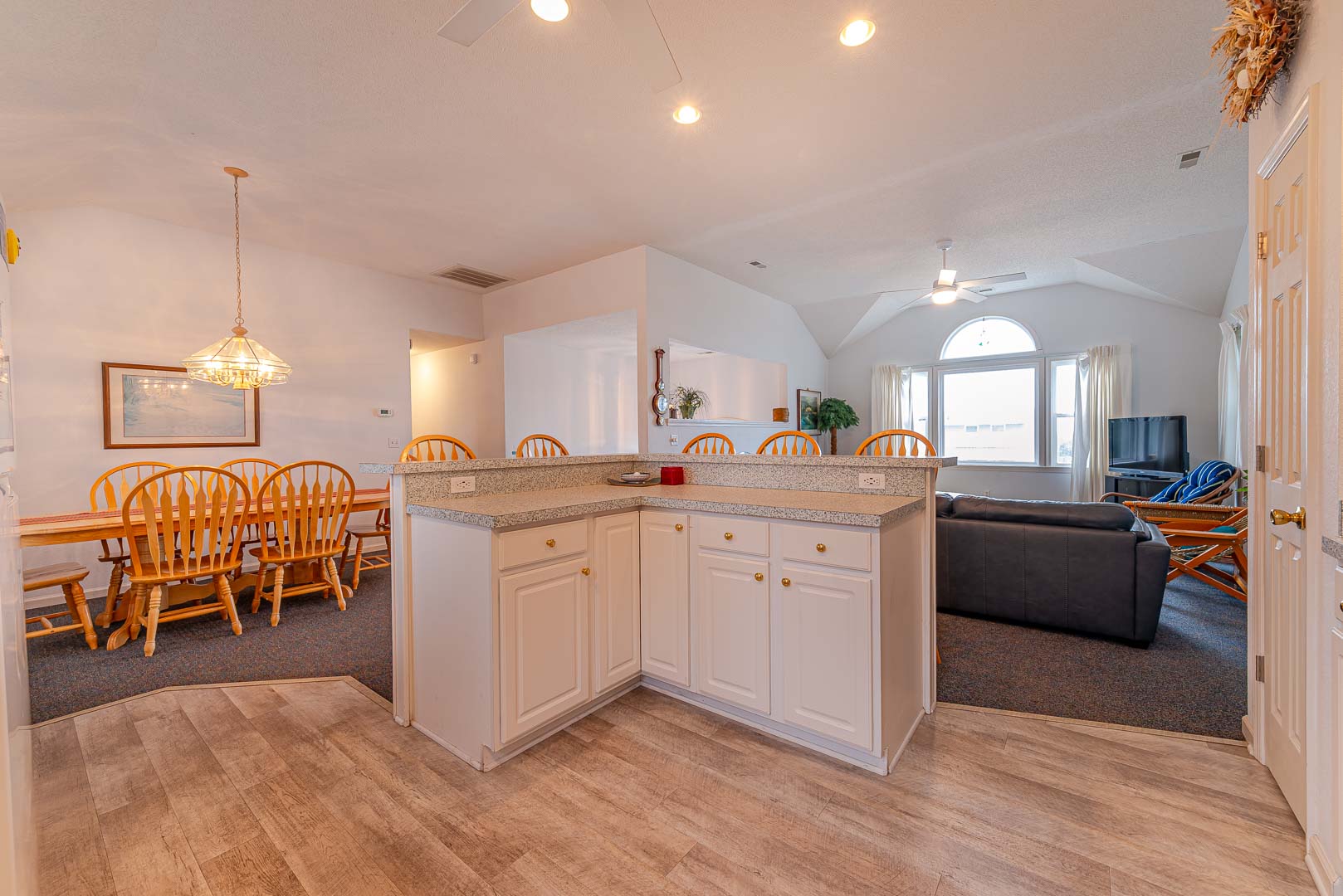 Main Level: Living Area, TV, DVD, Stereo w/CD, Kitchen Area w/Island Bar Seating, Dining Area w/Seating for Six (6), 3 Bedrooms (Private Suite, King, TV, Full Bath; 1 w/Queen, 1 w/Duo Bunk), Full Hall Bath w/Tub/Shower, and Sun Deck Overlooking Pool Area w/Deck Furniture.