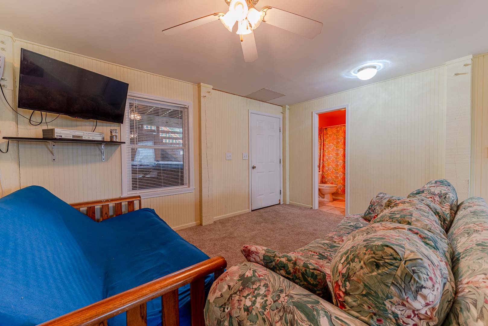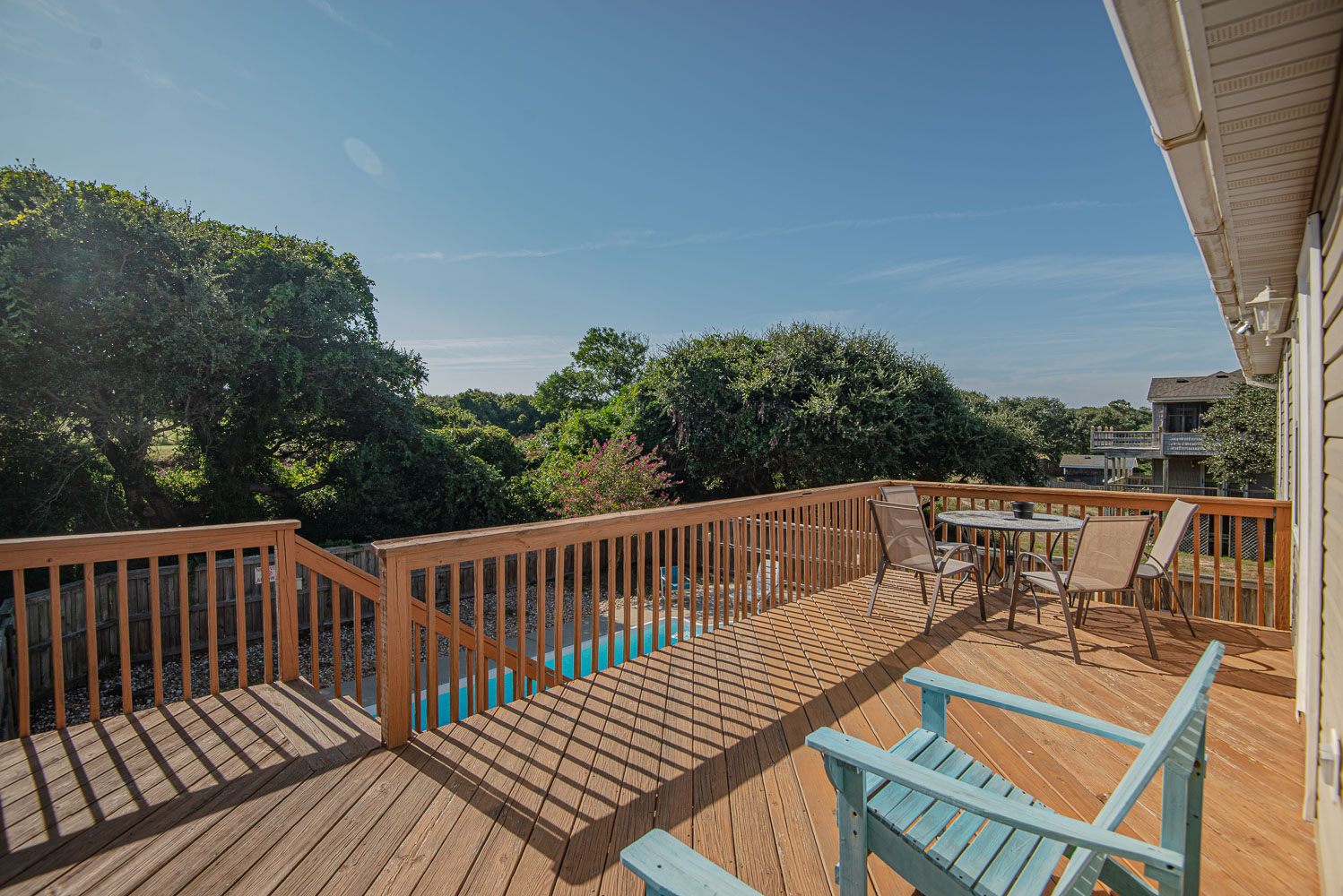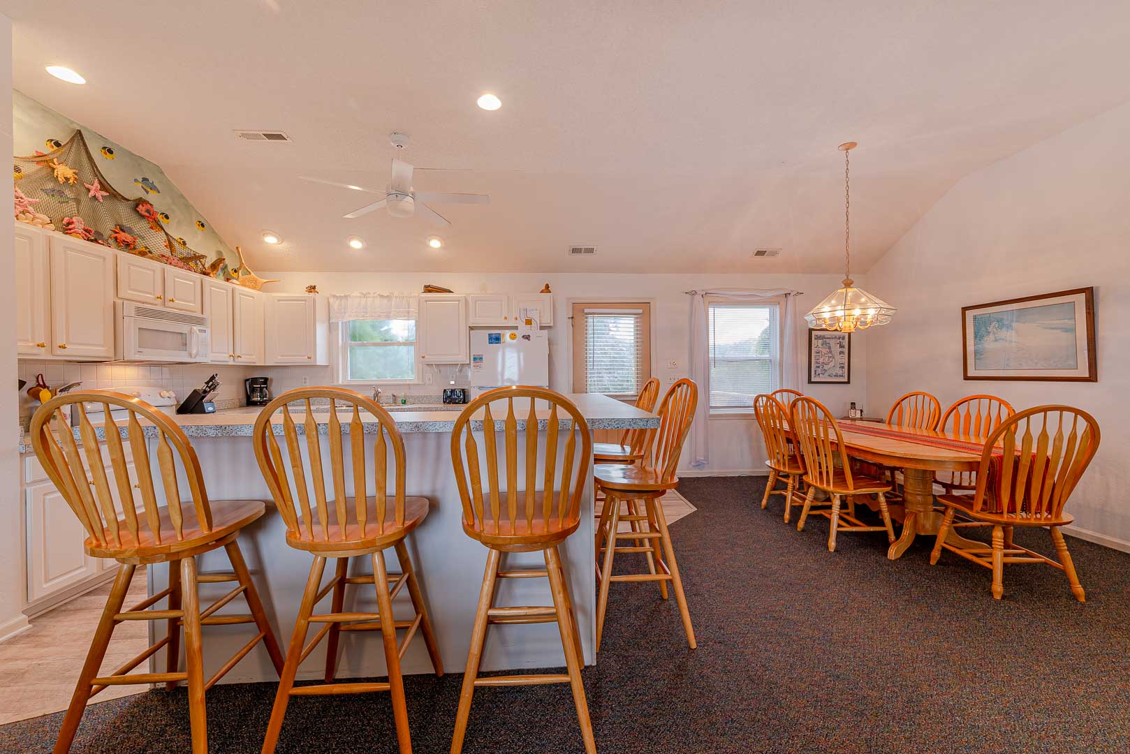 Main Level: Living Area, TV, DVD, Stereo w/CD, Kitchen Area w/Island Bar Seating, Dining Area w/Seating for Six (6), 3 Bedrooms (Private Suite, King, TV, Full Bath; 1 w/Queen, 1 w/Duo Bunk), Full Hall Bath w/Tub/Shower, and Sun Deck Overlooking Pool Area w/Deck Furniture.