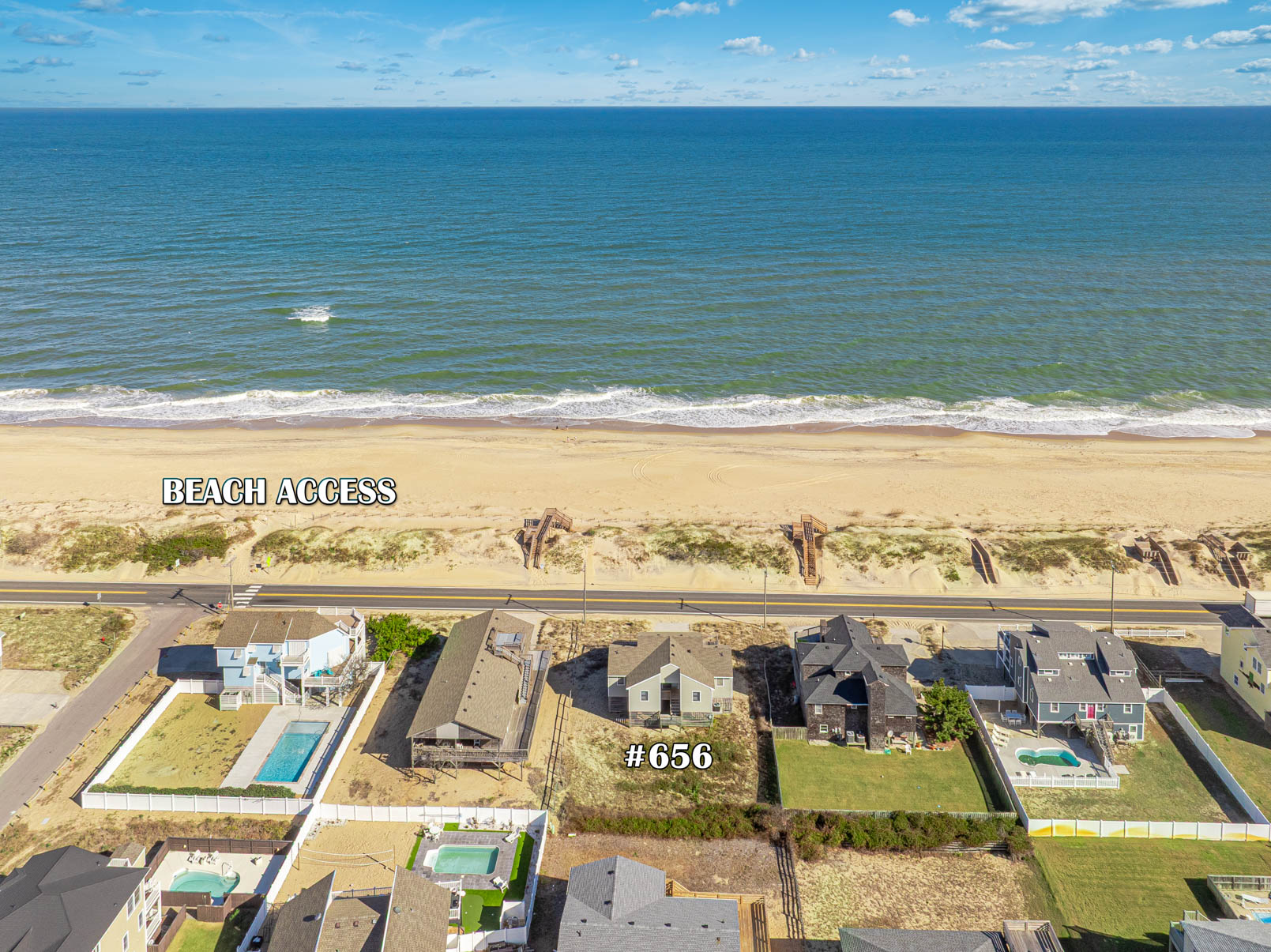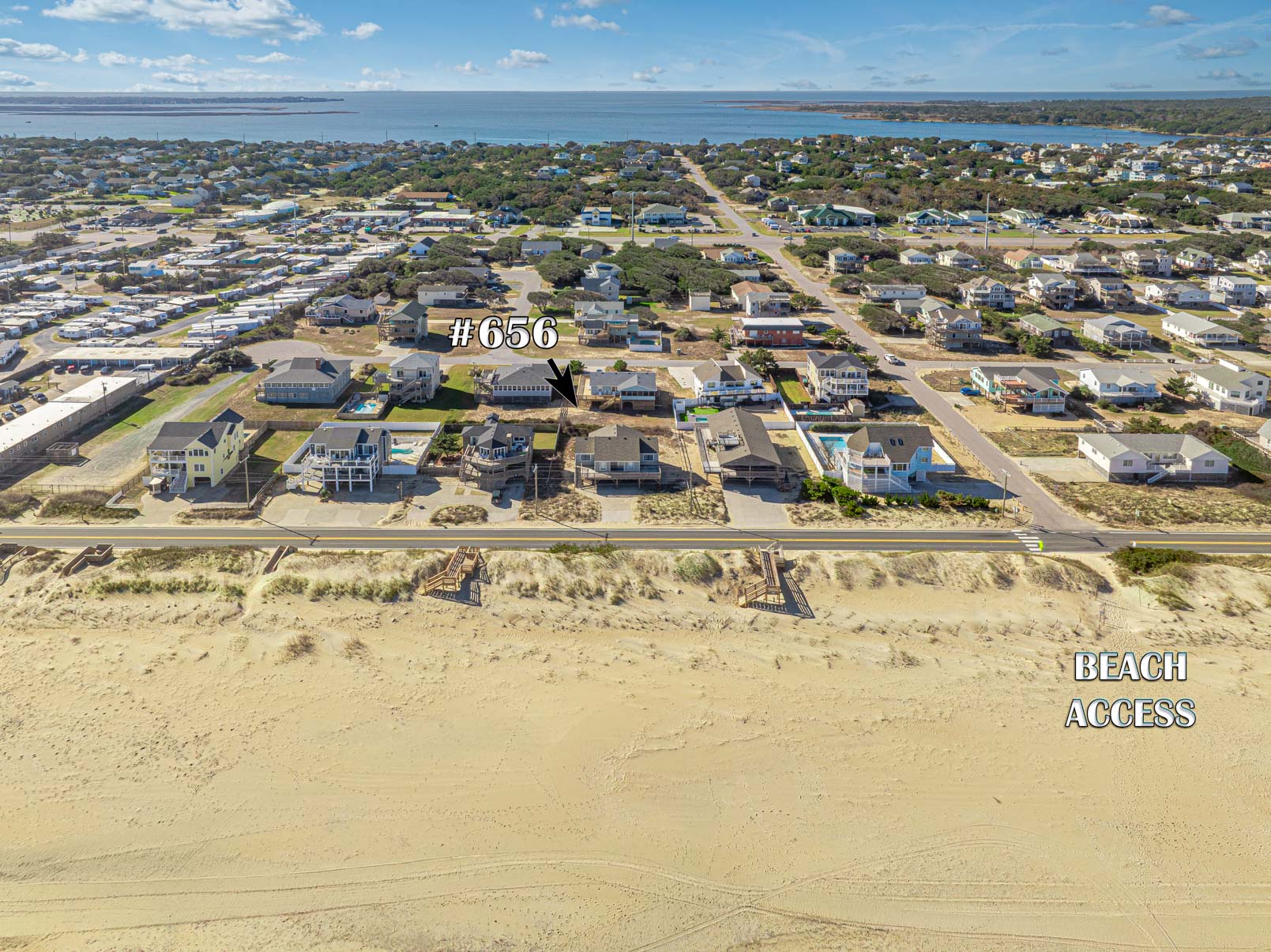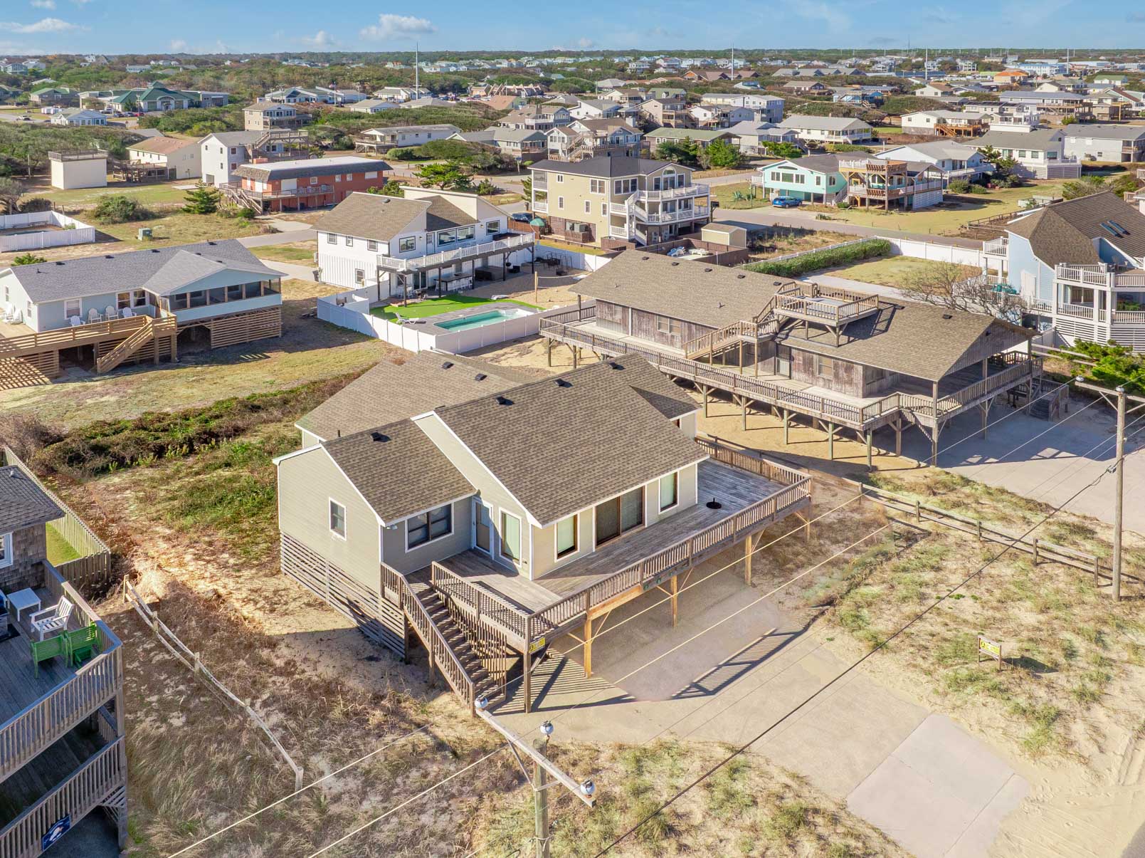 This comfortable Kitty Hawk Semi-Oceanfront home features a great location just across the street from the Ocean & is located only 220 feet from the Beach Access at Tateway Road. Nicely furnished & well-equipped, this offers the traditional plan with two bedrooms on each side that are seperated by the living/dining/kitchen areas. There is a large sun deck that provides horizon Ocean Views that is ideal for relaxing, & a great spot to enjoy the cool Atlantic breeze. The living area is bright and open with cathedral ceiling, large TV, breakfast bar w/seating in the kitchen and dining area.