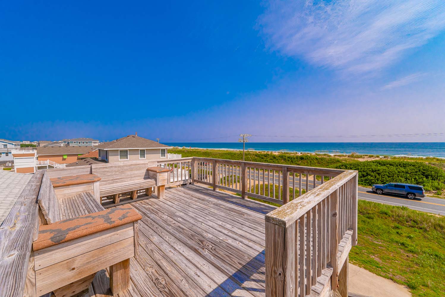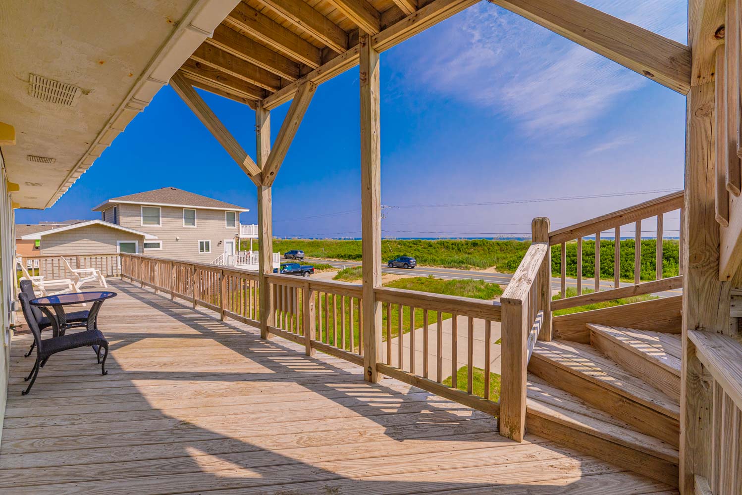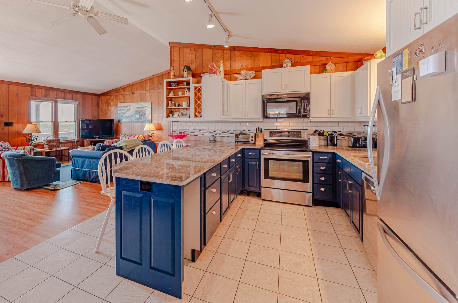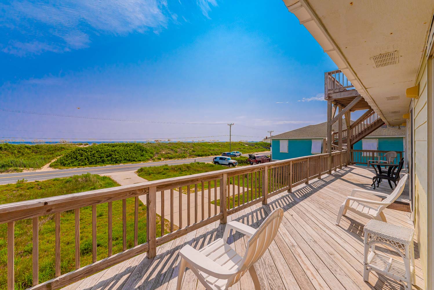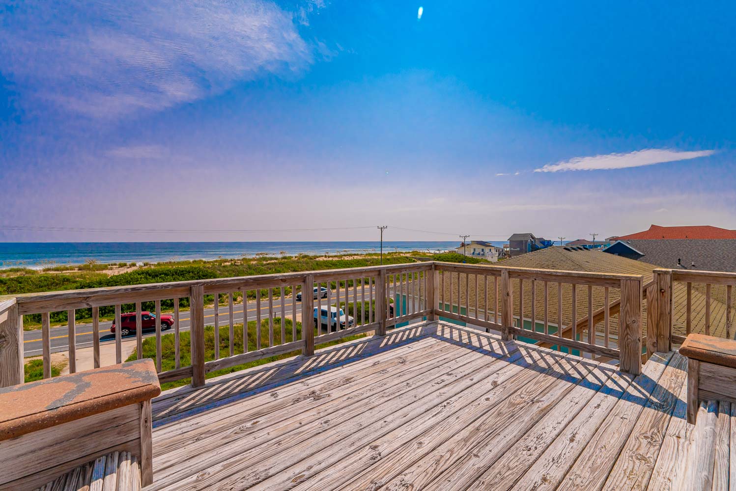 Level Two: Living/Dining/Kitchen Area, Fantastic Ocean Views, TV, DVD, Stereo w/CD, 3 Bedrooms (Private Suite w/Queen, TV, Full Bath; 1 w/2 Singles; 1 w/Double, Single), Full Bath, Screened Porch w/Picnic Table, and Sun Deck w/Steps to Observation Deck.