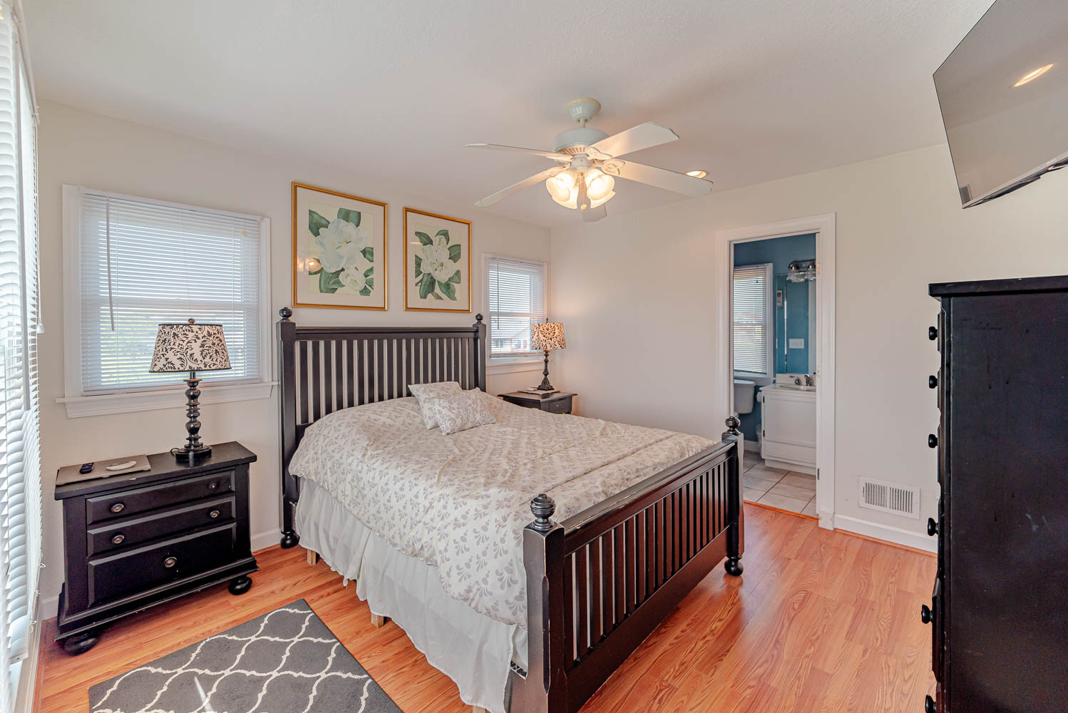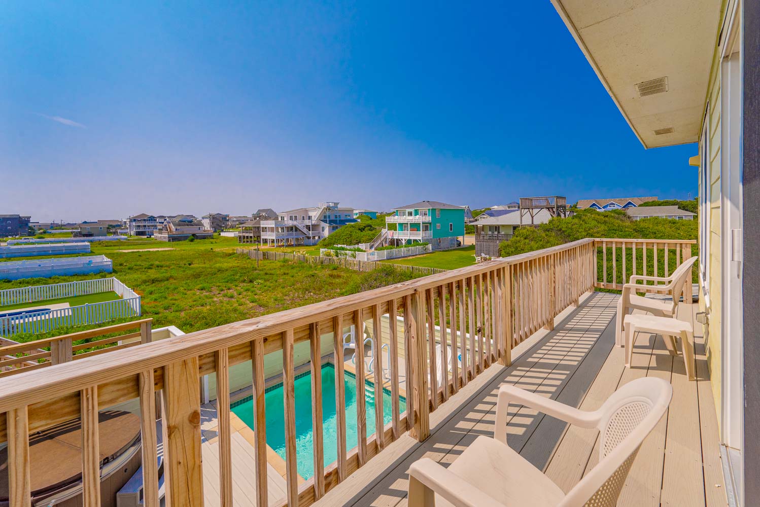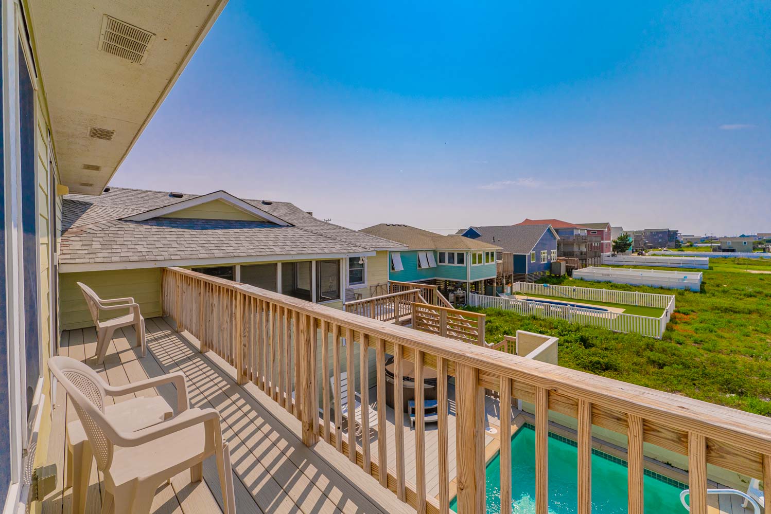 Top Level: 2 Bedrooms (2 Private Suites w/Queens, TVs, Full Baths) and Small Sun Deck Overlooking the Pool Area.
