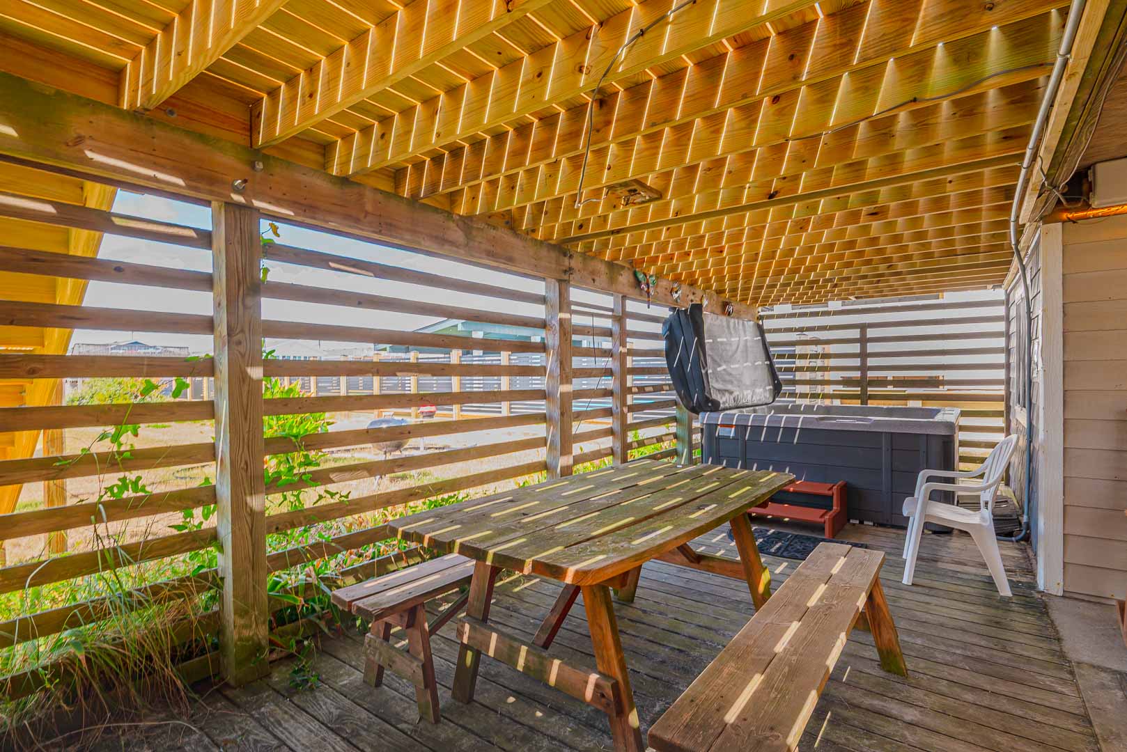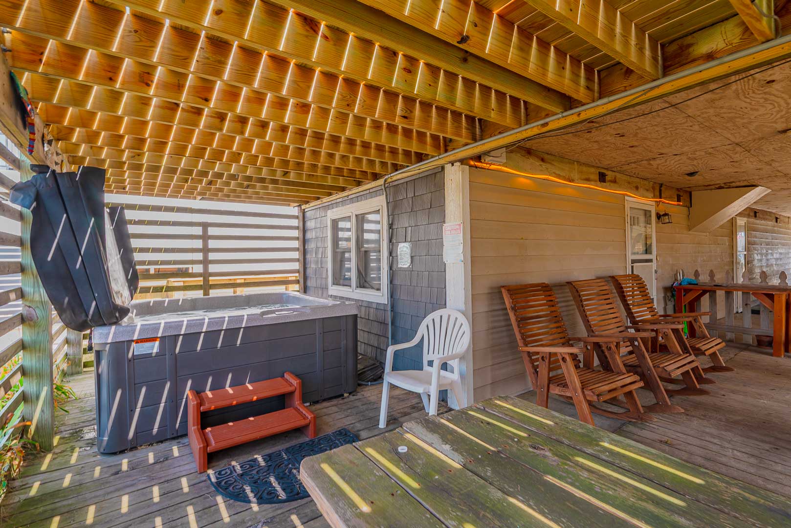 Ground Level: Parking for 4 Cars, Outdoor Covered Sitting Area w/Rockers, Picnic Table, Hot Tub, Rec. Room w/Ping Pong, Foosball, Shuffleboard Table, Half Bath, Laundry Area, Enclosed Outside Shower, & Large Lawn Area.