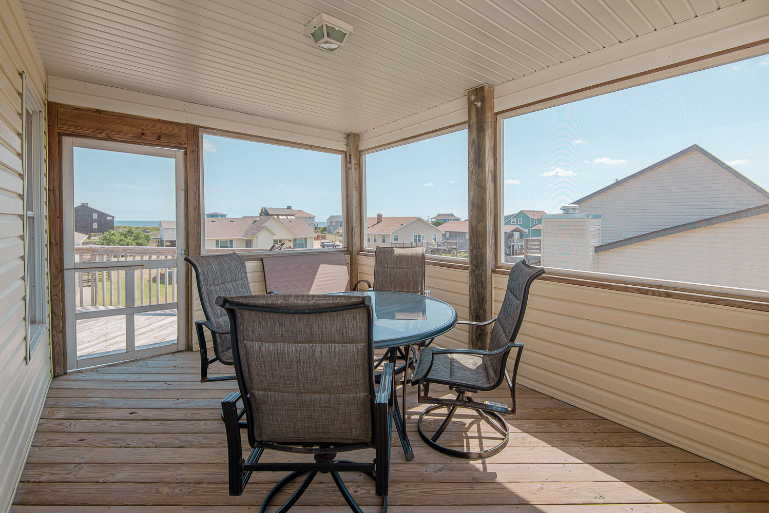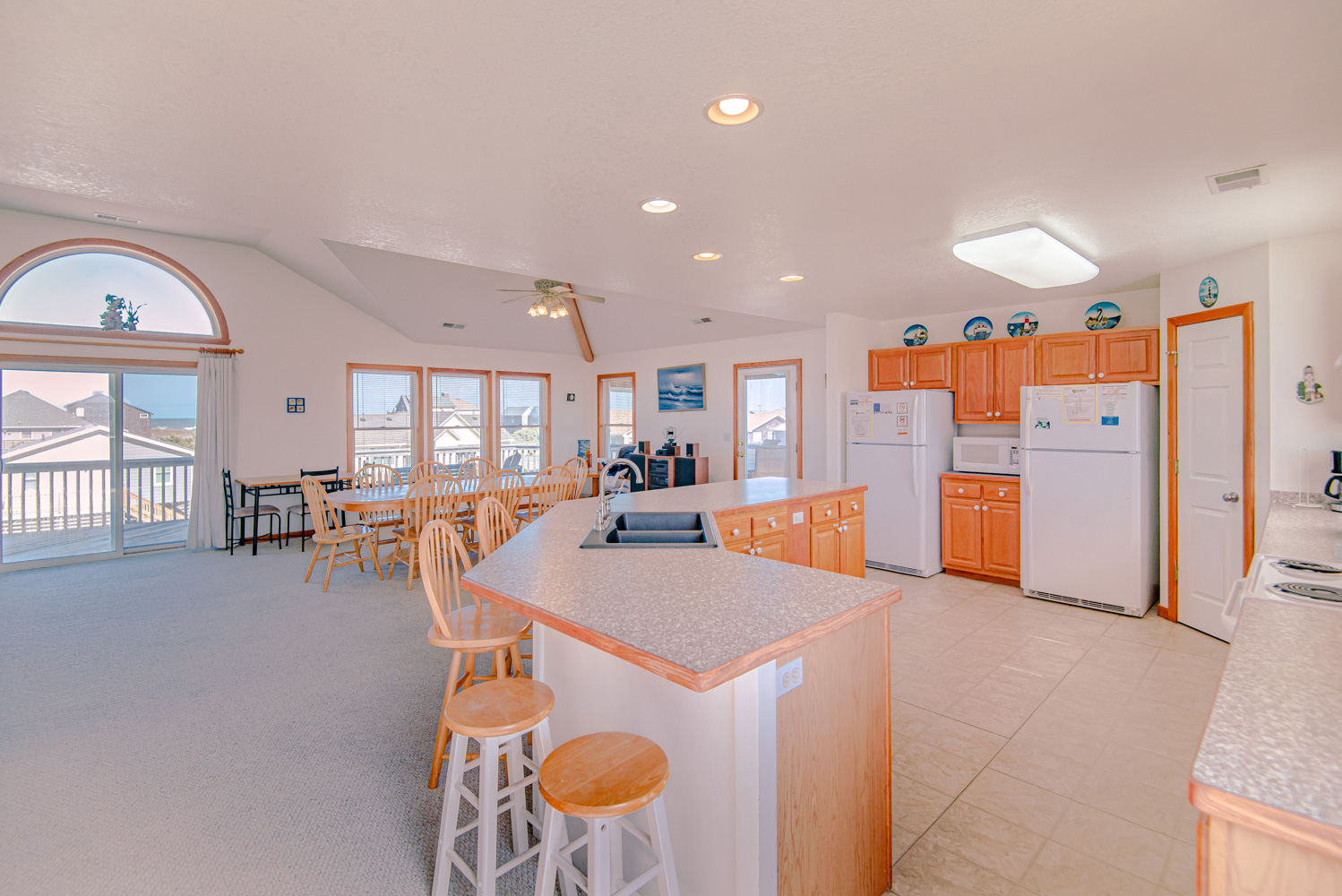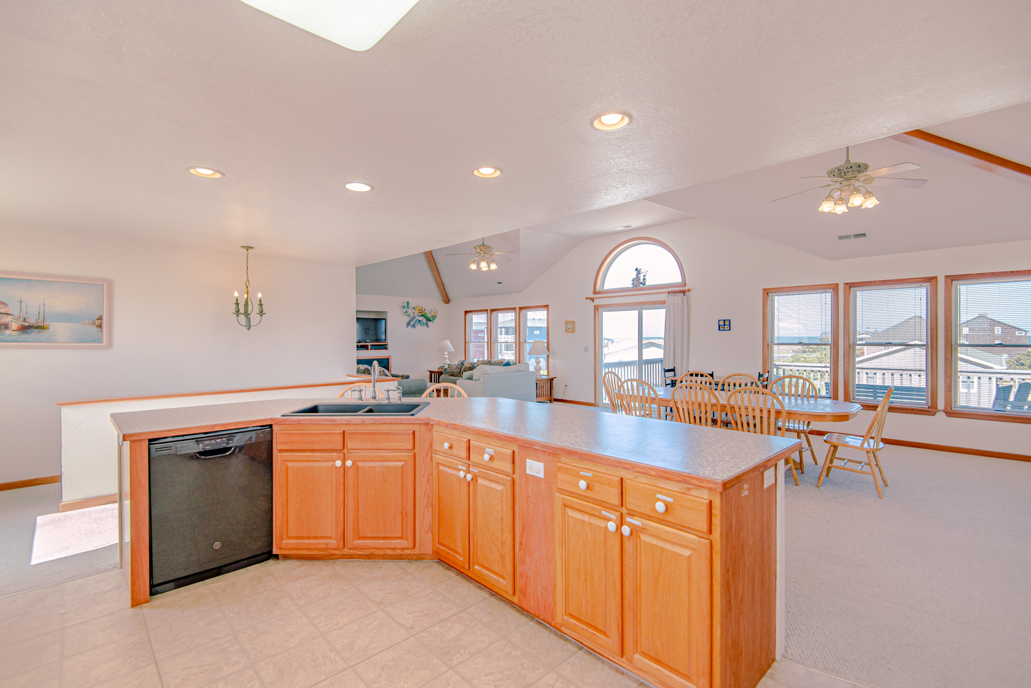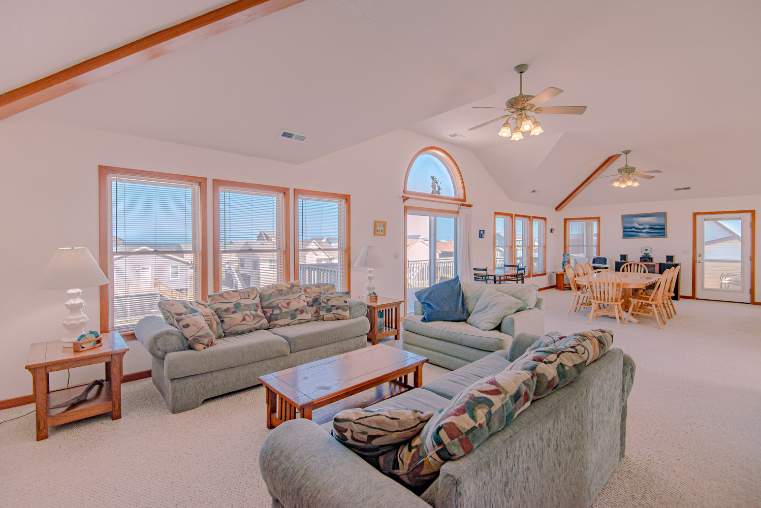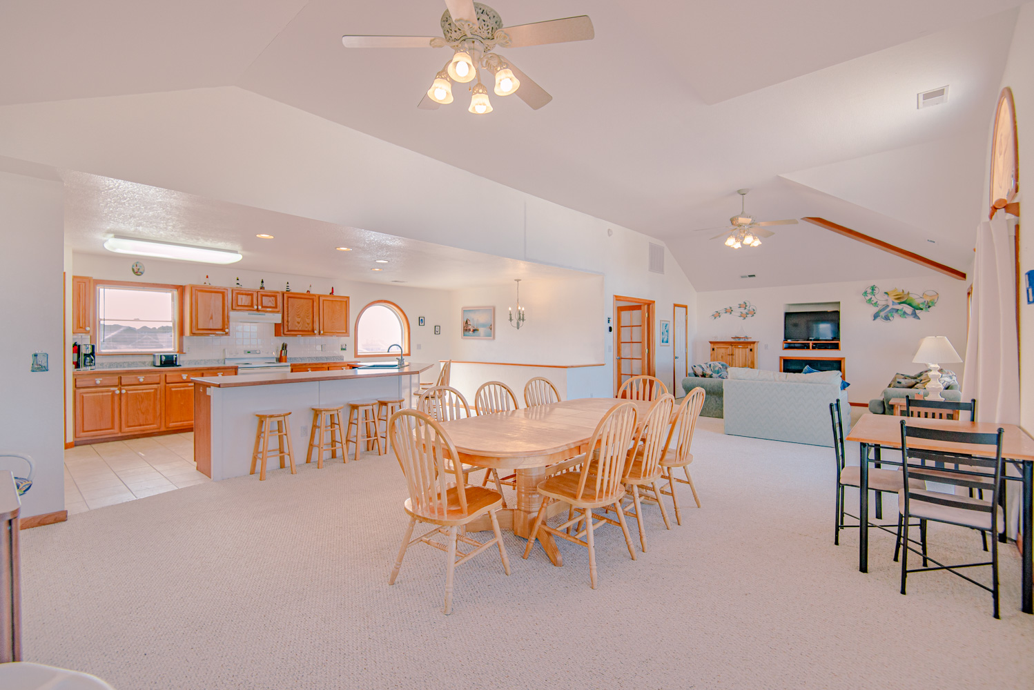 Top Level: Living Area, TV, DVD, 2 Sofa Beds, Library Area w/Sofa Bed, Dining/Kitchen Area, Half Bath, Covered Porch w/Furniture, and Sun Deck w/Great Ocean Views and Deck Furniture.