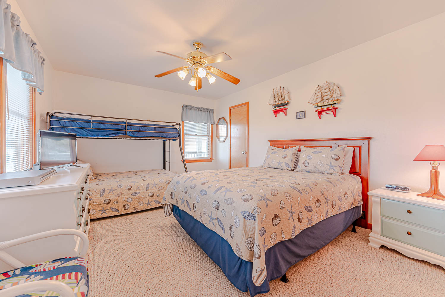 Mid Level: 4 Bedrooms (1 w/King, TV; 2 w/Queens, TVs; 1 w/Queen, Duo Bunk, TV), 2 Full Shared Baths, Laundry Area, and Covered Deck w/Deck Furniture.
