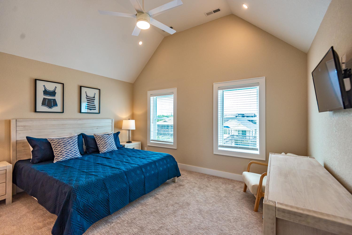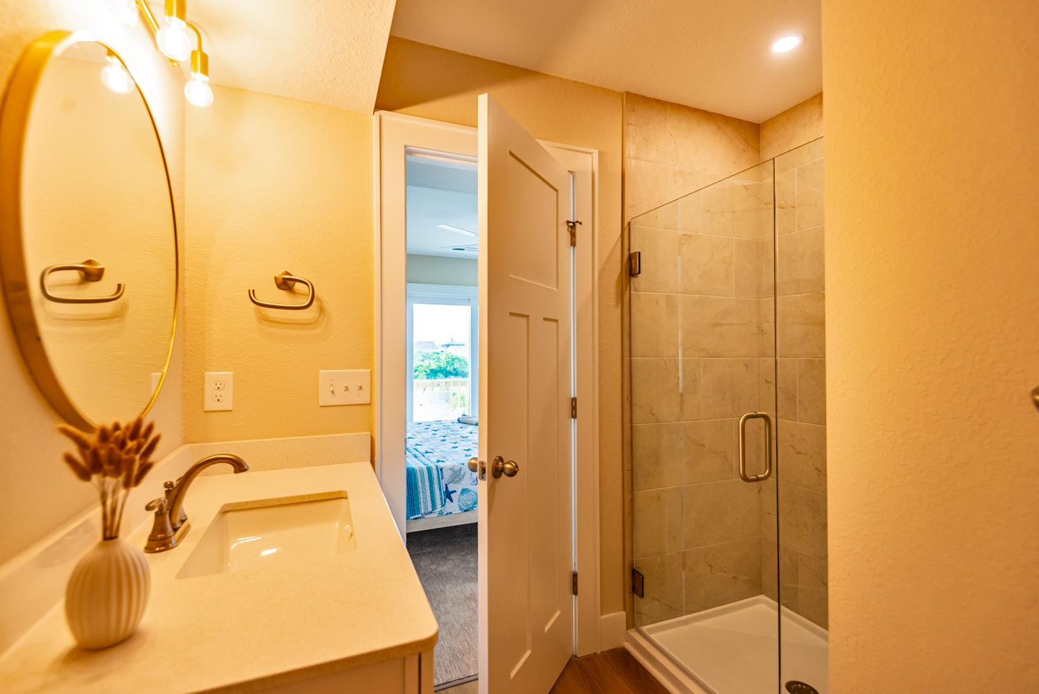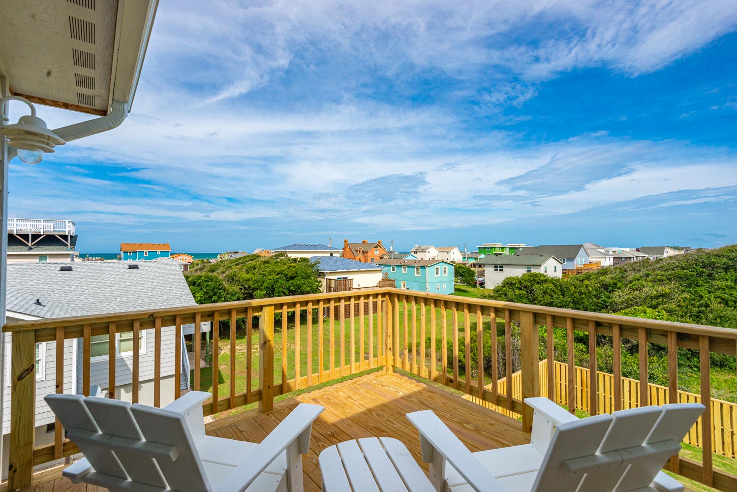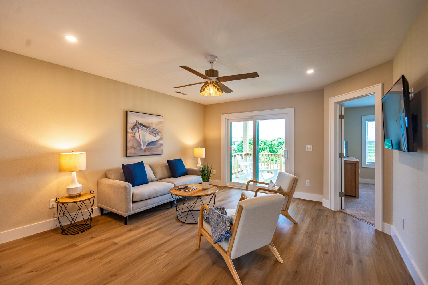 Top Level: Living Area, 65" Flat Screen TV, Access to Sun Deck w/Deck Furniture and Horizon Ocean Views, Fully Equipped Kitchen w/Granite Counters, Stainless Steel Appliances, Island Bar w/Seating for Four (4), Dining Area w/Seating for Six (6), Half Bath, Private Suite w/King, 50" TV, Full Bath w/Dual Vanity, and Walk-In Shower.