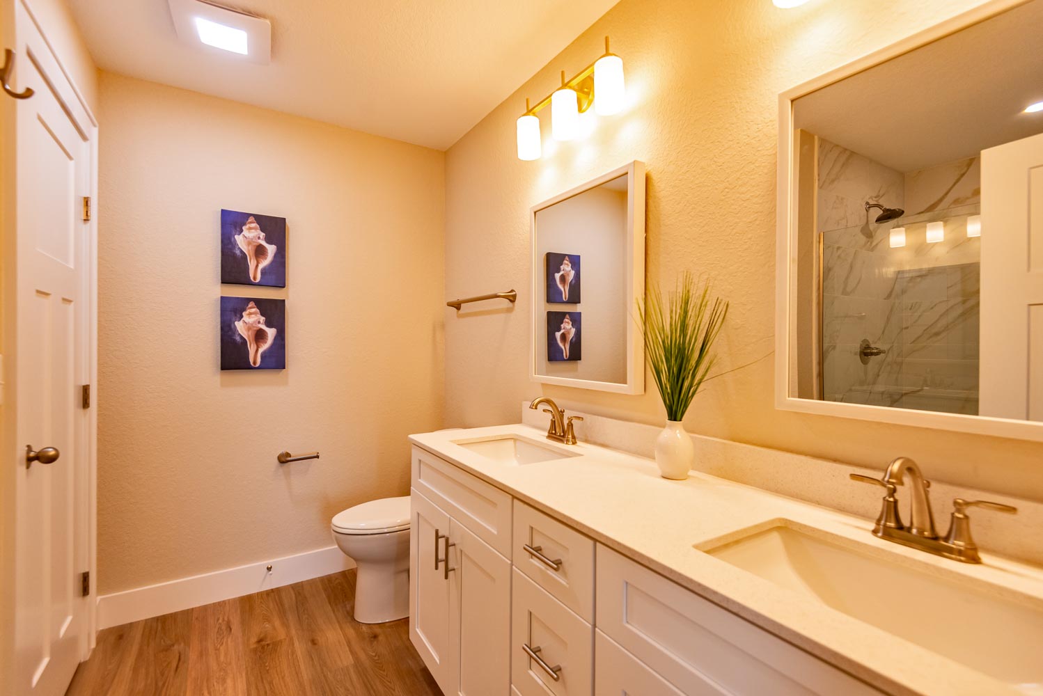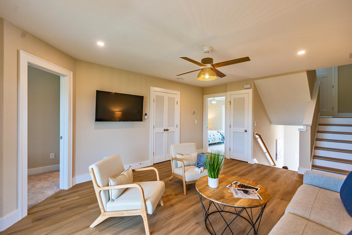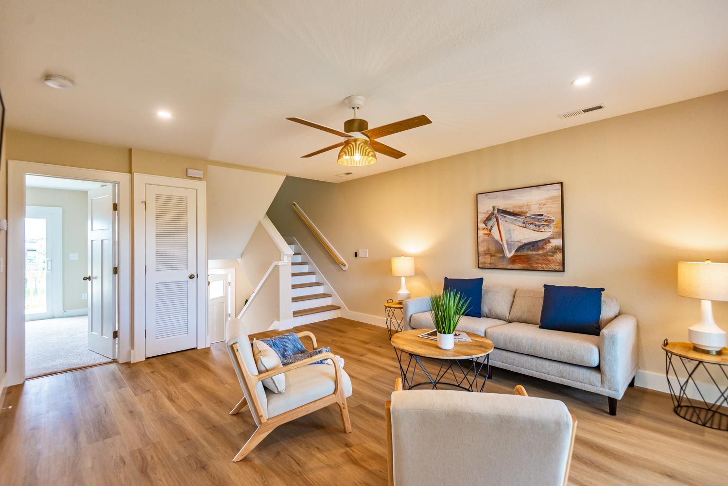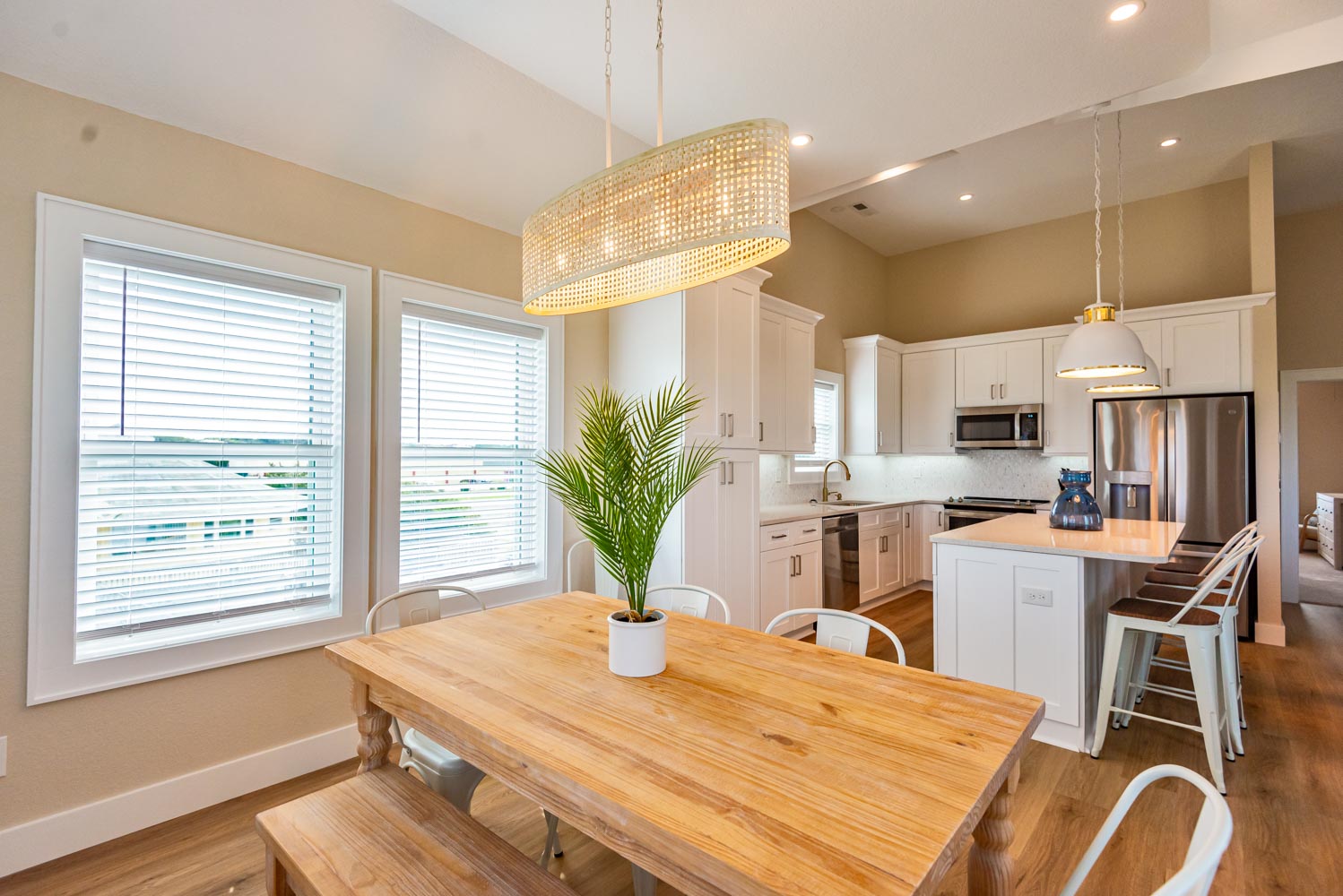 Top Level: Living Area, 65" Flat Screen TV, Access to Sun Deck w/Deck Furniture and Horizon Ocean Views, Fully Equipped Kitchen w/Granite Counters, Stainless Steel Appliances, Island Bar w/Seating for Four (4), Dining Area w/Seating for Six (6), Half Bath, Private Suite w/King, 50" TV, Full Bath w/Dual Vanity, and Walk-In Shower.