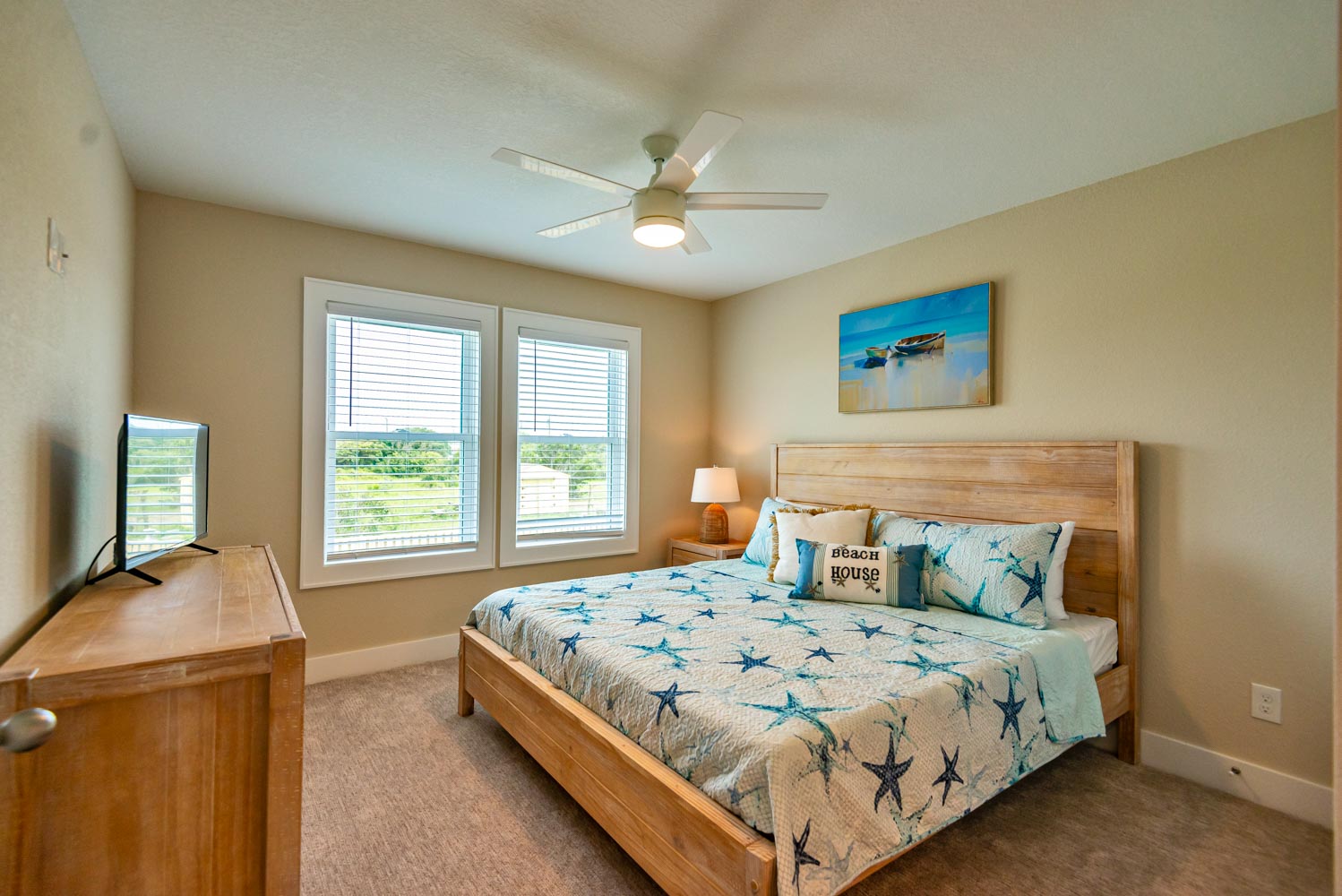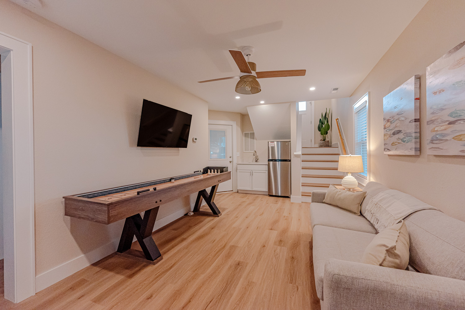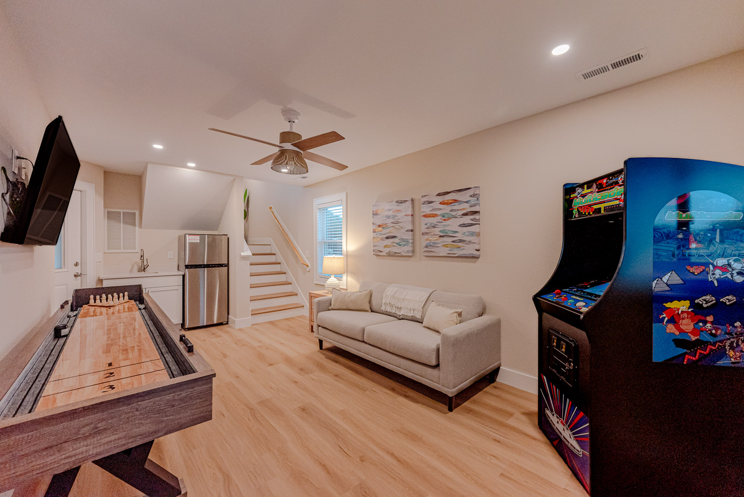 Ground Level: Parking for 4 Cars, Covered Entry, 2 Bedrooms (1 w/King, TV, Ceiling Fan, 1 w/Built-In Bunk Set, TV), Full Shared Hall Bath w/Tiled Walk-In Shower, Rec. Room w/Large Flat Screen TV, Shuffleboard, Video Arcade Machine, Wet Bar, Full Size Refrigerator, Access to Covered Patio Area w/Sitting Area, Gas Grill, Outside Shower, Large Fenced Yard w/Private Heated Swimming Pool (Can be Heated for $300.00 Per Week, Plus Tax, Please Bear in Mind That Pool Temperature is Subject to Outside Temperatures and Conditions) and Hot Tub.