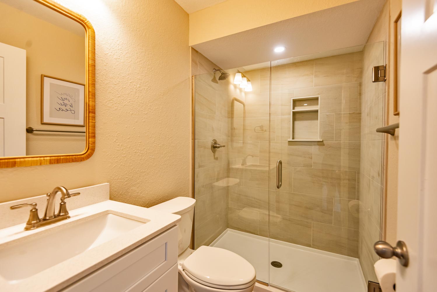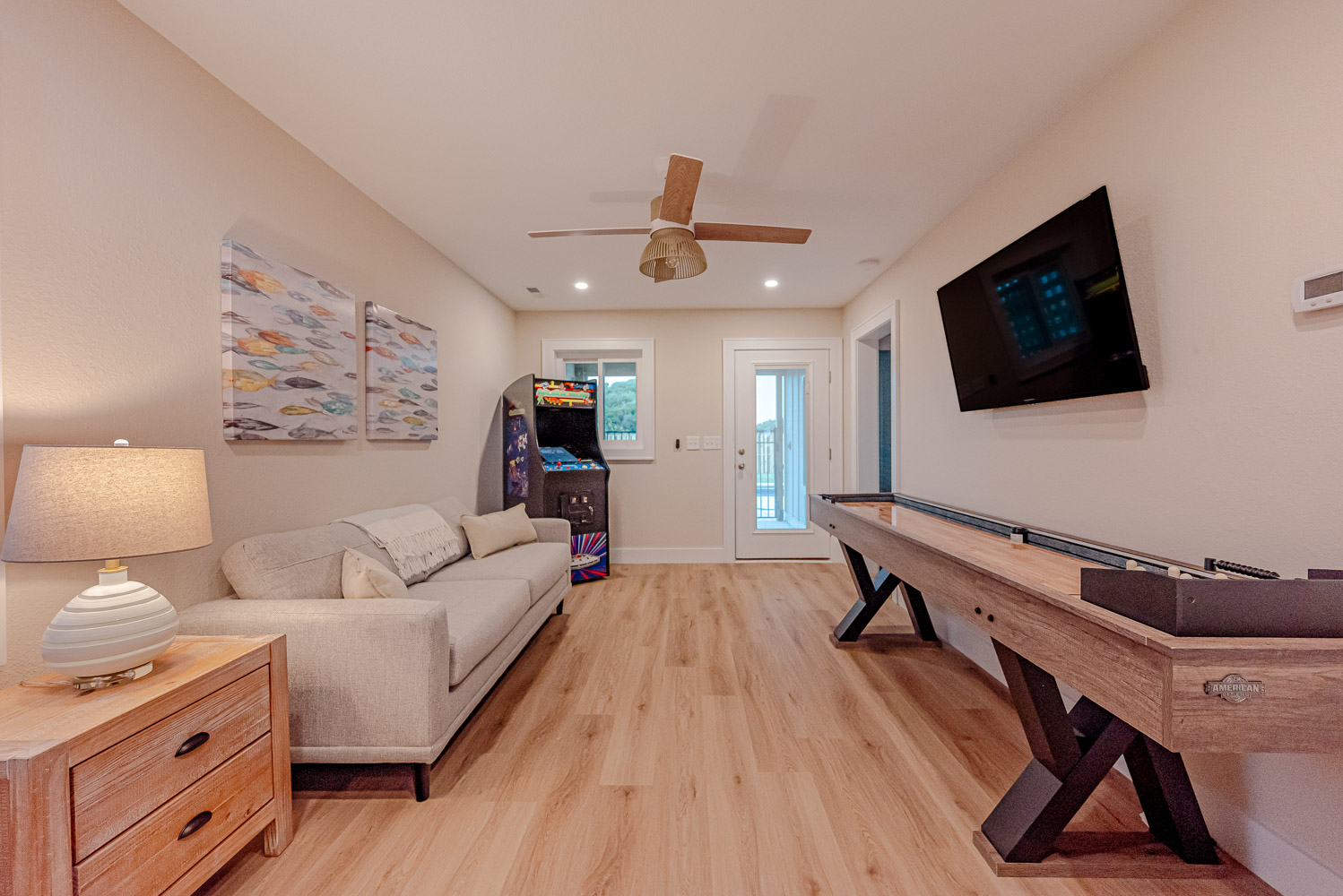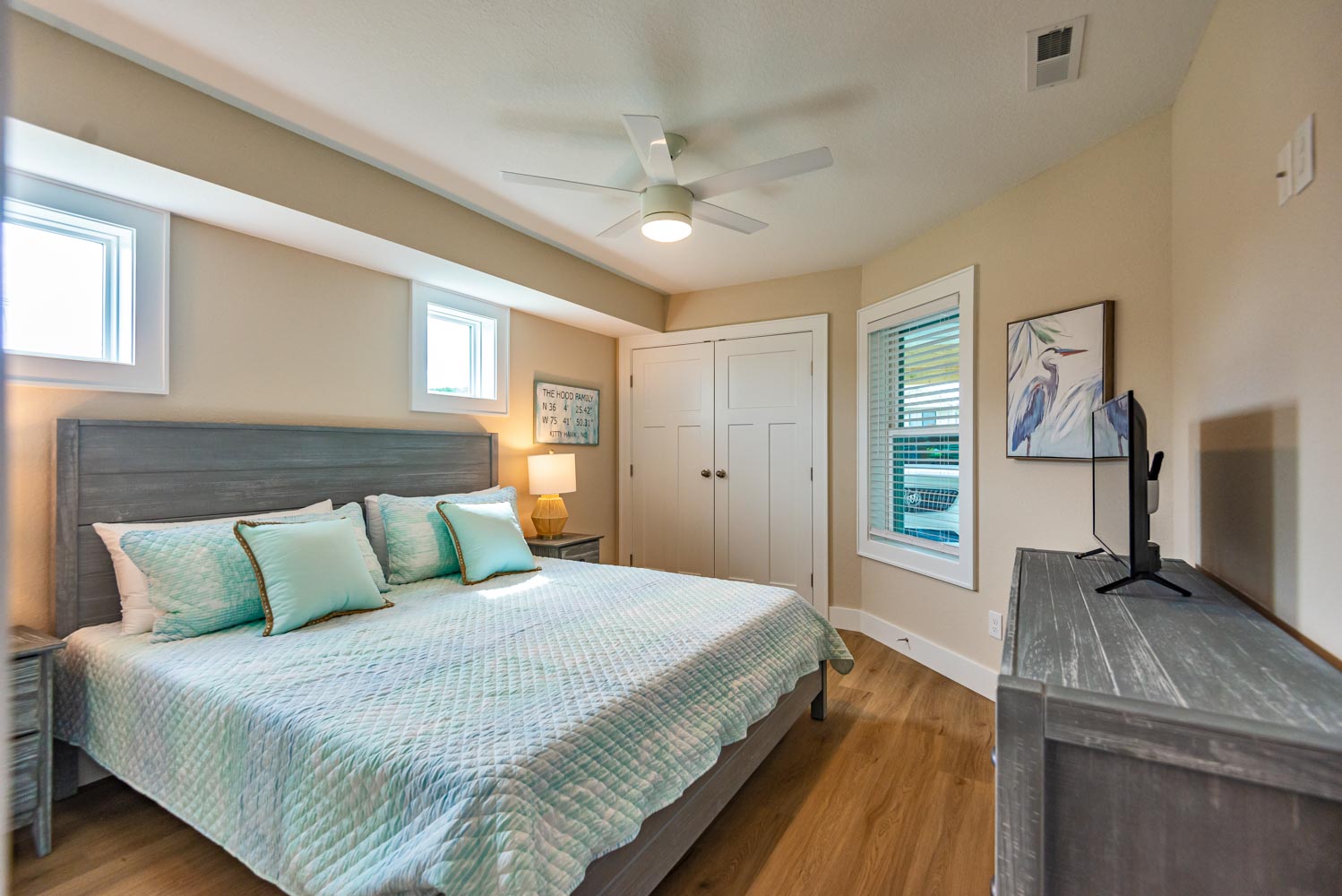 Ground Level: Parking for 4 Cars, Covered Entry, 2 Bedrooms (1 w/King, TV, Ceiling Fan, 1 w/Built-In Bunk Set, TV), Full Shared Hall Bath w/Tiled Walk-In Shower, Rec. Room w/Large Flat Screen TV, Shuffleboard, Video Arcade Machine, Wet Bar, Full Size Refrigerator, Access to Covered Patio Area w/Sitting Area, Gas Grill, Outside Shower, Large Fenced Yard w/Private Heated Swimming Pool (Can be Heated for $300.00 Per Week, Plus Tax, Please Bear in Mind That Pool Temperature is Subject to Outside Temperatures and Conditions) and Hot Tub.