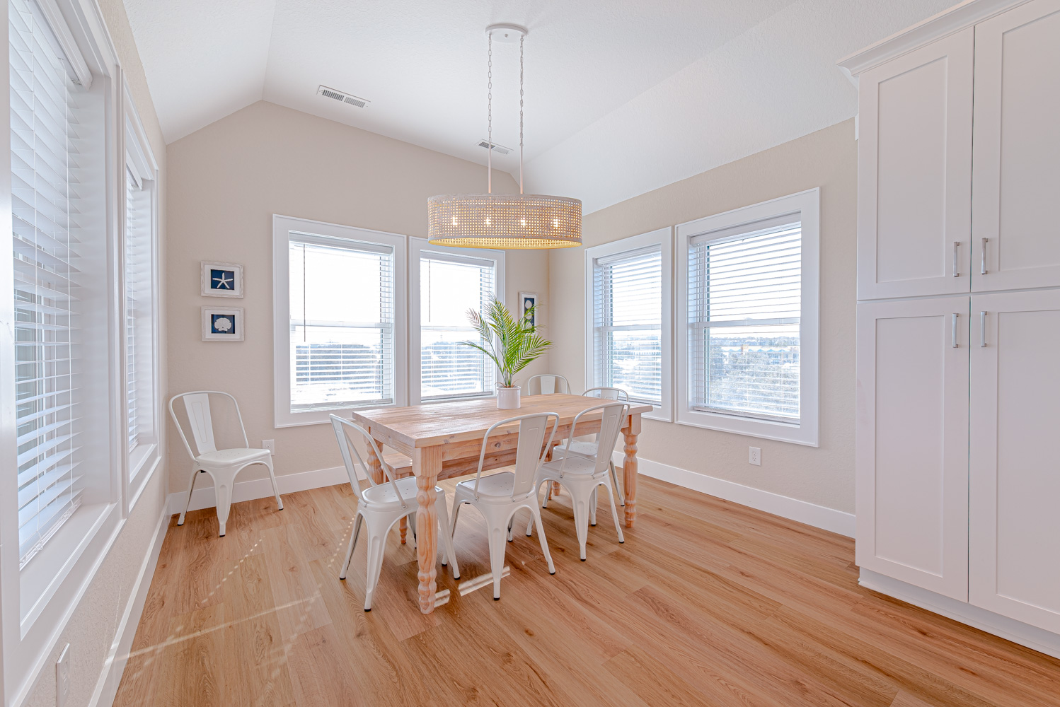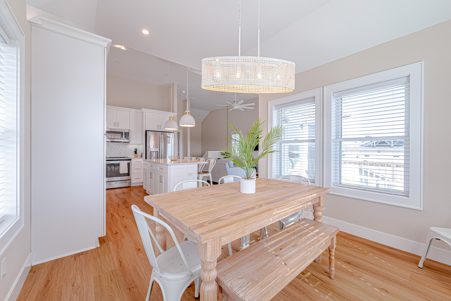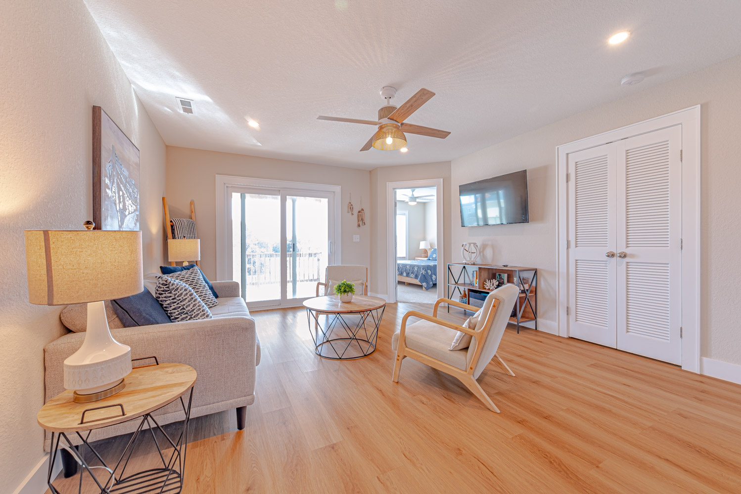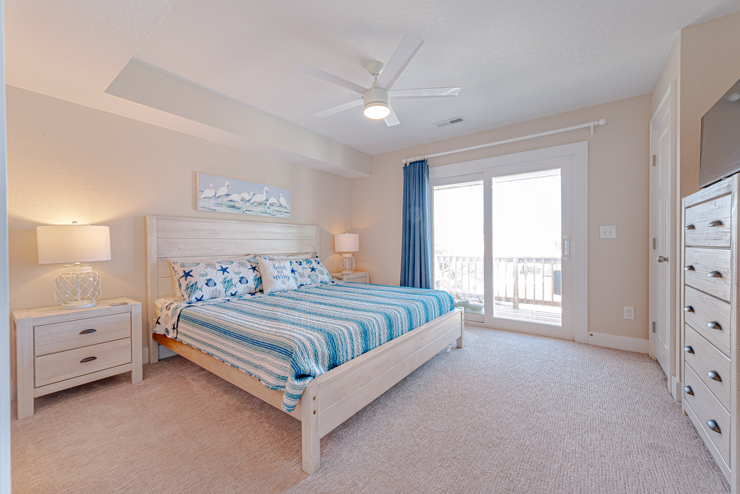 Top Level: Living Area, 65" Flat Screen TV, Access to Sun Deck w/Deck Furniture and Horizon Ocean Views, Fully Equipped Kitchen w/Granite Counters, Stainless Steel Appliances, Island Bar w/Seating for Four (4), Dining Area w/Seating for Six (6), Half Bath, Private Suite w/King, 50" TV, Full Bath w/Dual Vanity, and Walk-In Shower.