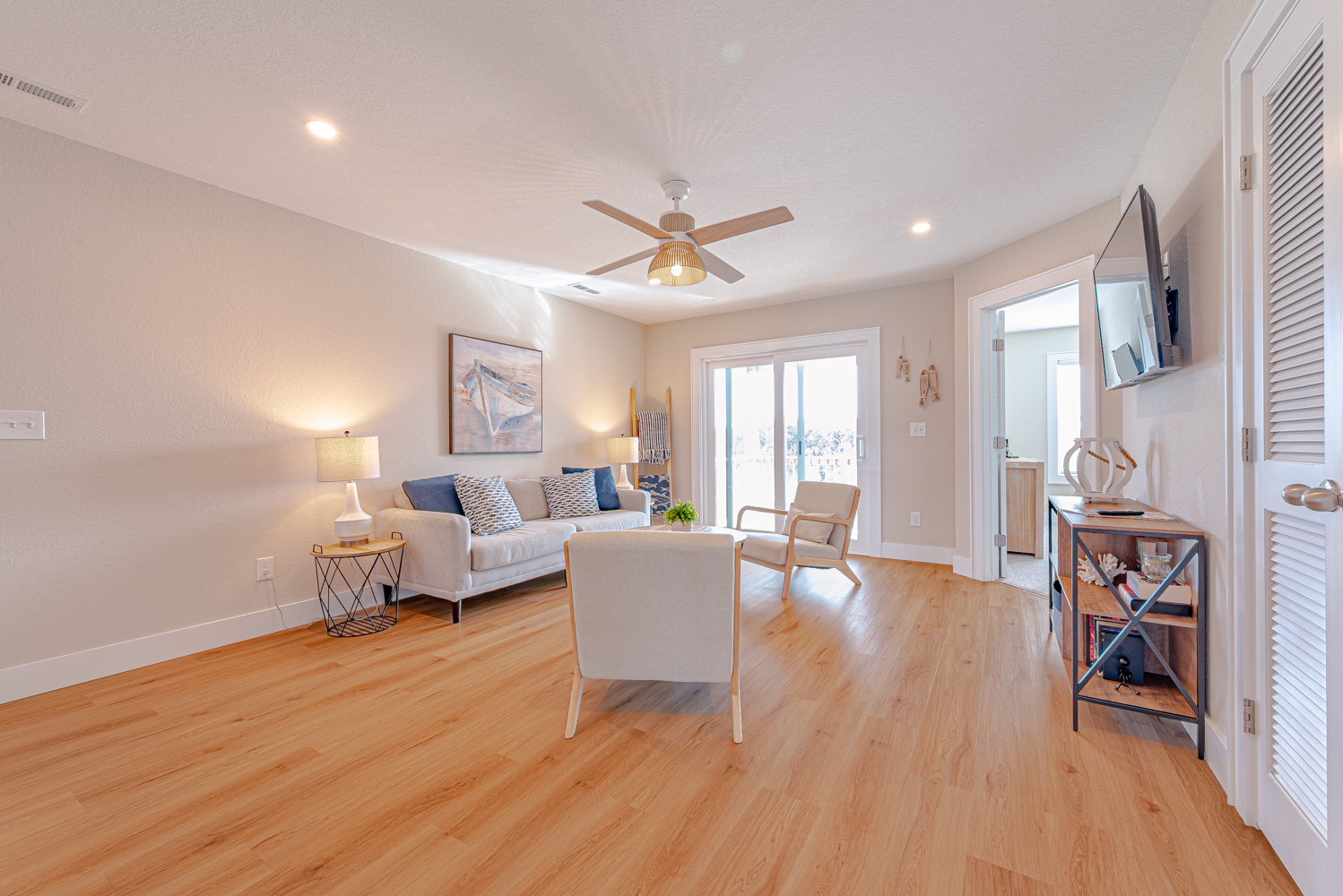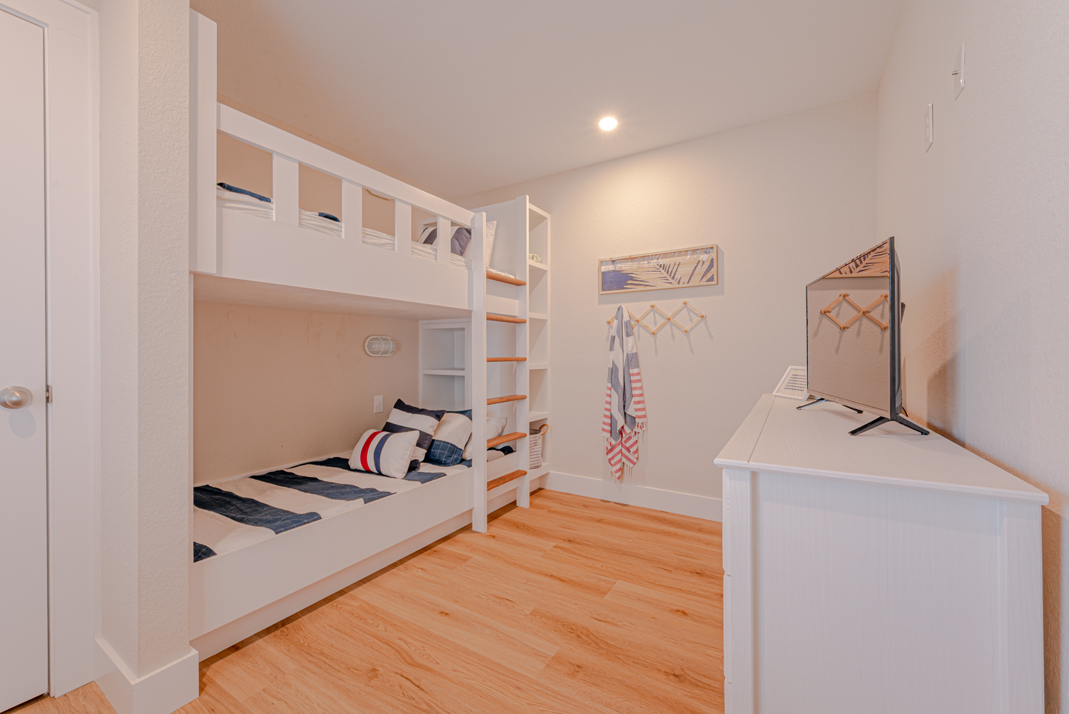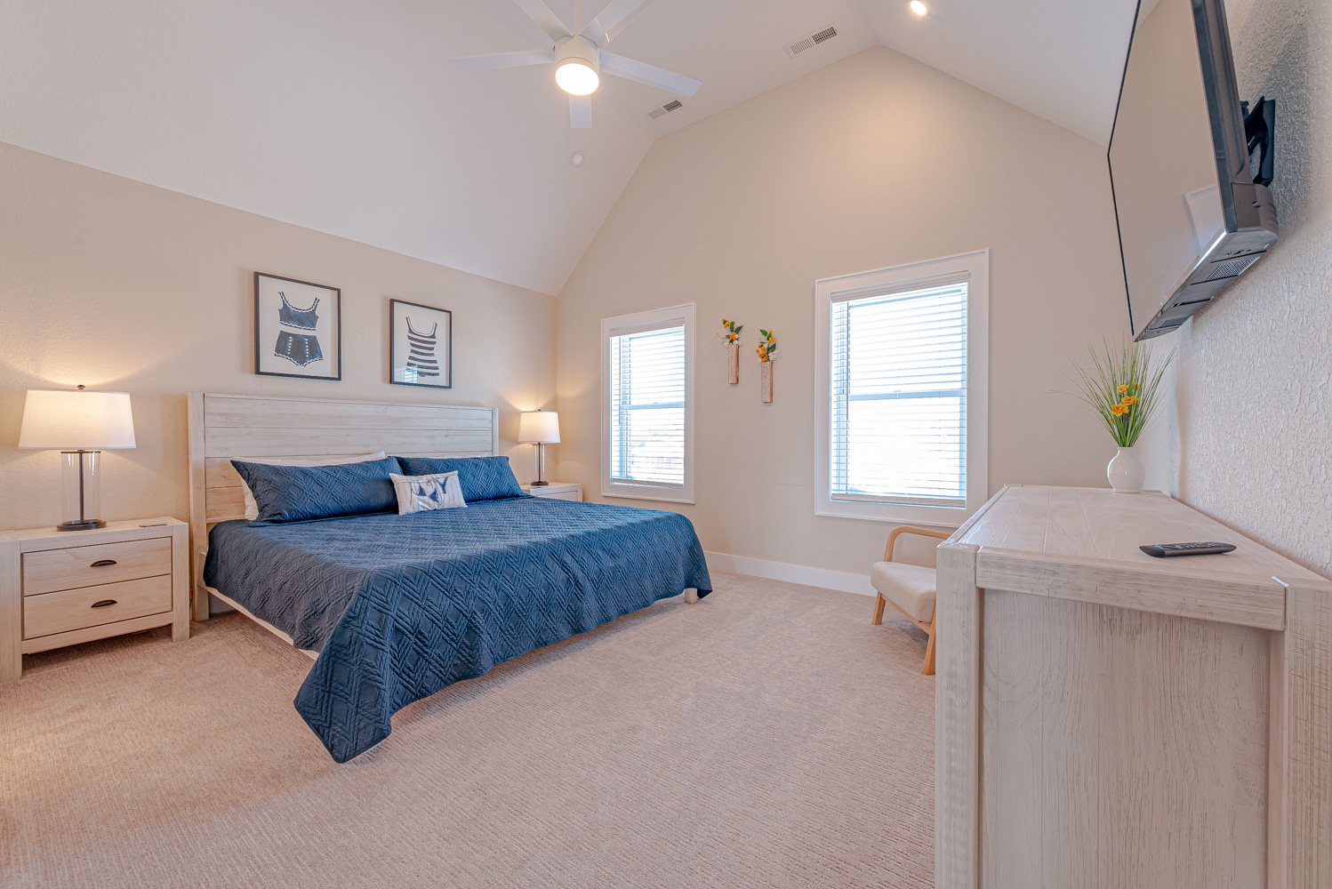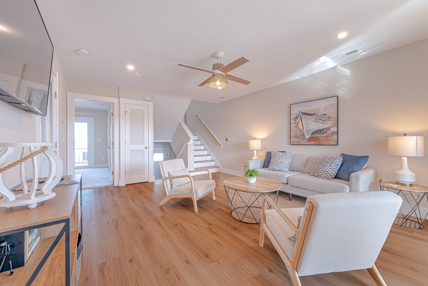 Top Level: Living Area, 65" Flat Screen TV, Access to Sun Deck w/Deck Furniture and Horizon Ocean Views, Fully Equipped Kitchen w/Granite Counters, Stainless Steel Appliances, Island Bar w/Seating for Four (4), Dining Area w/Seating for Six (6), Half Bath, Private Suite w/King, 50" TV, Full Bath w/Dual Vanity, and Walk-In Shower.