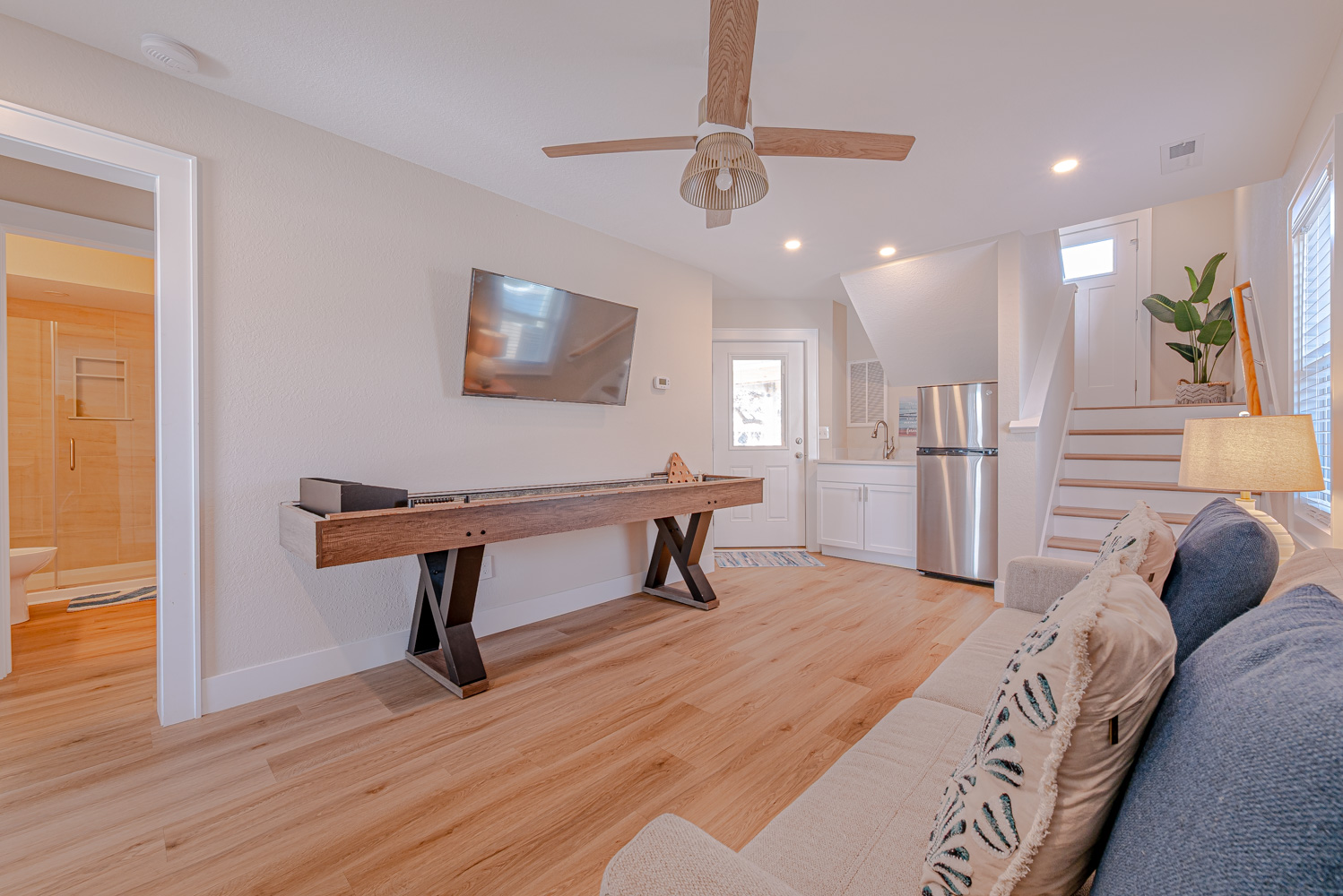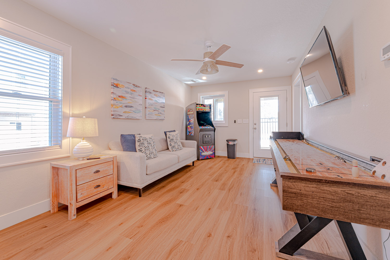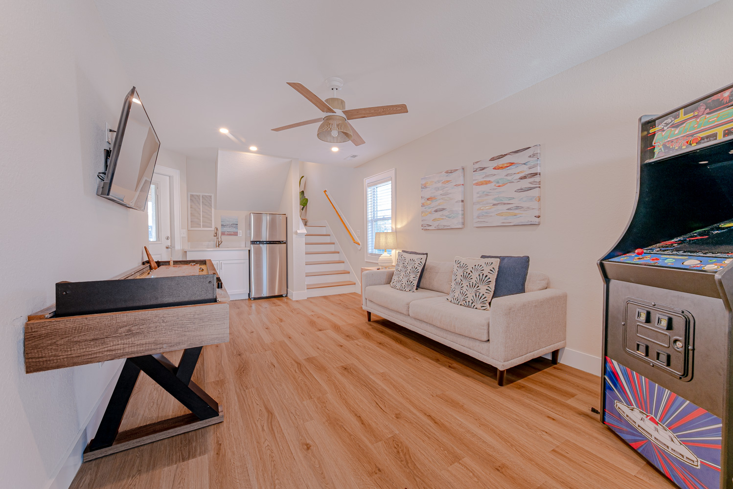 Ground Level: Parking for 4 Cars, Covered Entry, 2 Bedrooms (1 w/King, TV, Ceiling Fan, 1 w/Built-In Bunk Set, TV), Full Shared Hall Bath w/Tiled Walk-In Shower, Rec. Room w/Large Flat Screen TV, Shuffleboard, Video Arcade Machine, Wet Bar, Full Size Refrigerator, Access to Covered Patio Area w/Sitting Area, Gas Grill, Outside Shower, Large Fenced Yard w/Private Heated Swimming Pool (Can be Heated for $300.00 Per Week, Plus Tax, Please Bear in Mind That Pool Temperature is Subject to Outside Temperatures and Conditions) and Hot Tub.